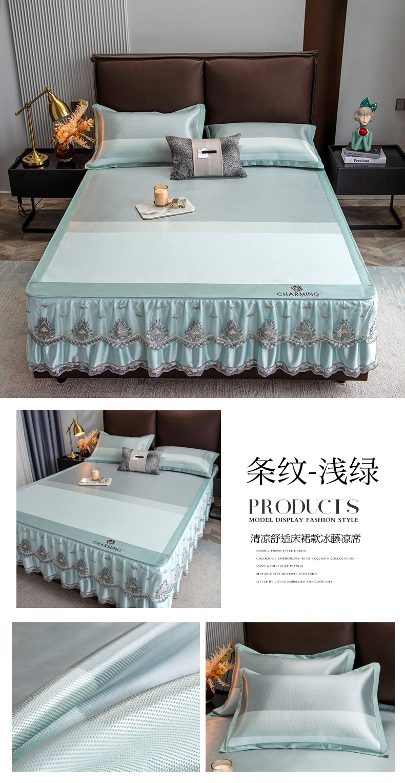 商品名称:印季家纺 2026新款清凉舒适拼色加密冰藤床裙款凉席 条纹-浅绿