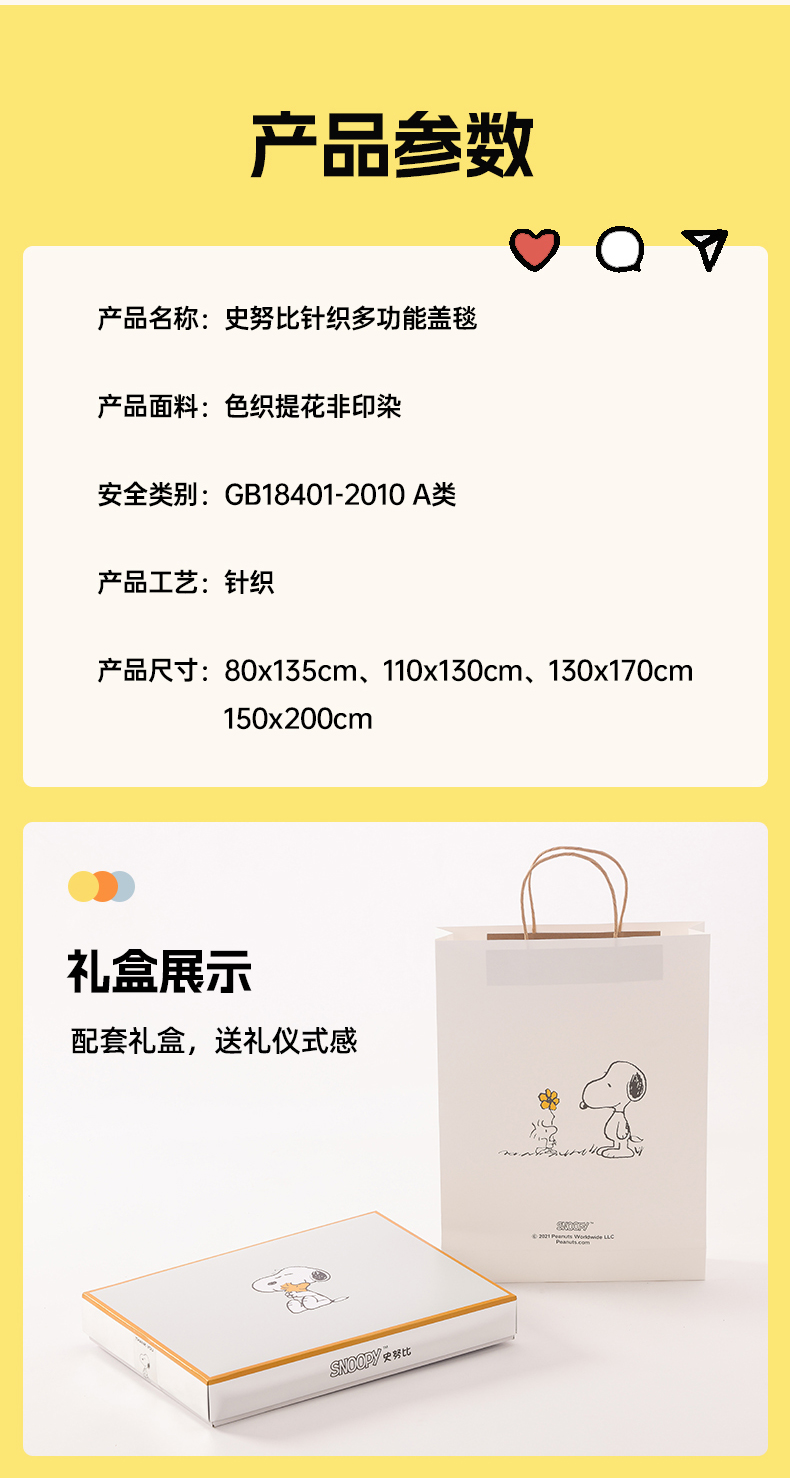 商品名称:栩裕纺织 2026新款史努比SNOOPY正版授权独家针织毯披肩膝盖毯儿童毯多功能盖毯送礼礼品终端控价 礼盒中号