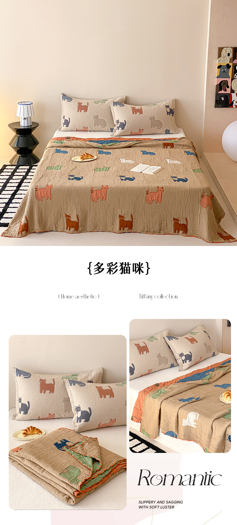 (总)麻依 2026新款软萌纱布床盖三件套系列,斑点小猫,博美,豆豆企鹅,懒床小狗,乐园小象,毛绒小狗,胖胖猫,胖胖企鹅,桃心KT,玩耍小咪,香蕉小猫,杂技萌宠,组合