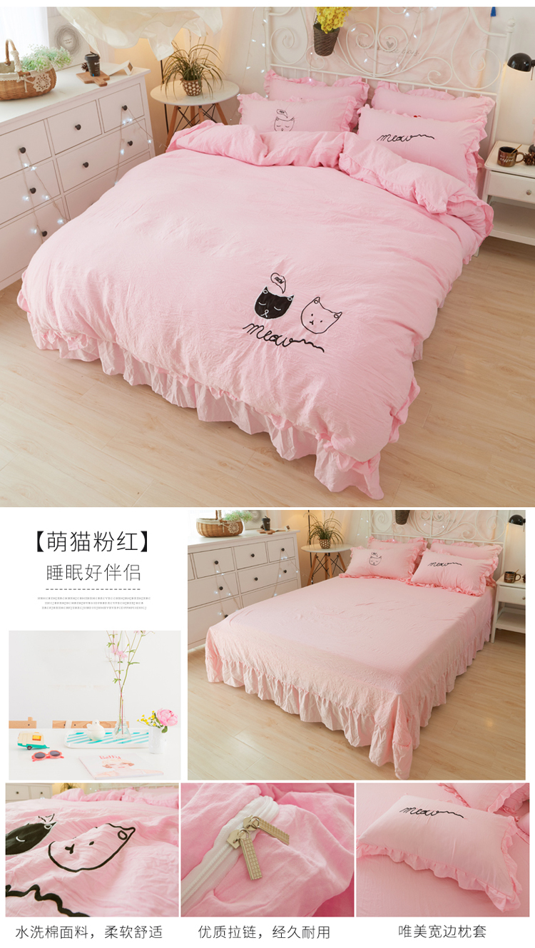 简爱家纺 2025新款水洗棉绣花四件套床单款 萌猫粉红