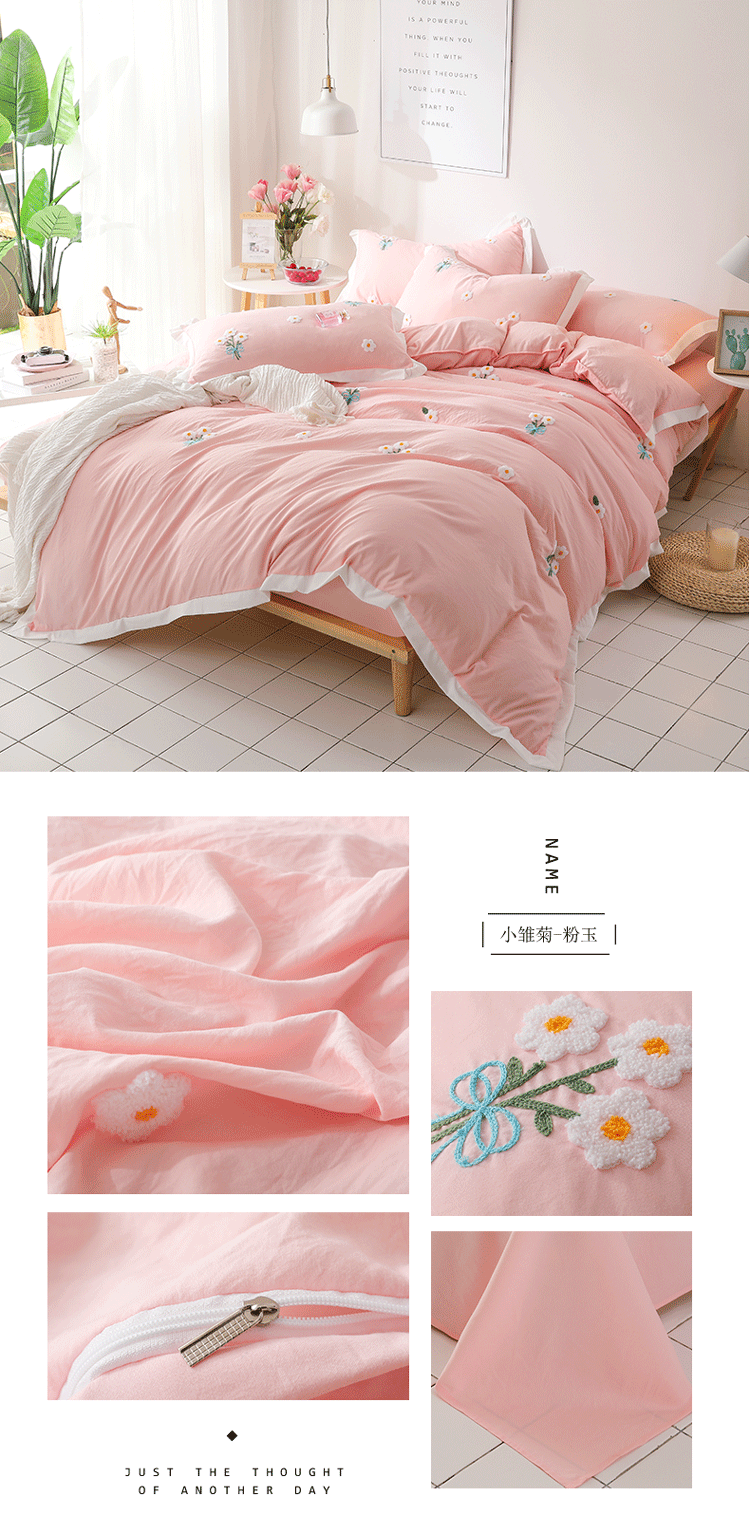 (总)雨菲家纺2025 网红爆款水洗棉小雏菊毛巾绣拼角宽边花边四件套,粉玉色,姜黄色,浅绿色,浅紫色,小橘子-白加粉