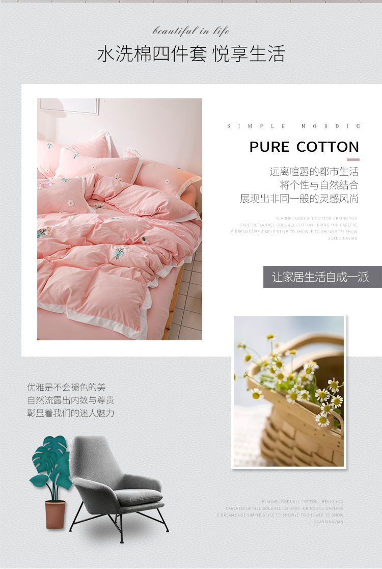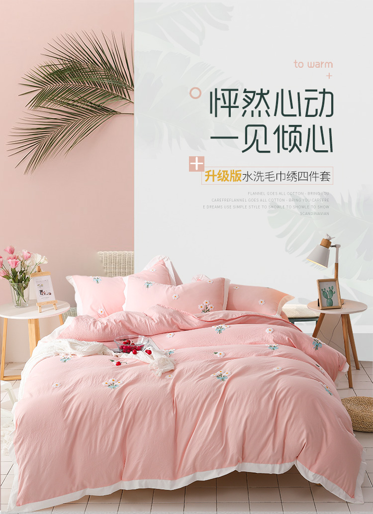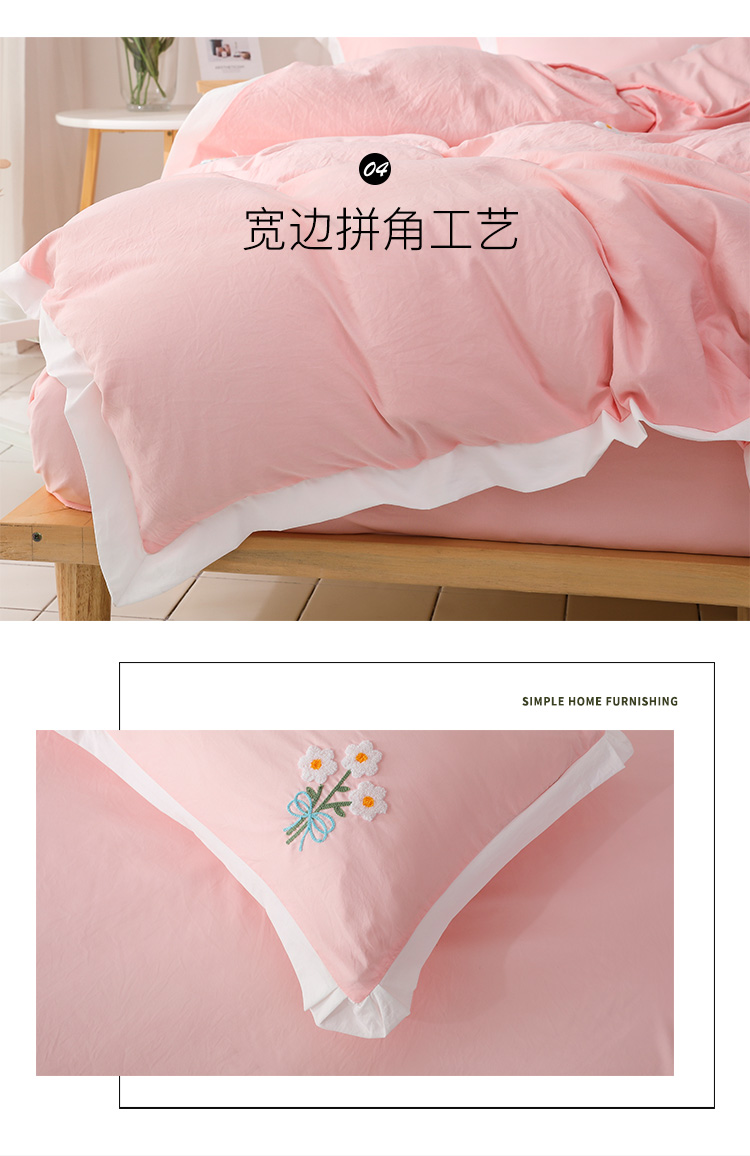 雨菲家纺 网红爆款水洗棉小雏菊毛巾绣拼角宽边花边四件套