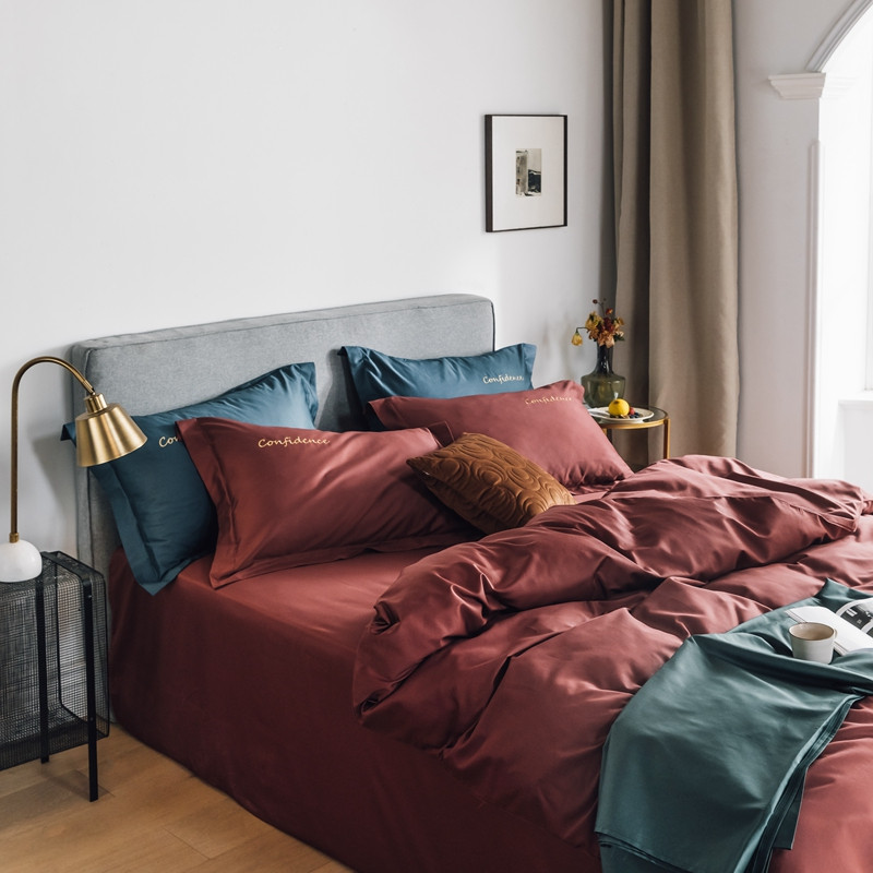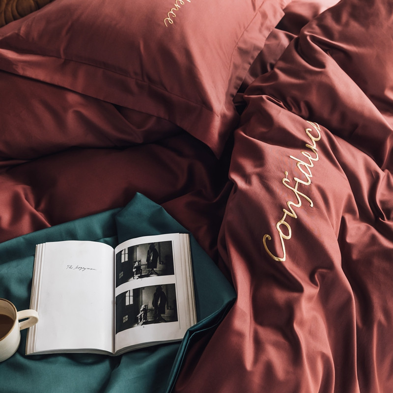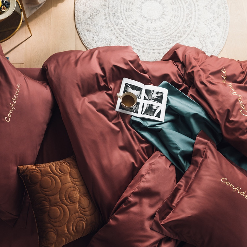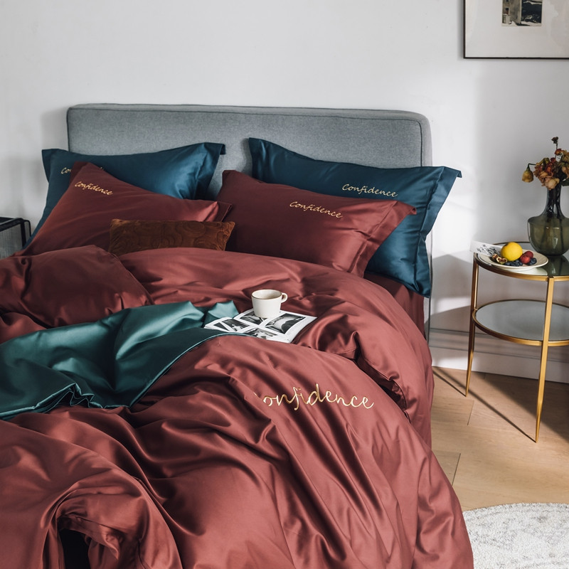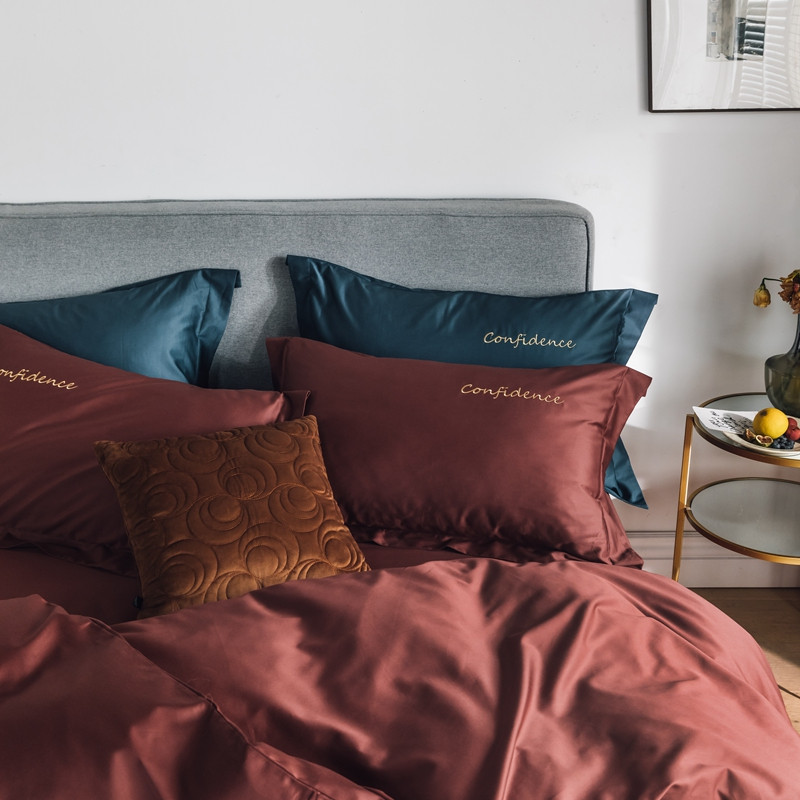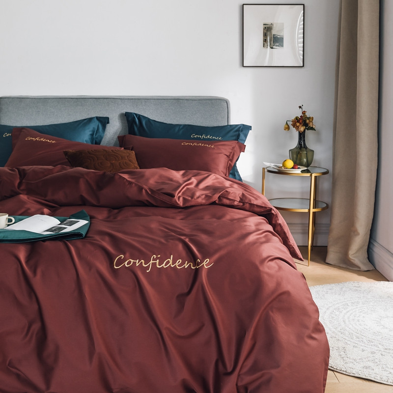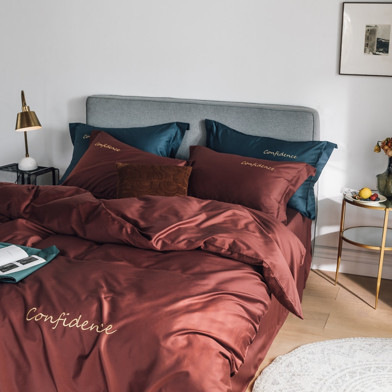 柚子家纺 100支贡缎澳棉绣花四件套图二 拾色铁锈红