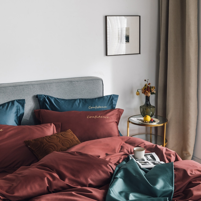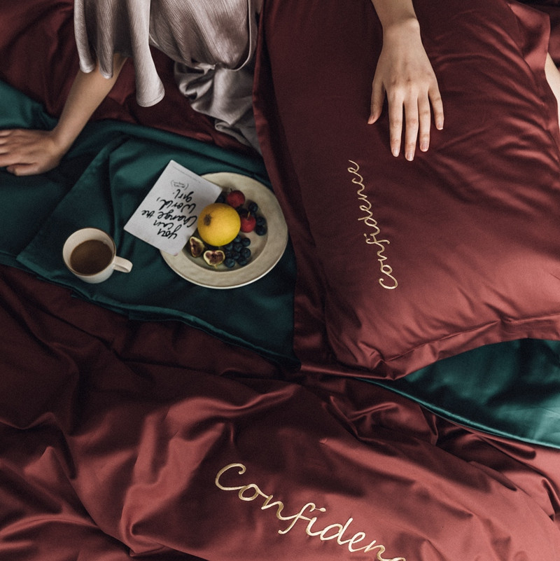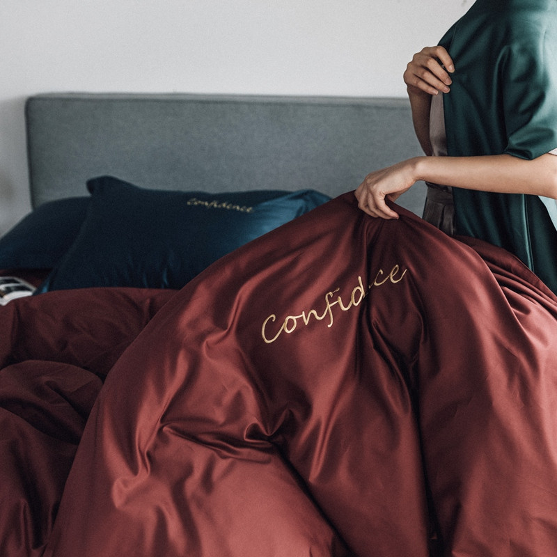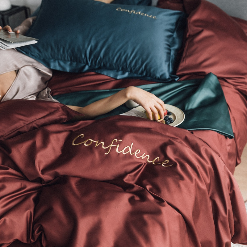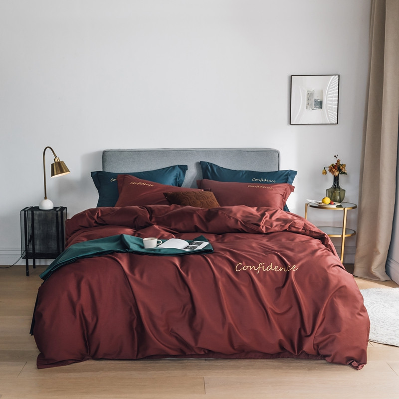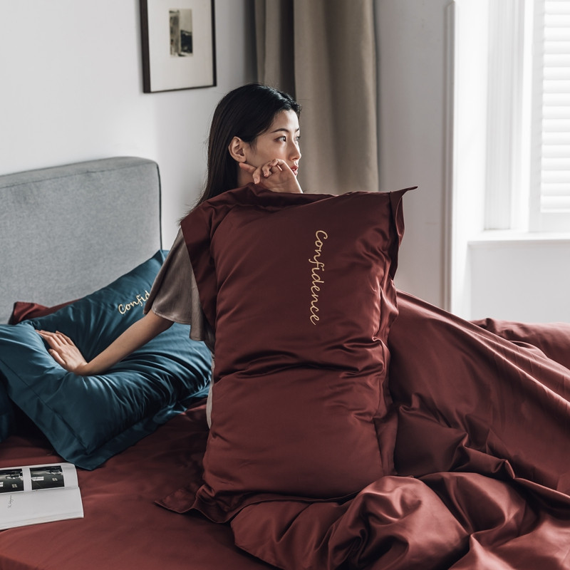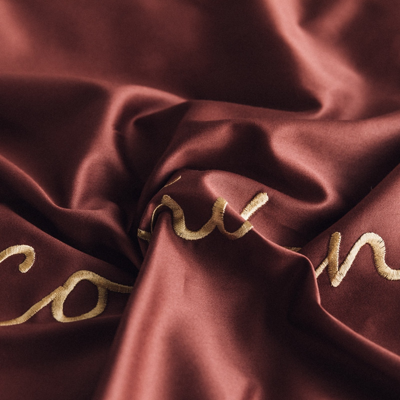 柚子家纺 100支贡缎澳棉绣花四件套图二 拾色铁锈红