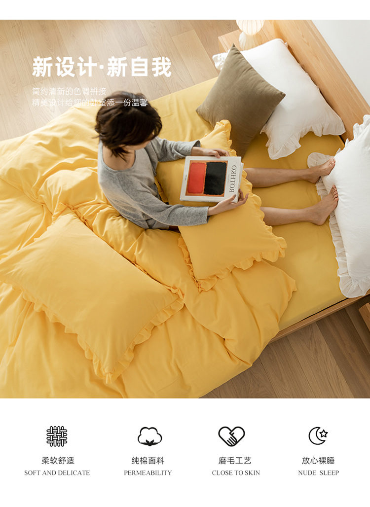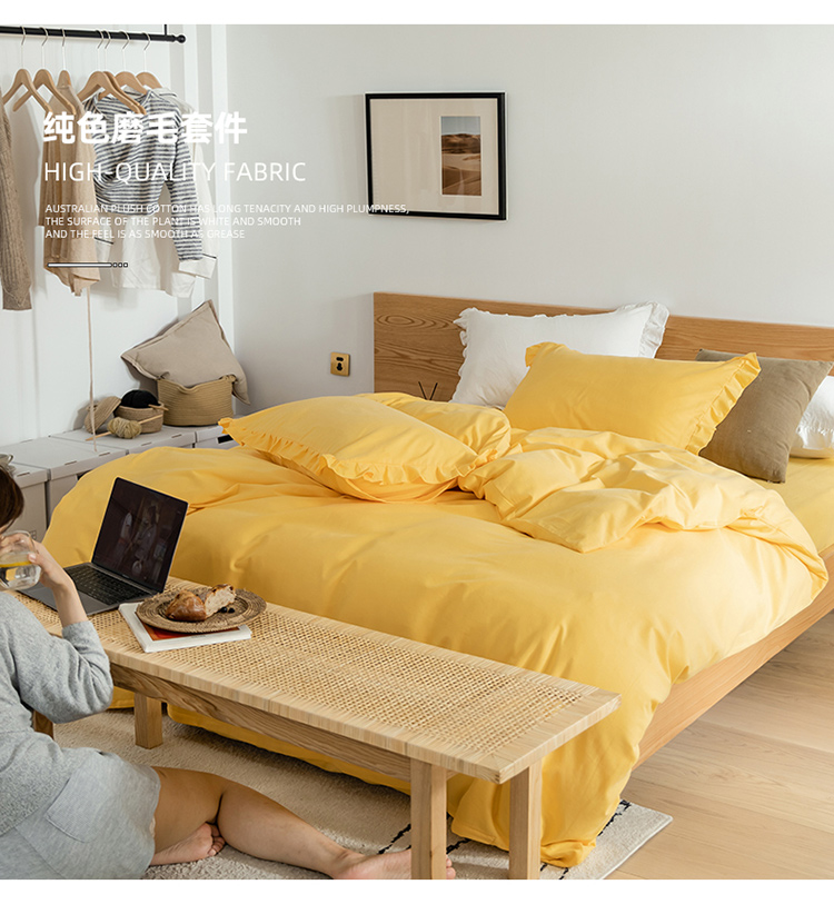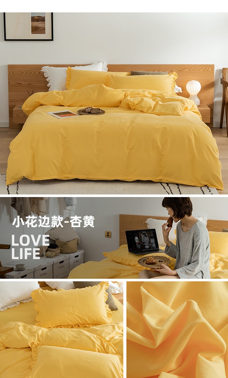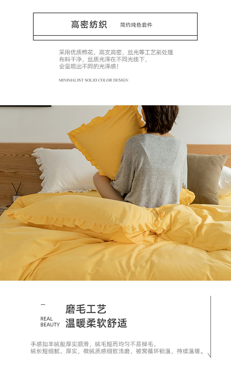 当前位置: 91家纺网 > 商品网购 > 床品套件 > 四件套 > 普通磨毛四件套 > 窝米 2020新款40s纯色磨毛四件套花边系列 杏黄
