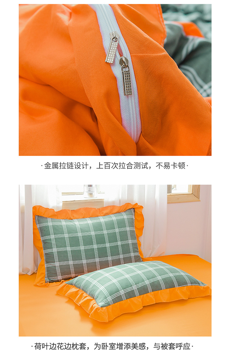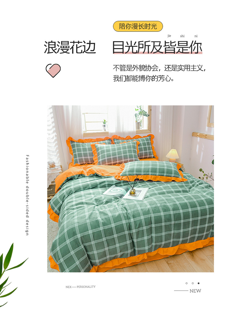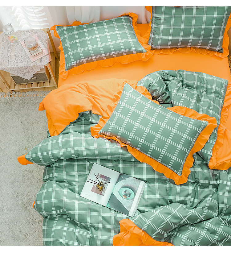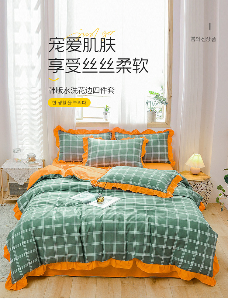 绒兔兔 2021韩版水洗棉时尚格四件套 绿橙