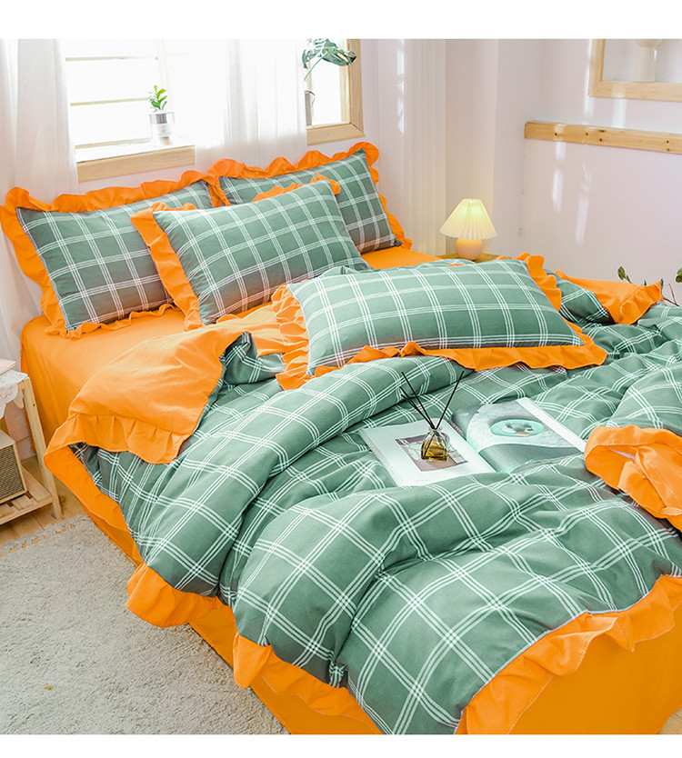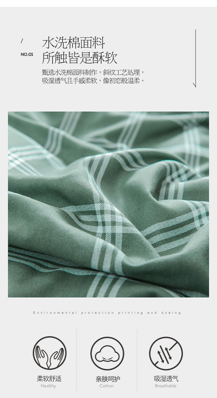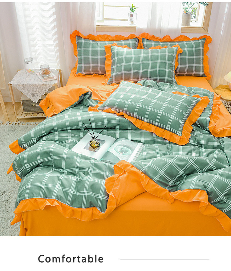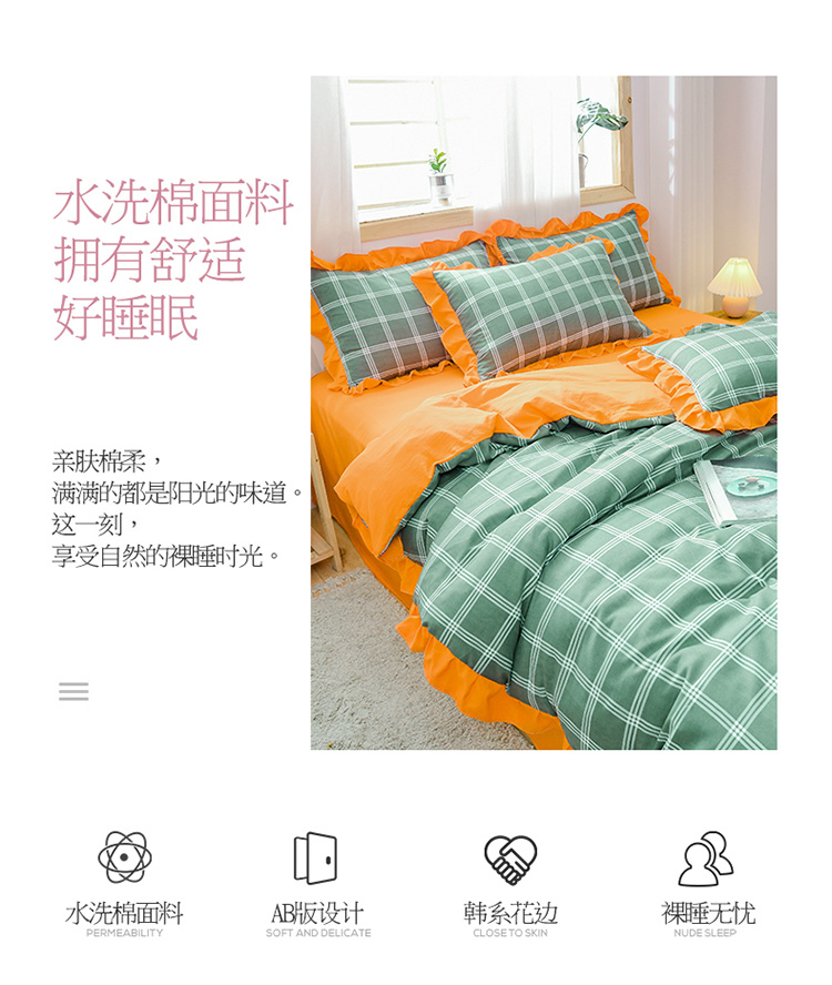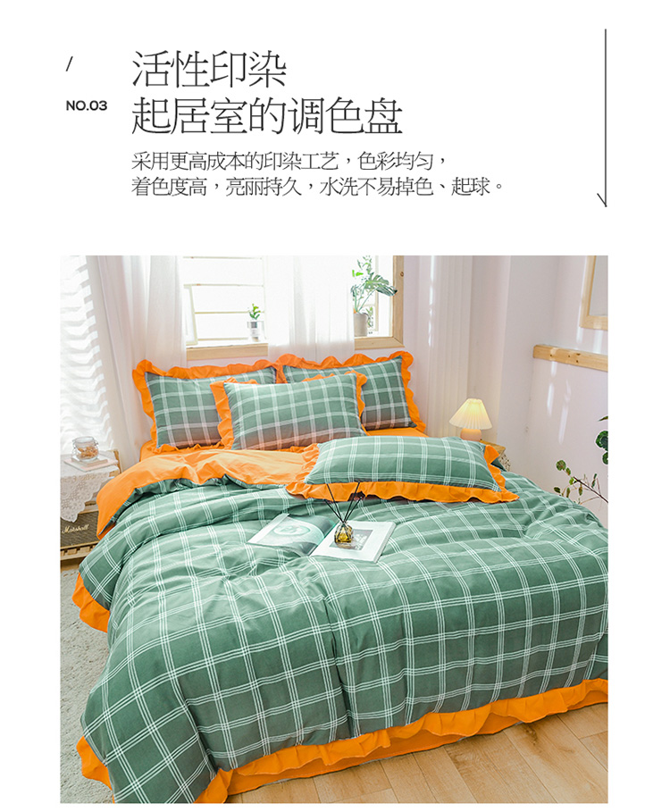 绒兔兔 2021韩版水洗棉时尚格四件套 绿橙