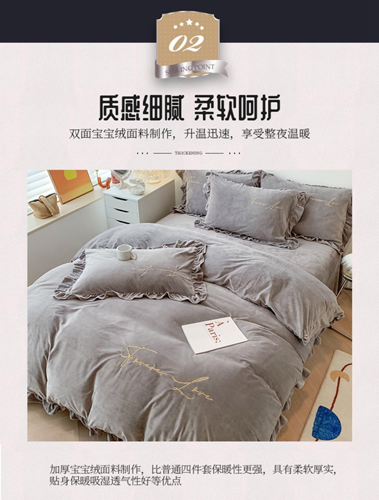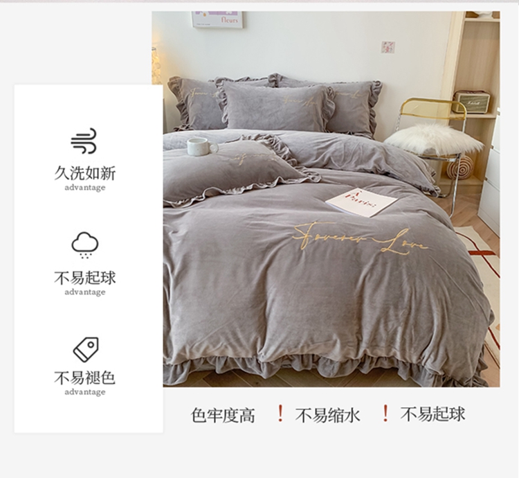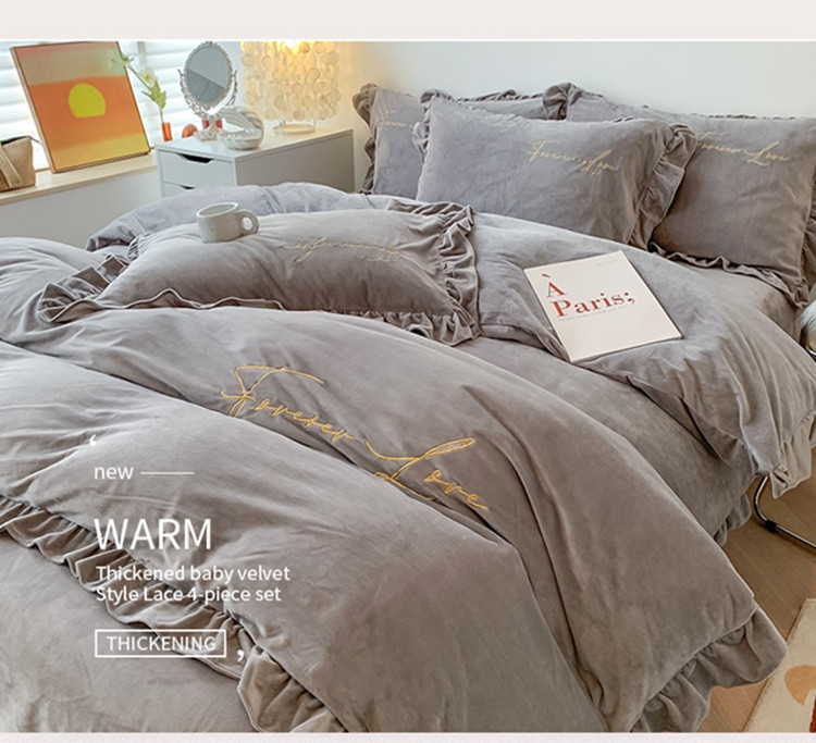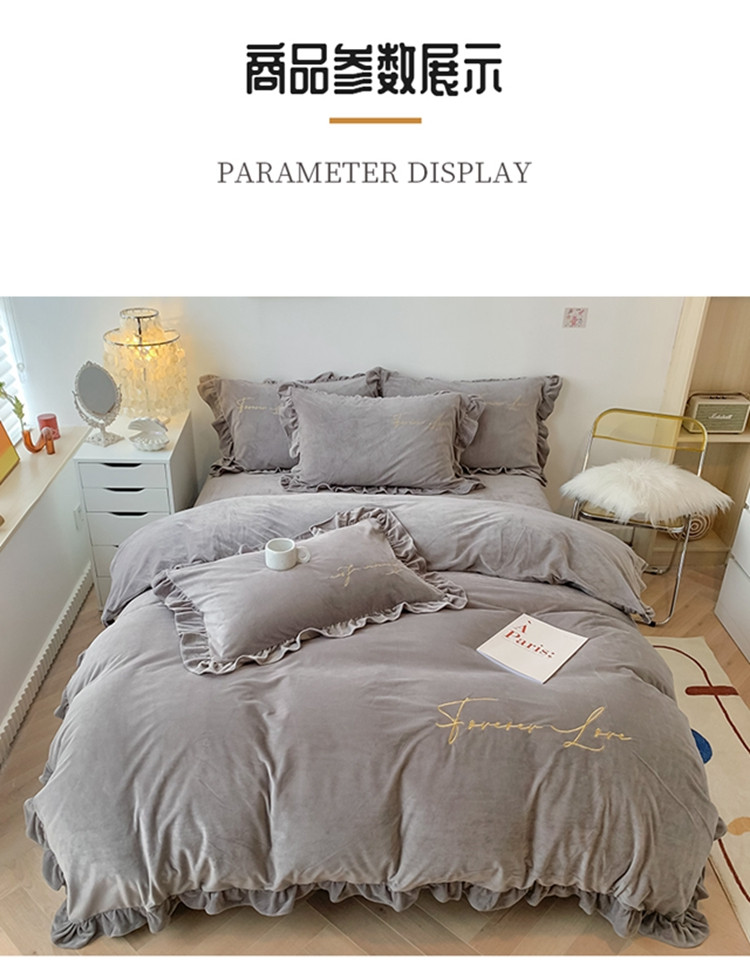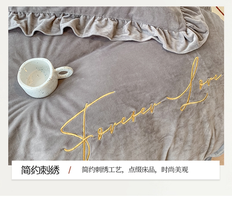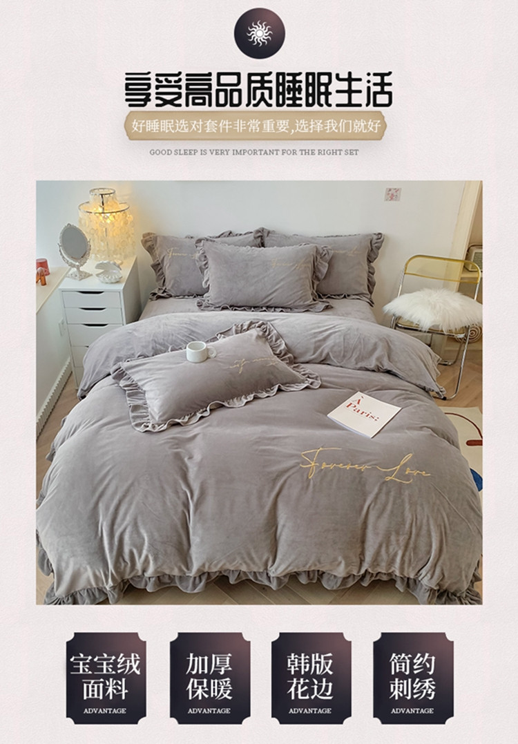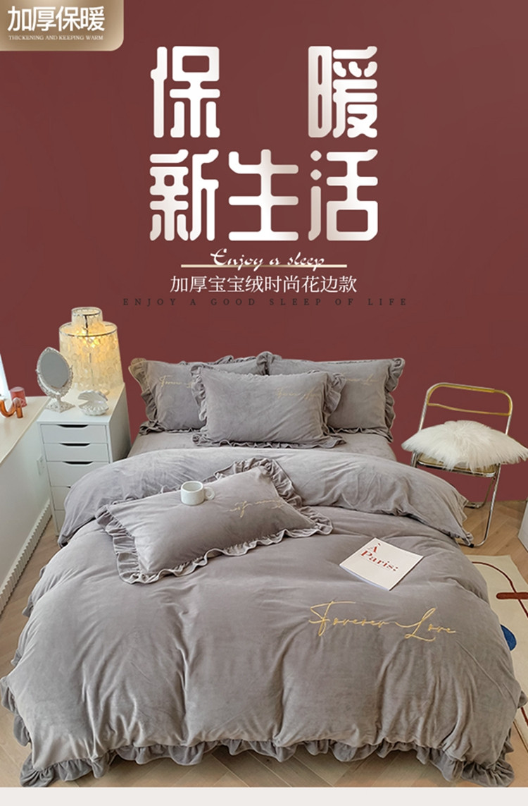 当前位置: 91家纺网 > 商品网购 > 床品套件 > 四件套 > 宝宝绒四件套 > 珺柔家纺2021新款加厚水晶绒时尚花边款 艾丽丝 银灰