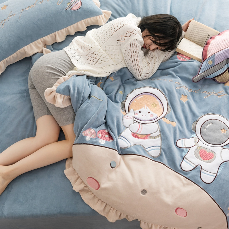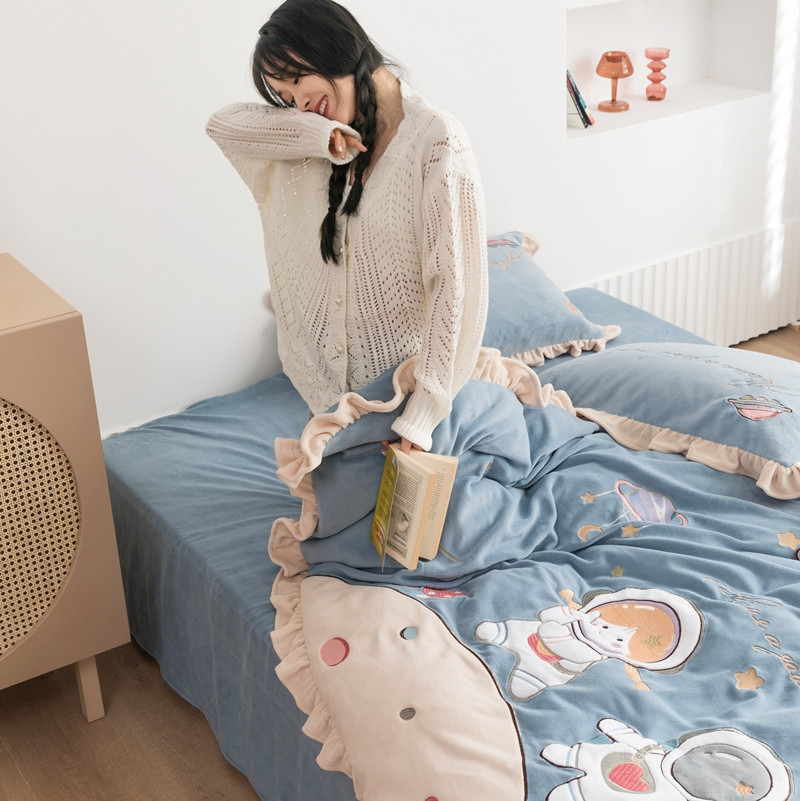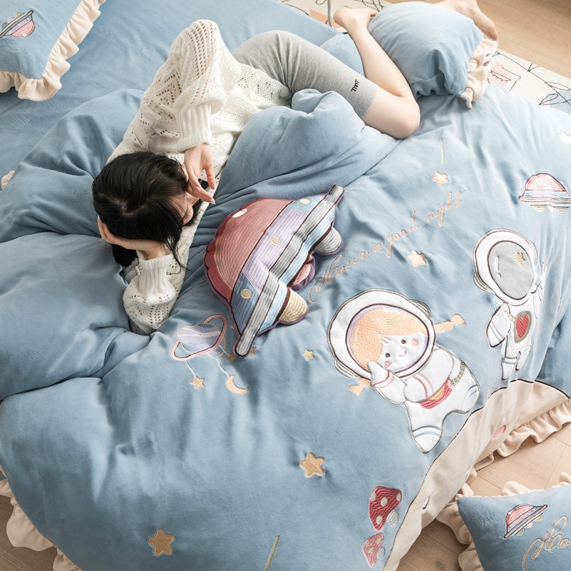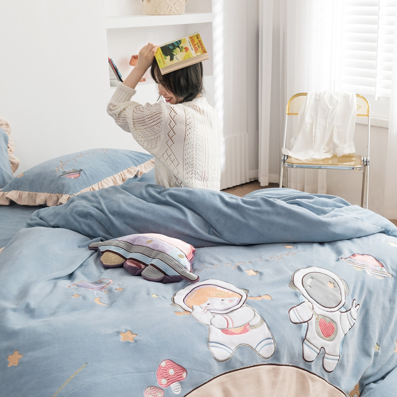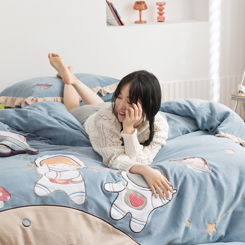 柚子YOUTH 2021新款牛奶绒绣花工艺款四件套-棚拍 太空漫步蓝