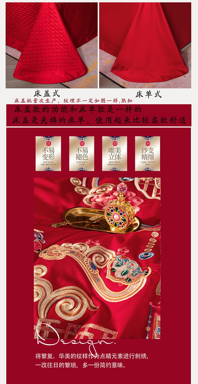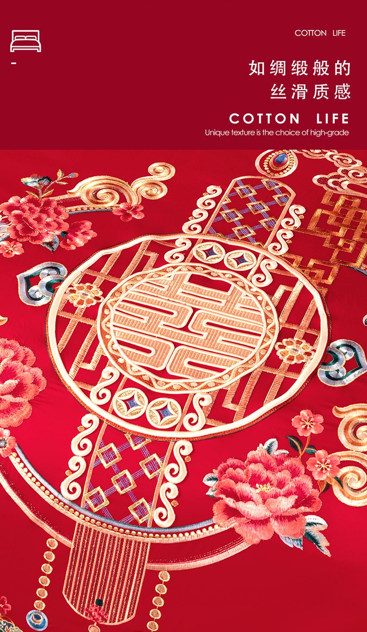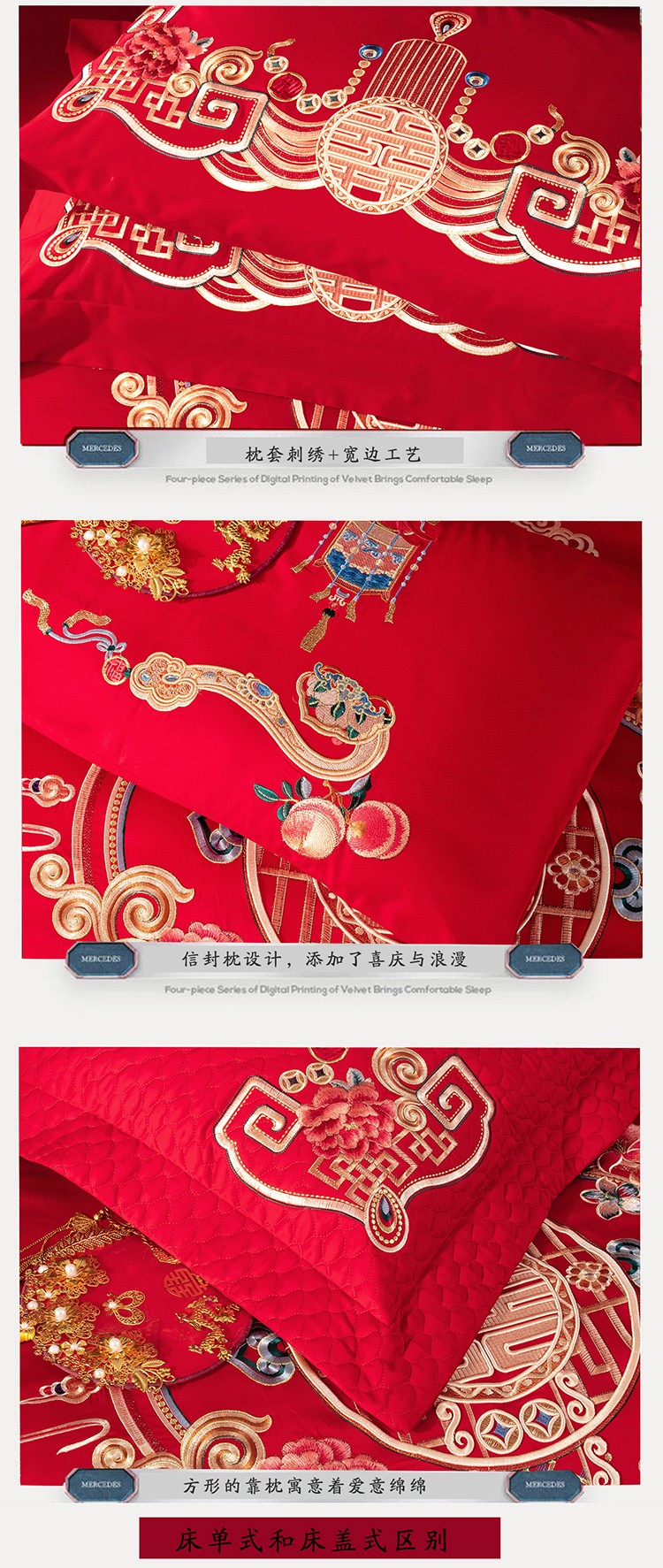 2023新款100s贡缎长绒棉婚庆四件套多件套-国色天香红,床单四件套,床盖四件套,床单六件套,床盖六件套,十件套