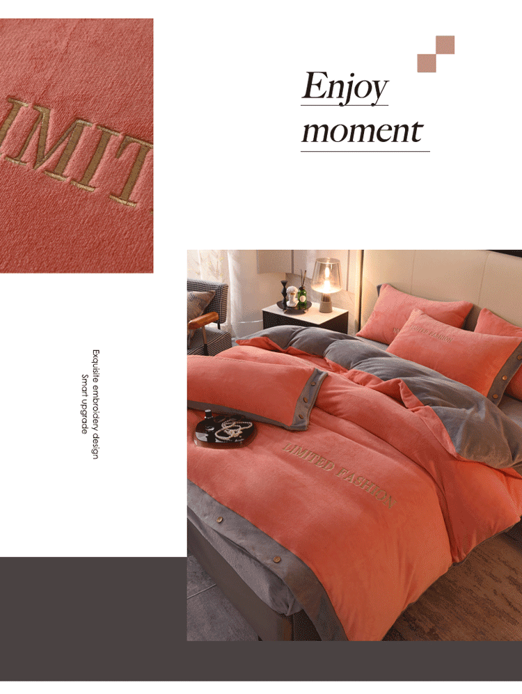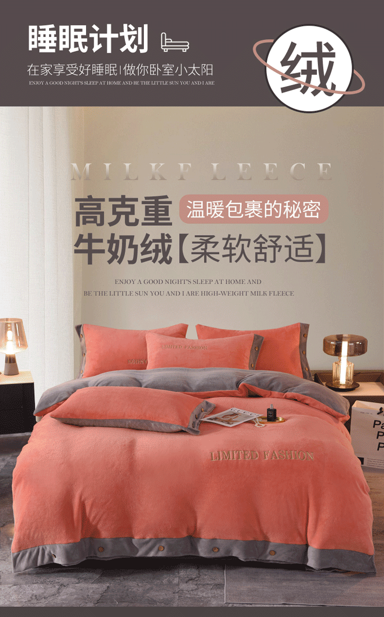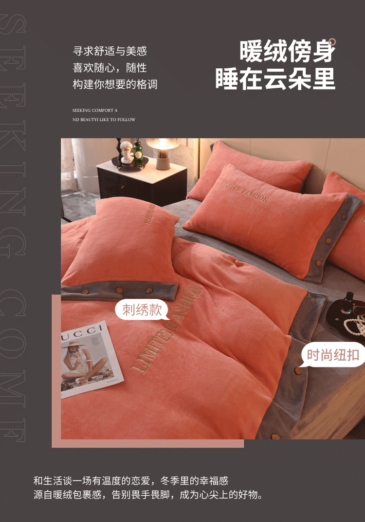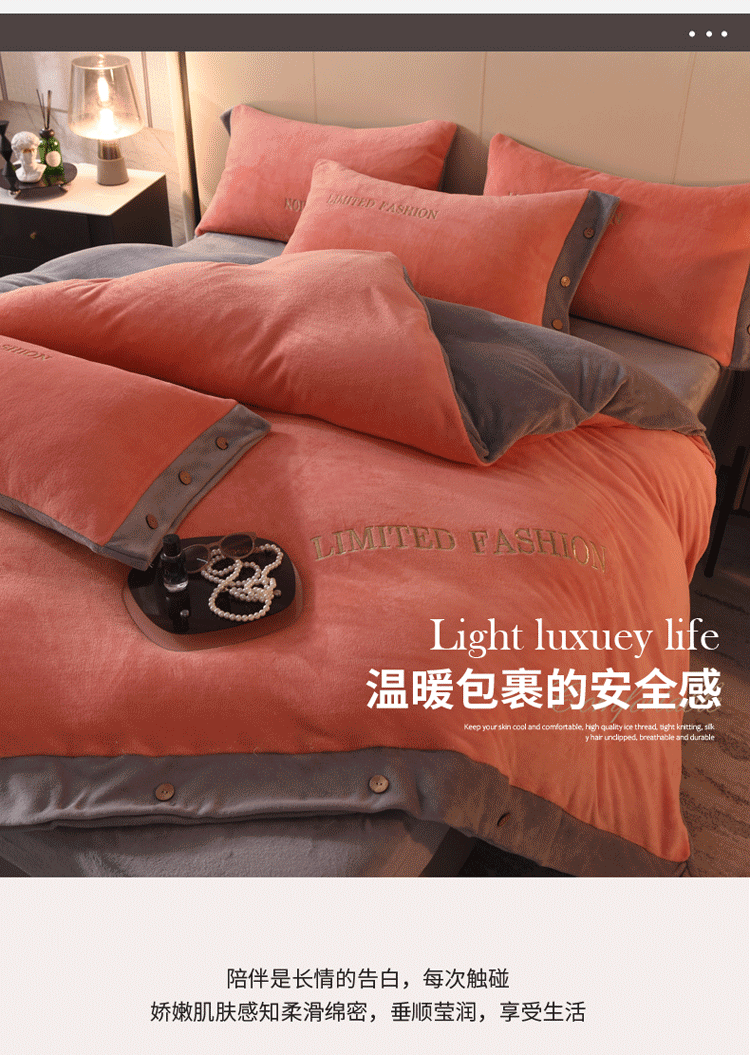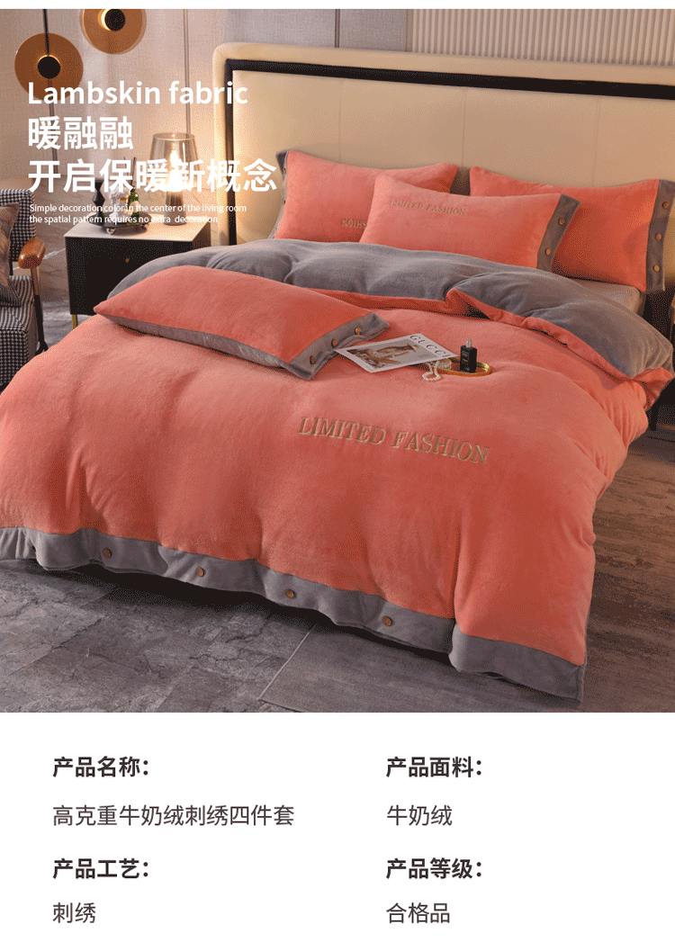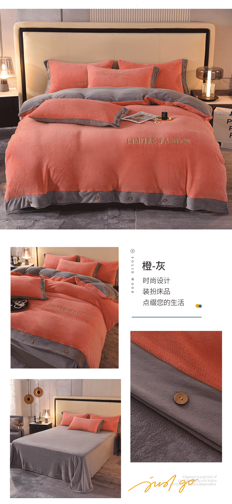 商品名称:欧冠 2022秋冬新款高端刺绣牛奶绒四件套 橙-灰