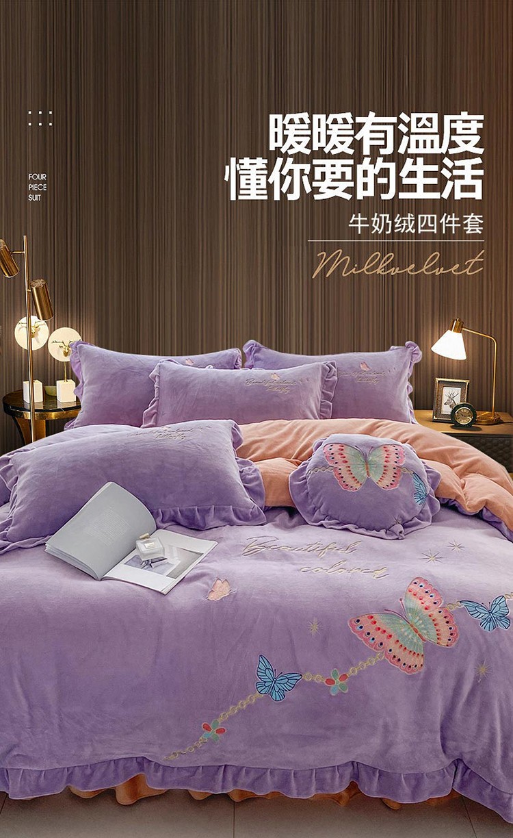 铠畅直播供货轻奢韩版花边高克重牛奶绒刺绣四件套床裙款蝶恋紫
