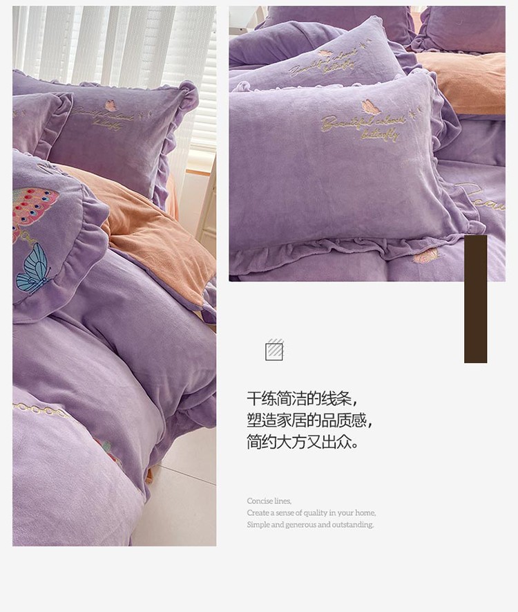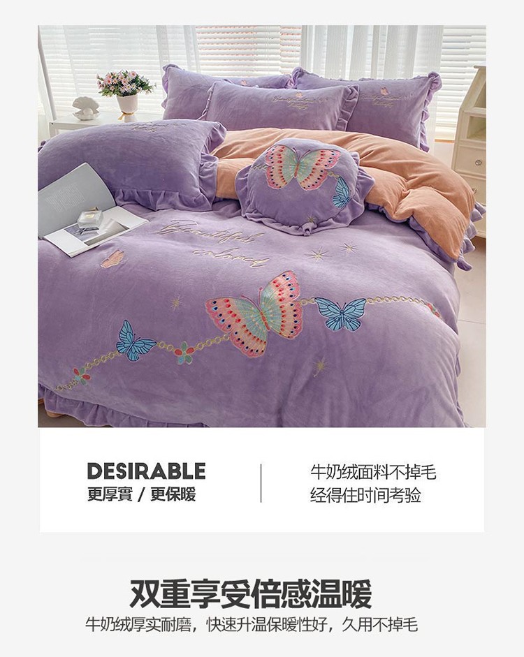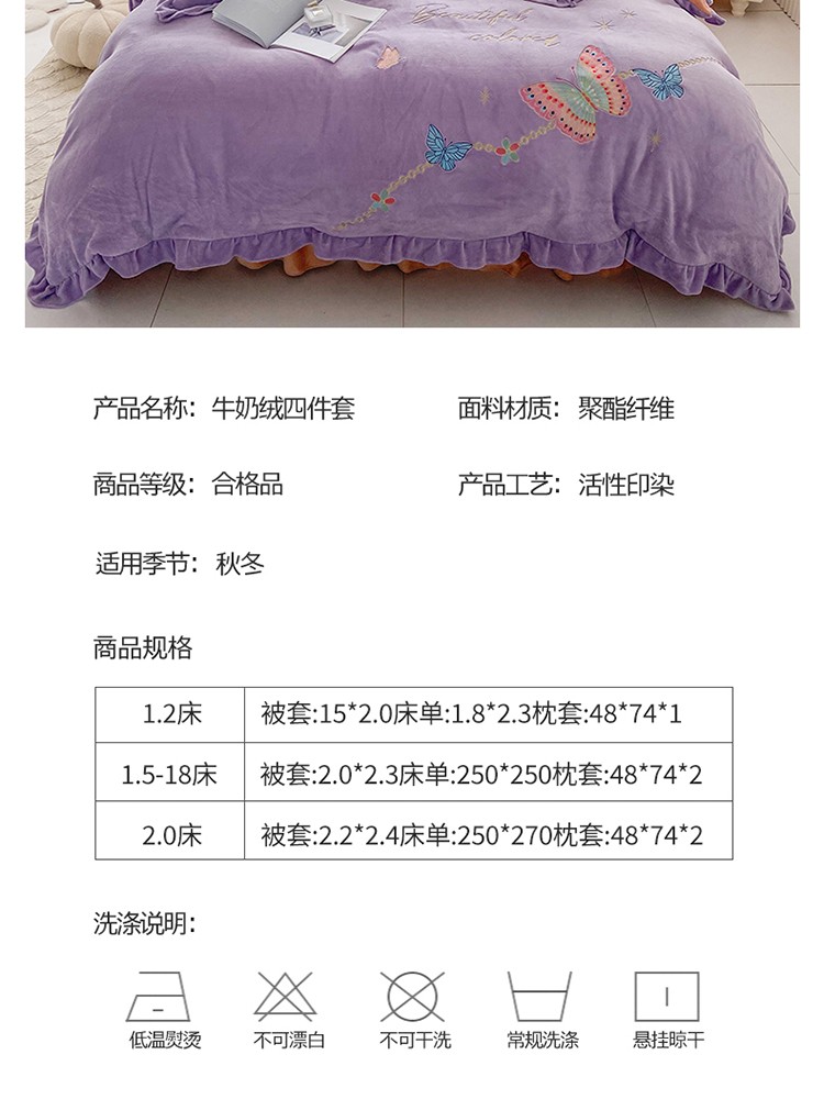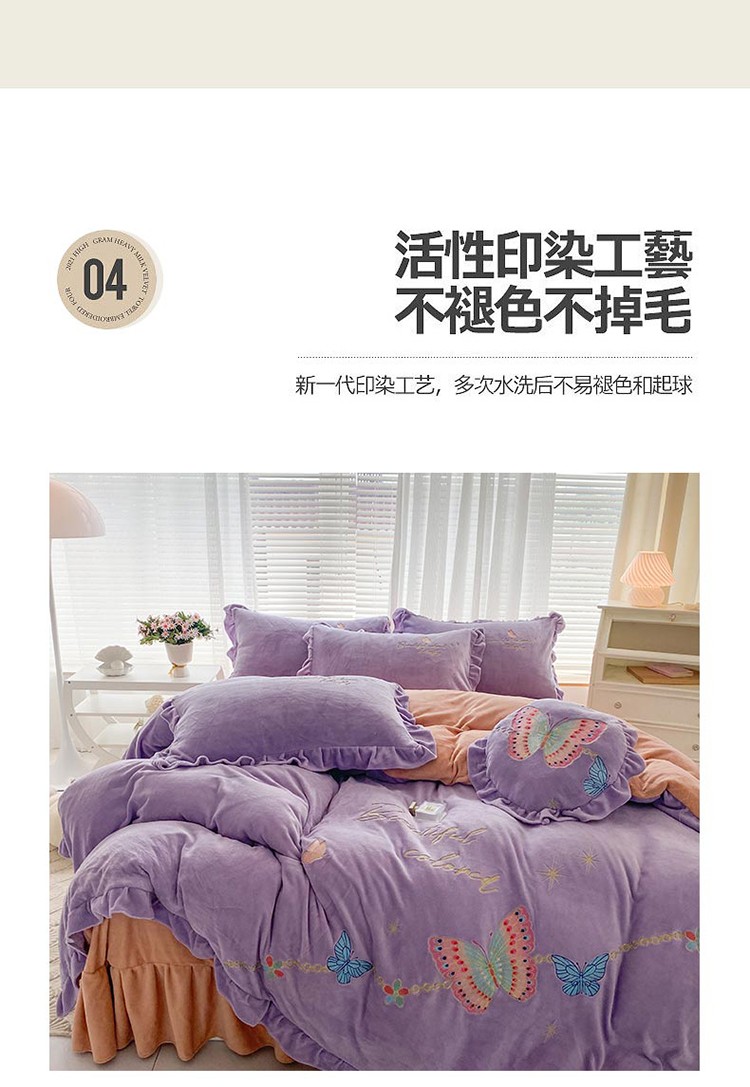 商品名称:铠畅直播供货轻奢韩版花边高克重牛奶绒刺绣四件套床裙款蝶恋紫