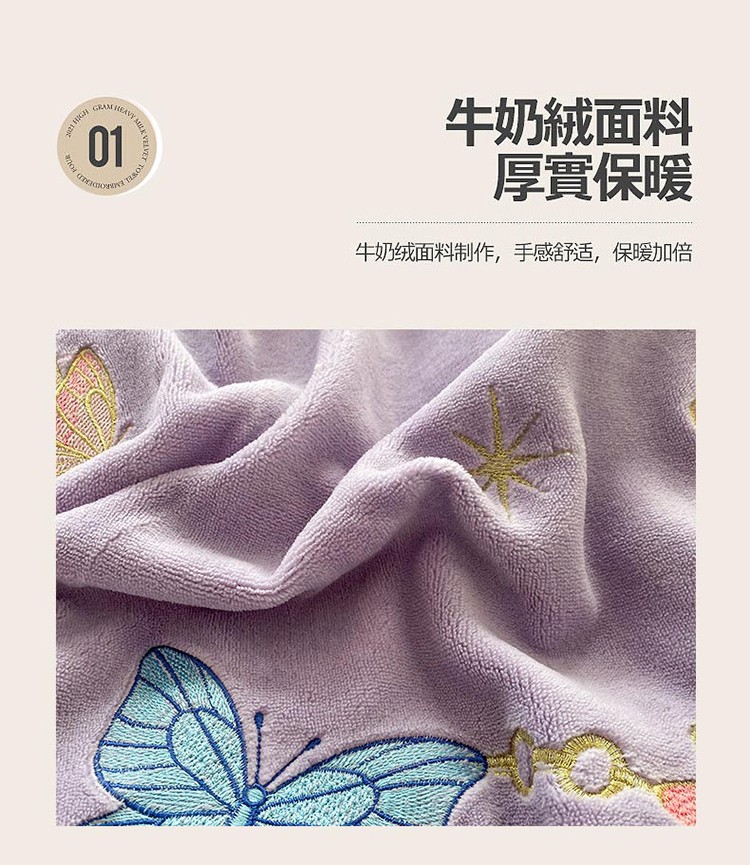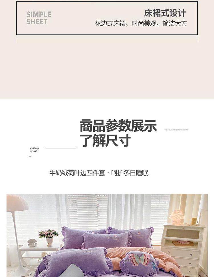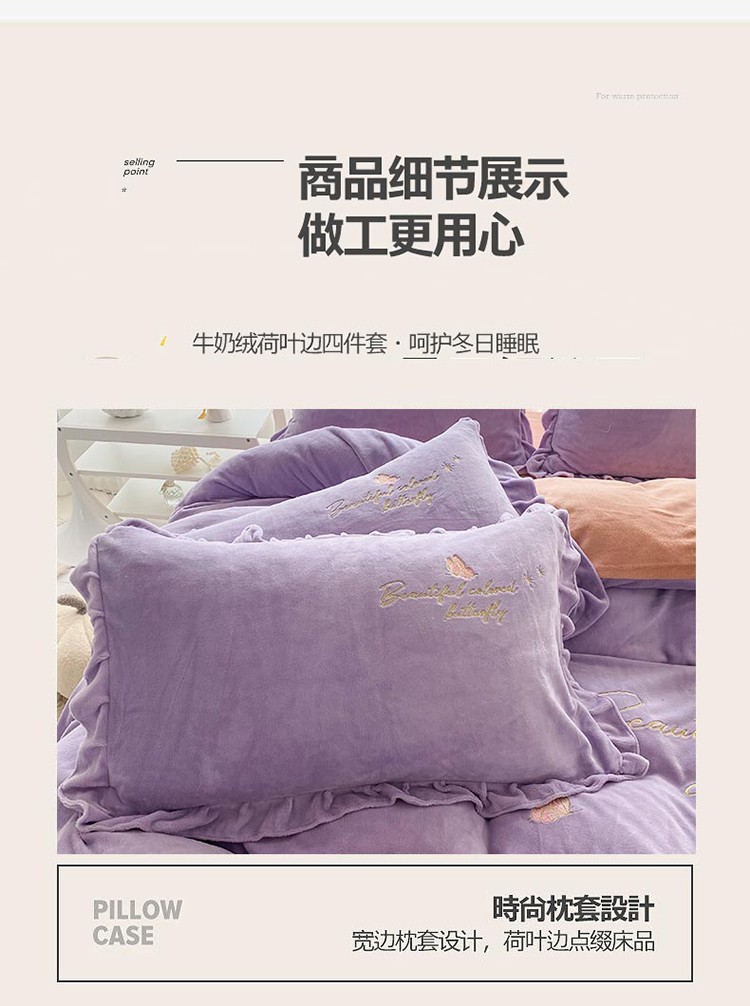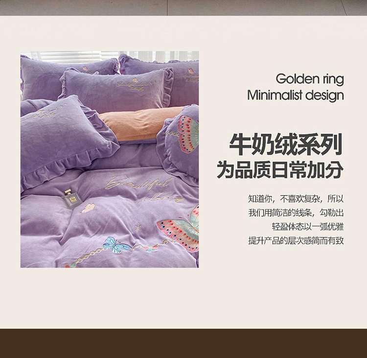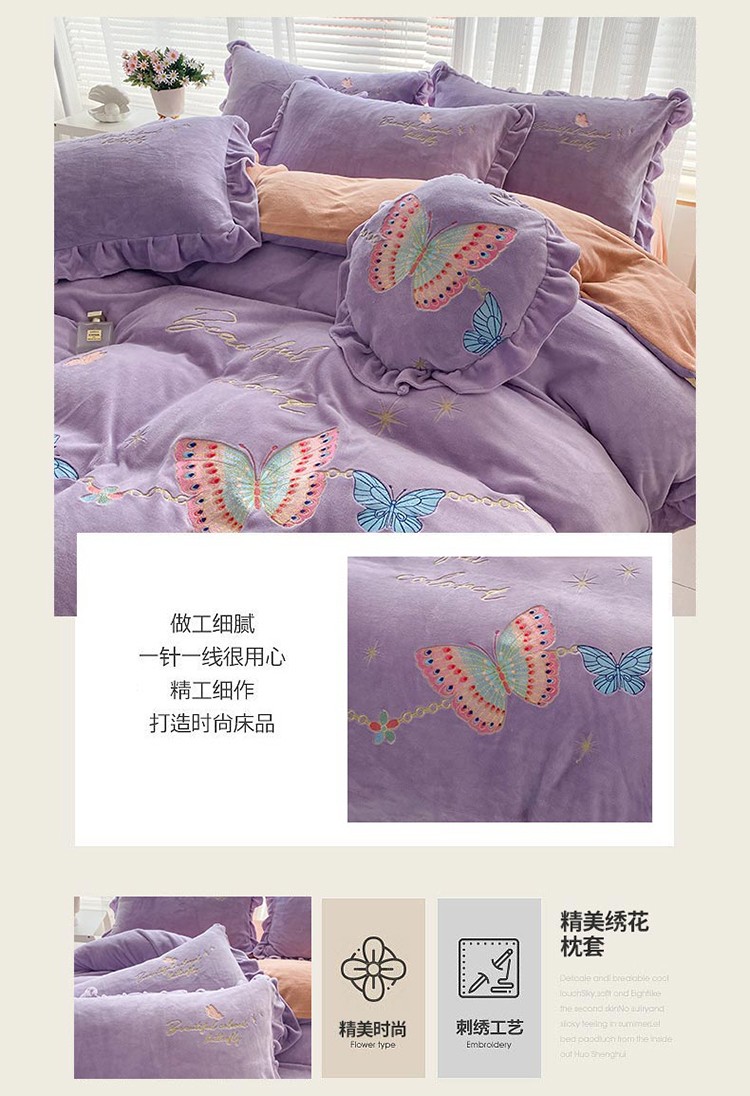 商品名称:铠畅直播供货轻奢韩版花边高克重牛奶绒刺绣四件套床裙款蝶恋紫