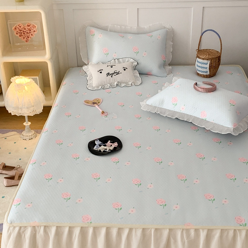昔可家纺 2023新款双层雪纺纱花边床裙款凉感软席 蓝色甜美玫瑰