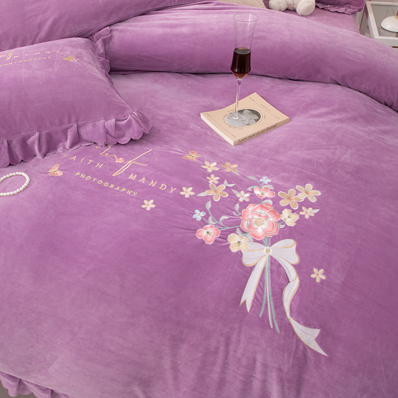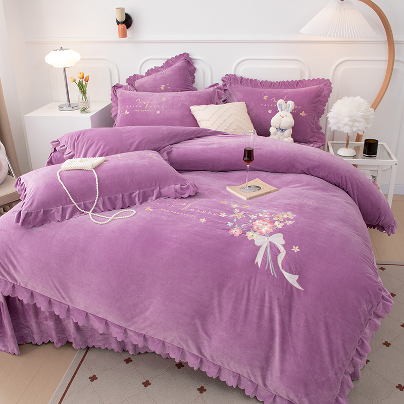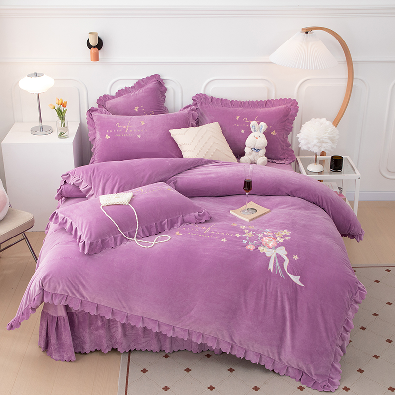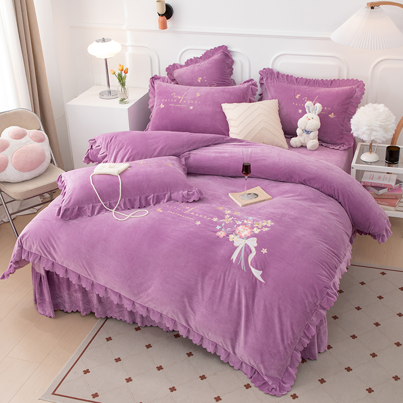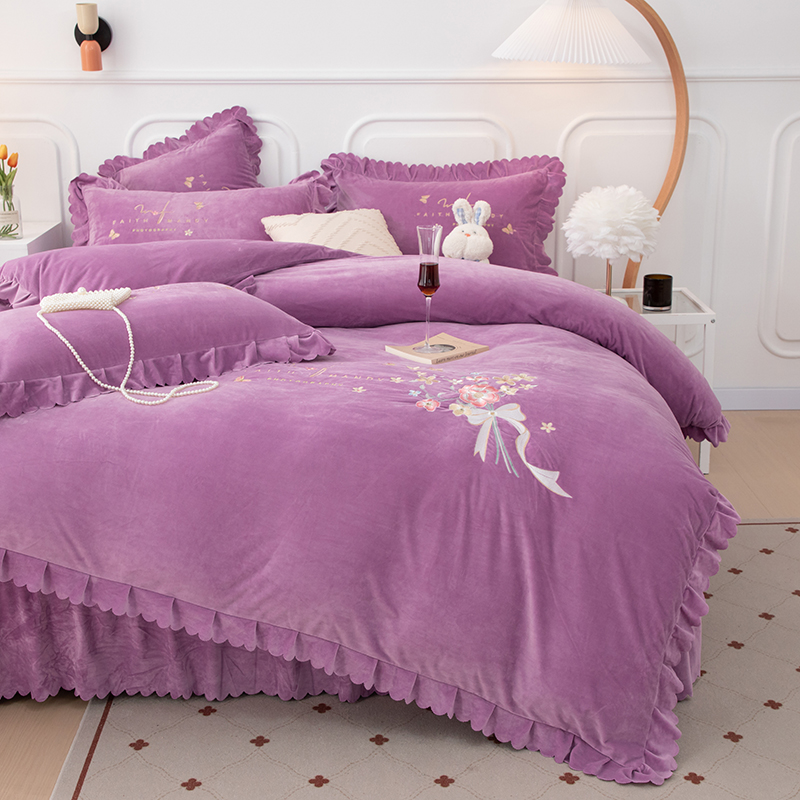 优姿家纺 2024新品8.5斤德芙绒韩版床裙绣花保暖四件套 今生有约紫色