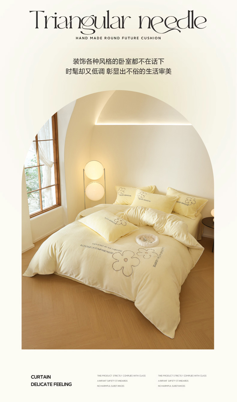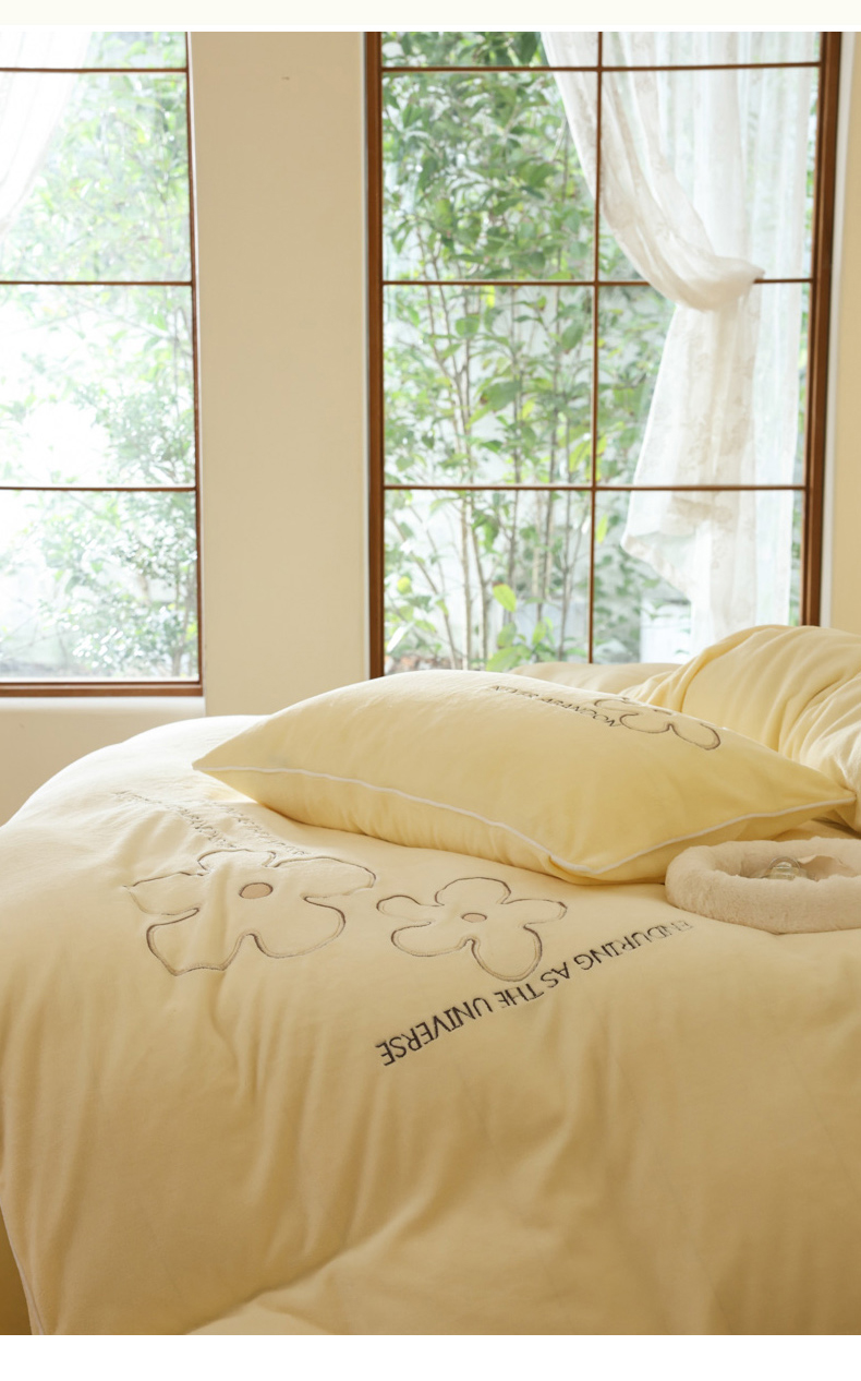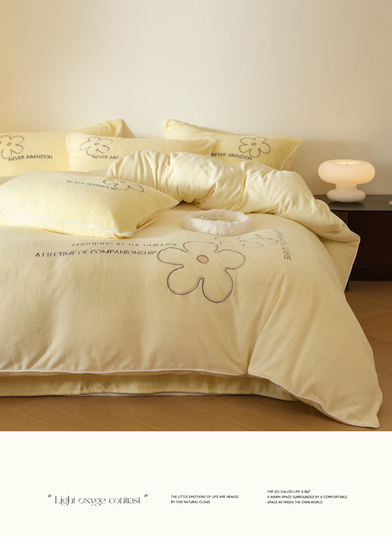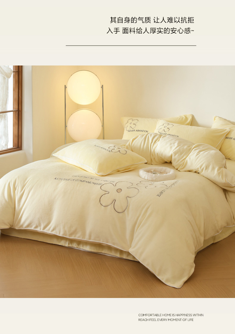万盛家纺 2025新款牛奶绒简约绣花四件套 奶油黄