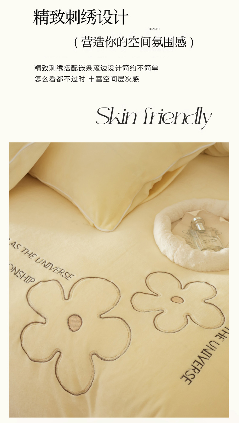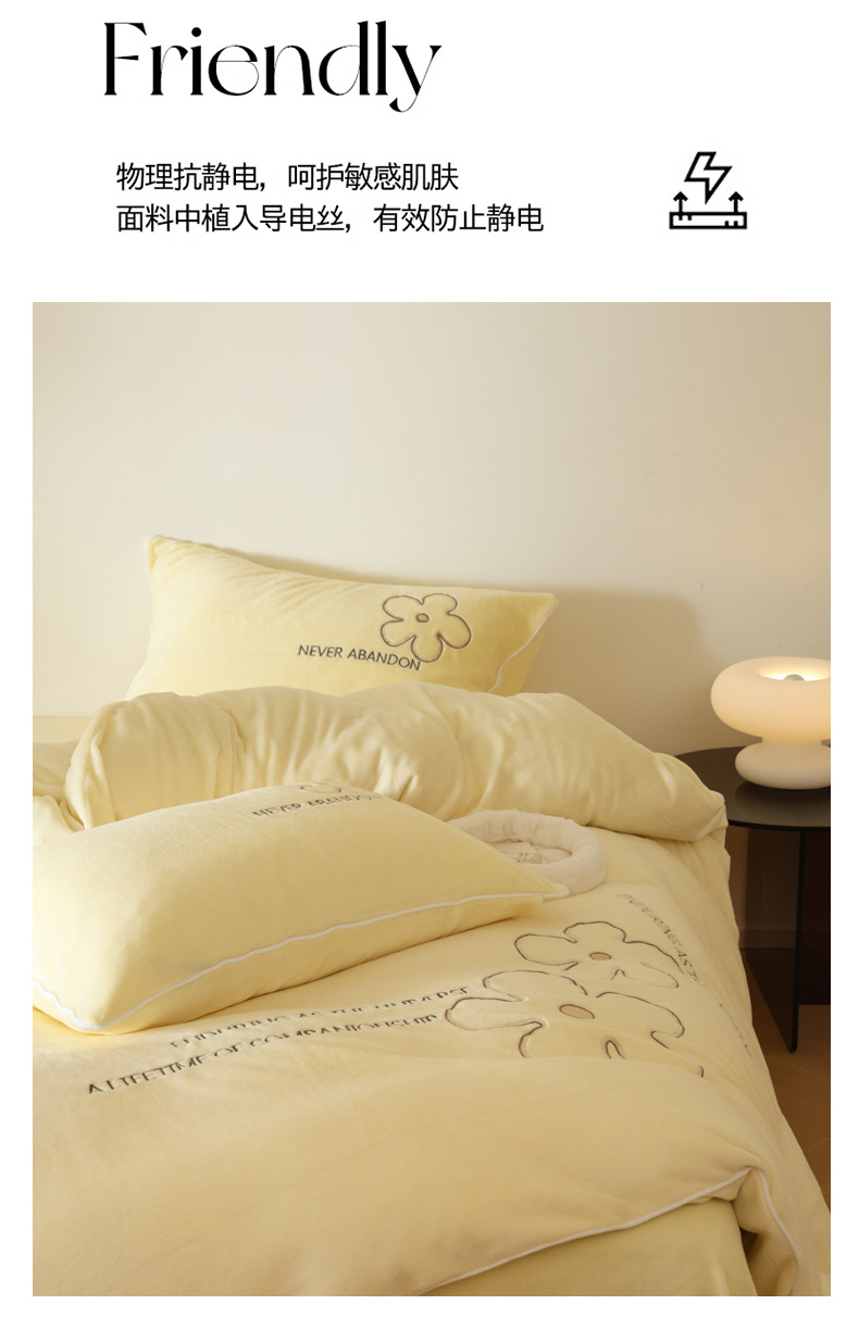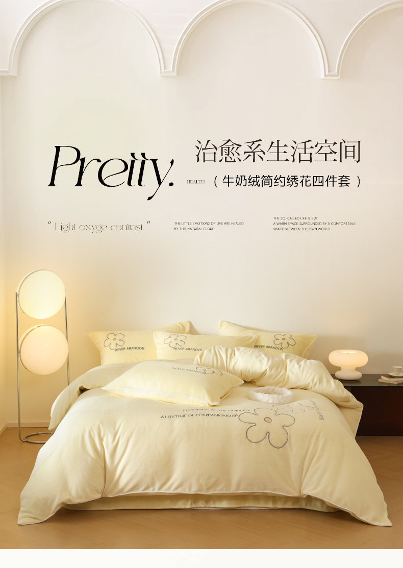 万盛家纺 2025新款牛奶绒简约绣花四件套 奶油黄