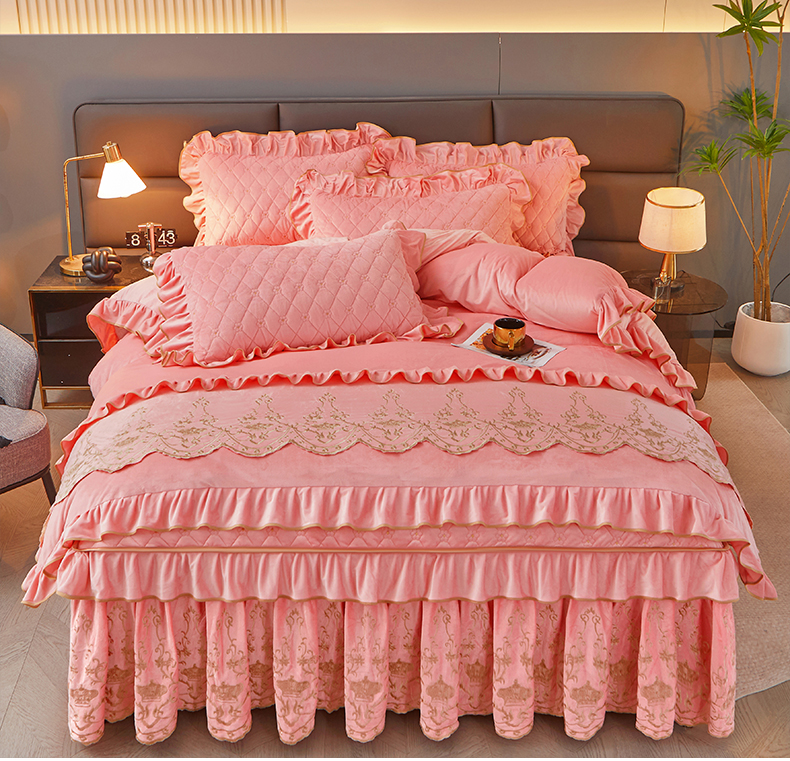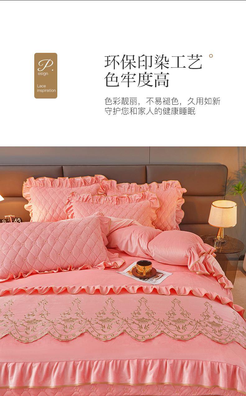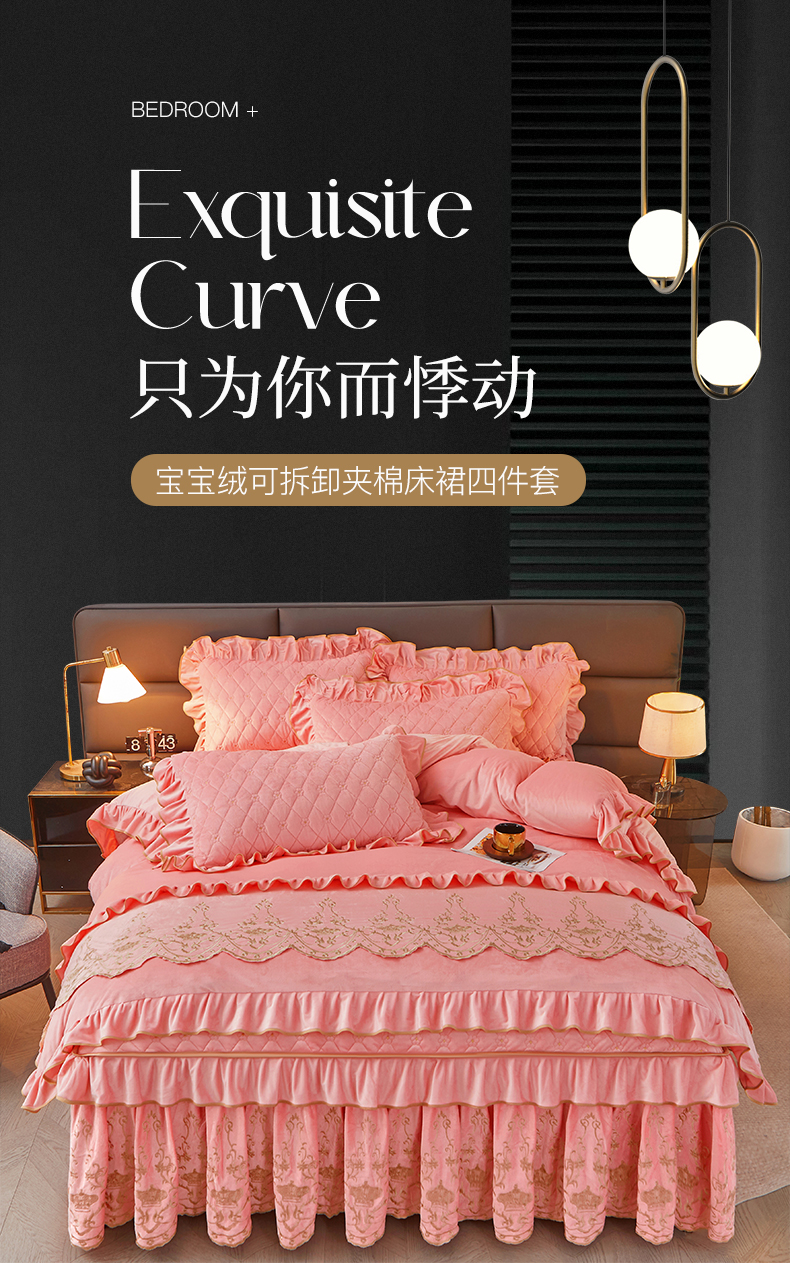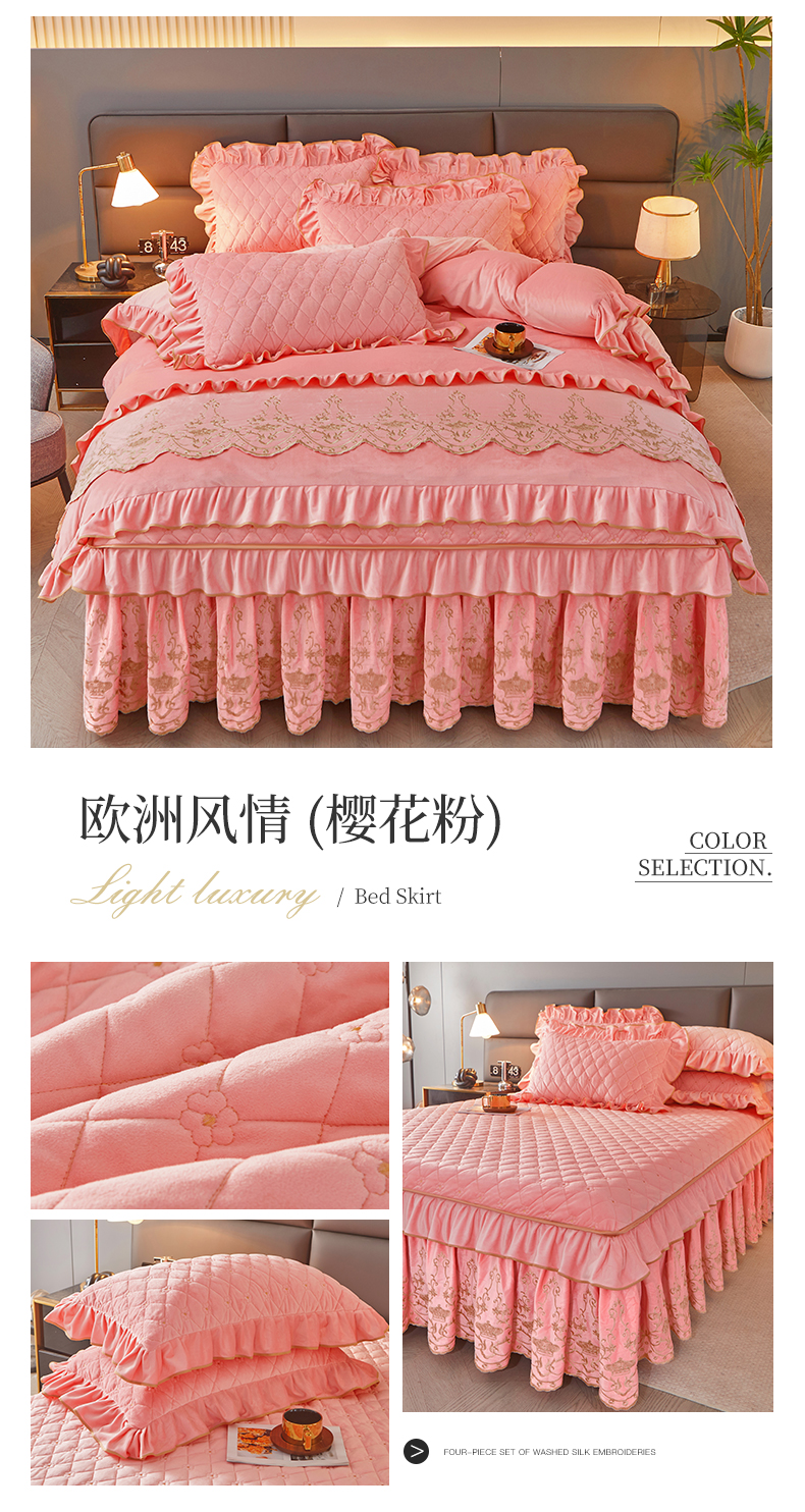 当前位置: 91家纺网 > 商品网购 > 床品套件 > 四件套 > 宝宝绒四件套 > 罗艺轩 2024新款欧洲风情宝宝绒可拆卸夹棉床裙四件套 樱花粉