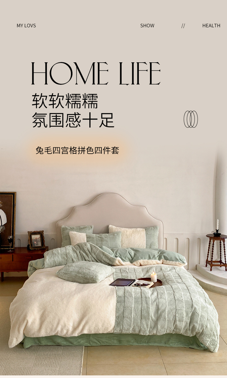 (总)潘朵拉 2023新款兔毛四宫格极有家小红书风格拼色牛奶绒四件套,梵希(豆沙),梵希(粉),梵希(灰),梵希(蓝),梵希(绿),梵希(奶咖)
