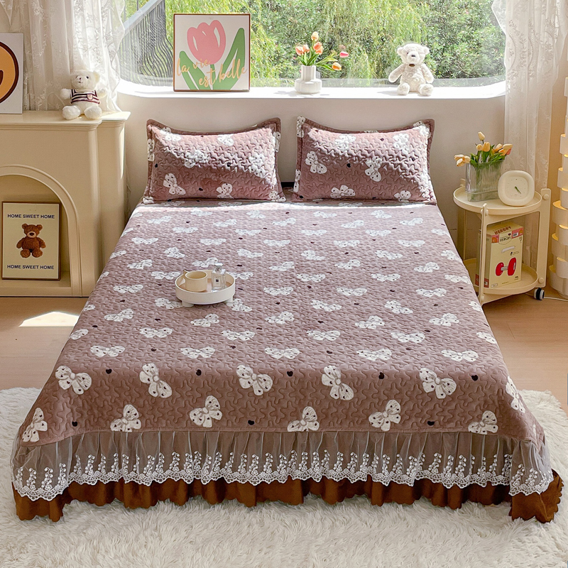 雅眠居 2023新款直播爆款牛奶绒双层蕾丝床盖夹棉床裙款 蝴蝶结