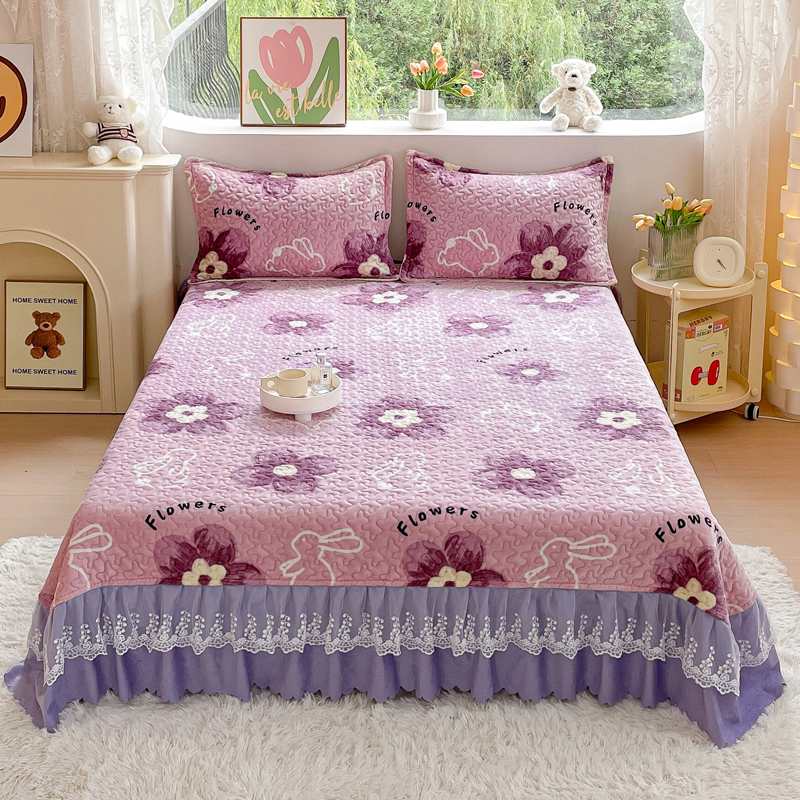 雅眠居 2023新款直播爆款牛奶绒双层蕾丝床盖夹棉床裙款 幸福兔-紫