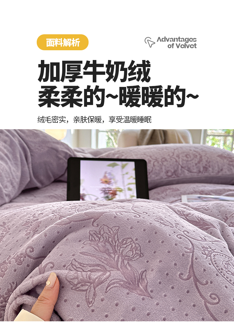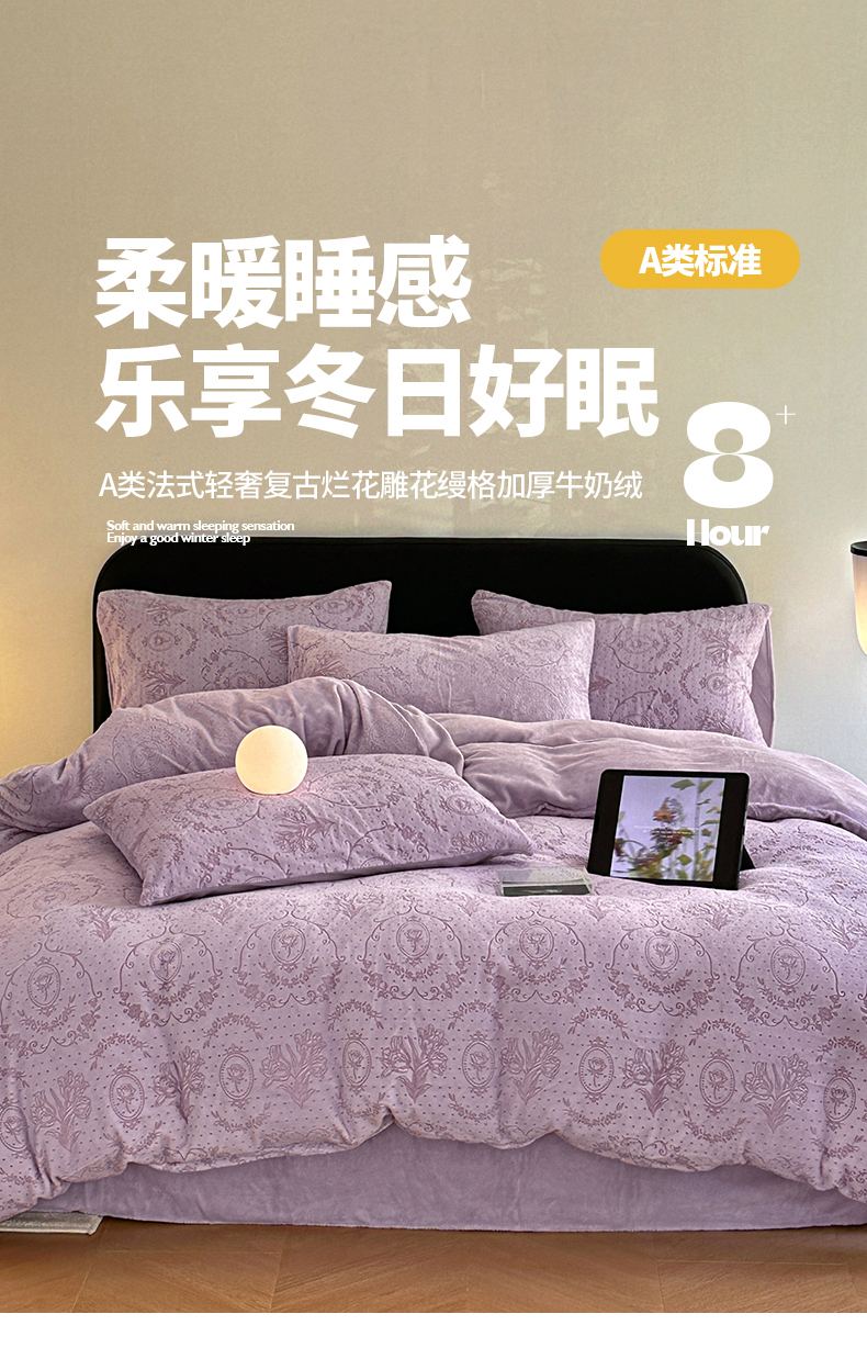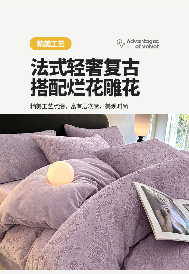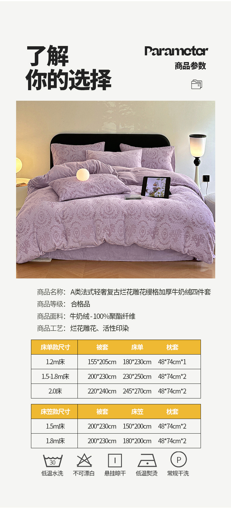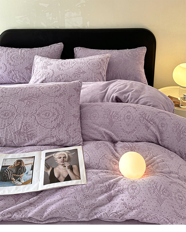 商品名称:桃子家居 2023新款A类高克重230克法式轻奢复古着色烂花雕花缦格加厚牛奶绒四件套 缦格紫罗兰