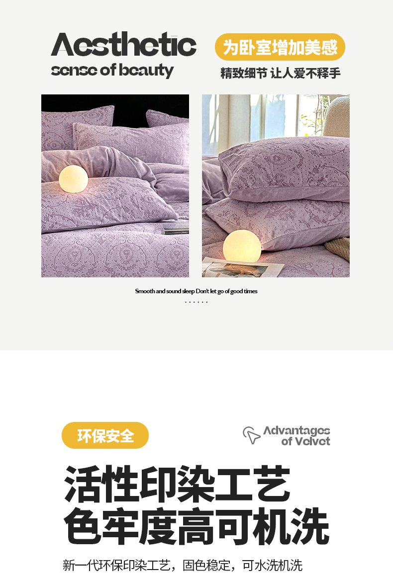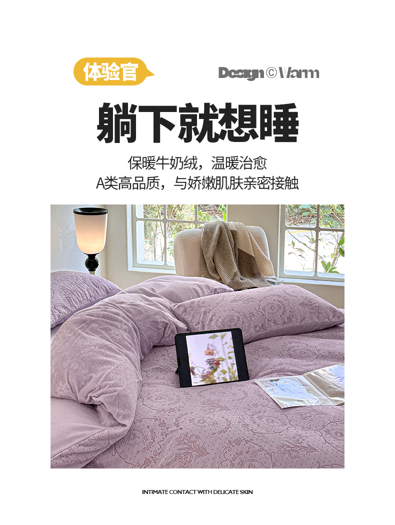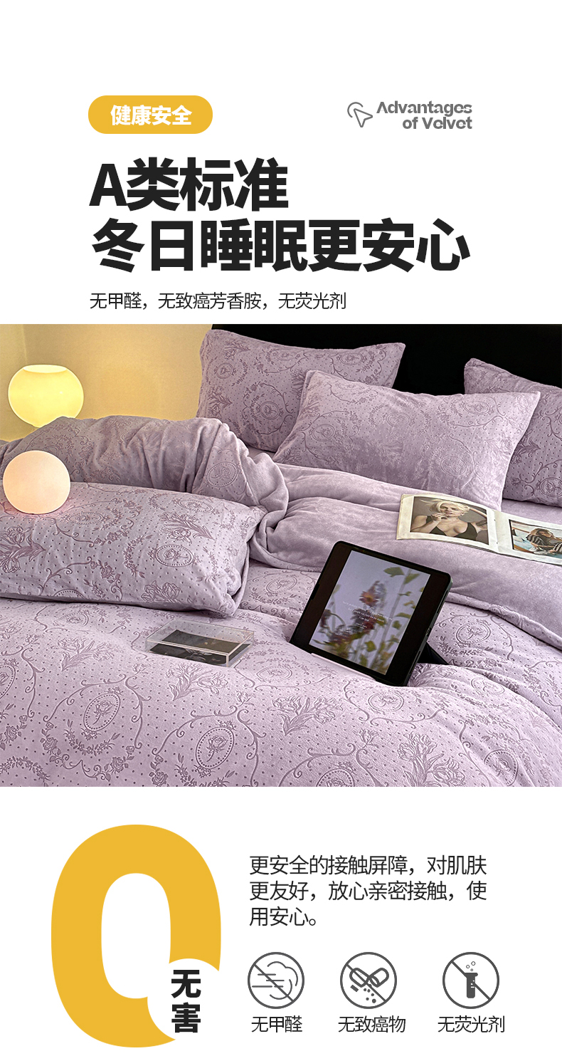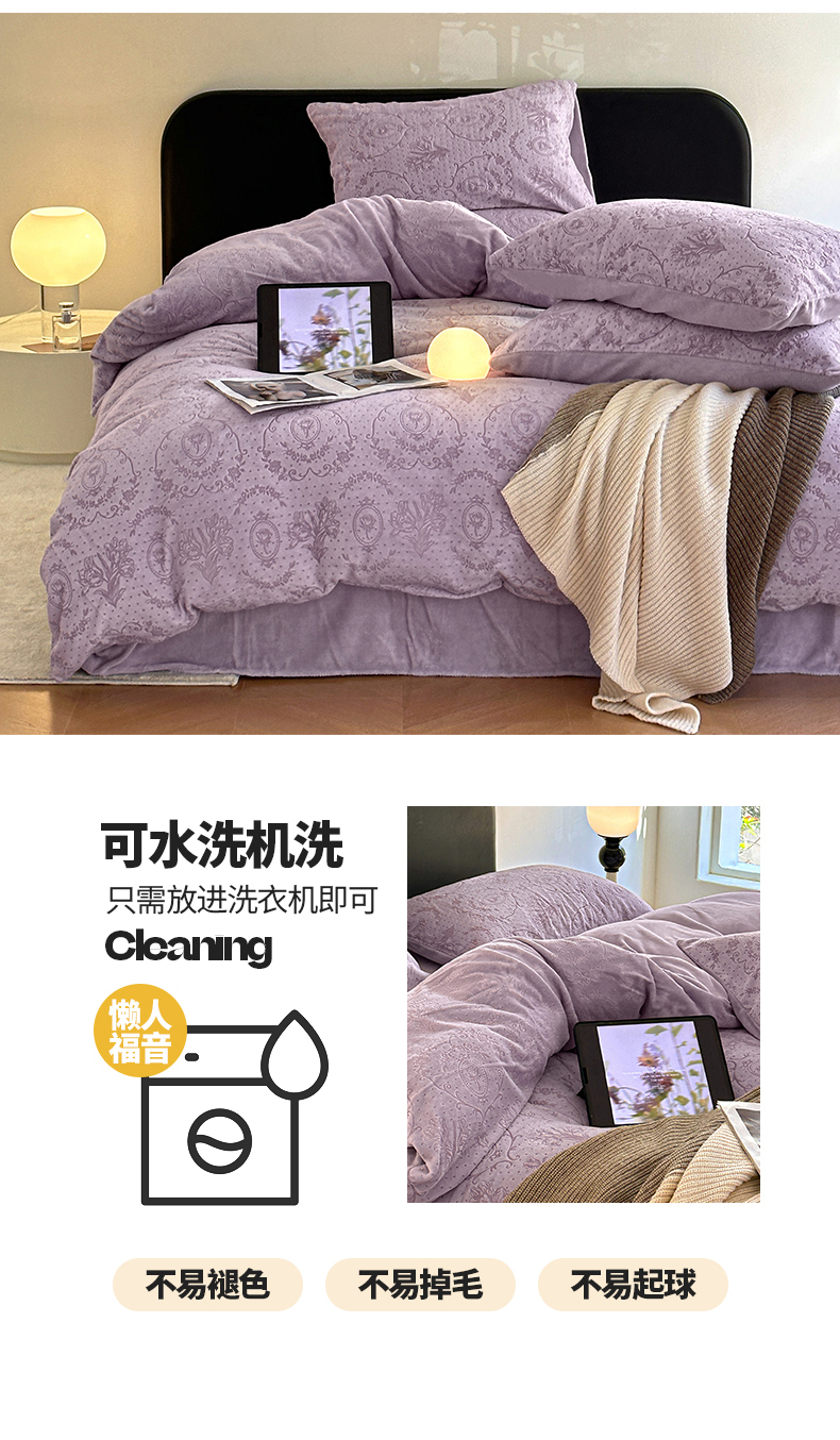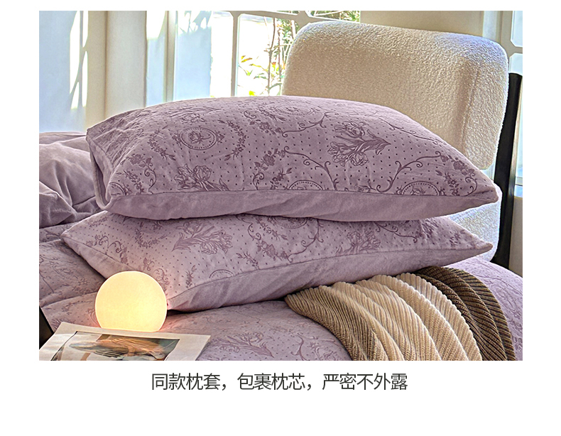 商品名称:桃子家居 2023新款A类高克重230克法式轻奢复古着色烂花雕花缦格加厚牛奶绒四件套 缦格紫罗兰