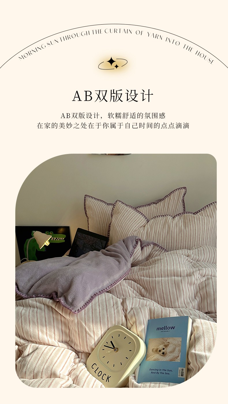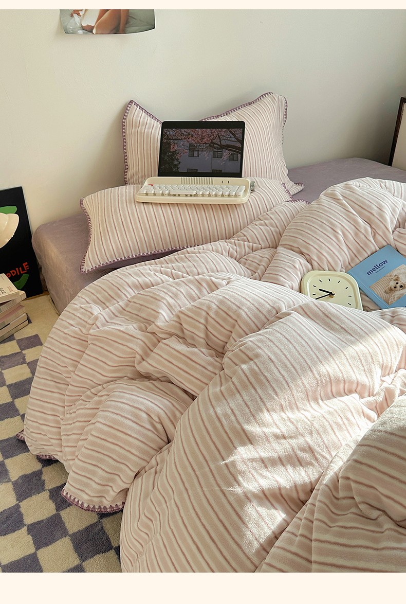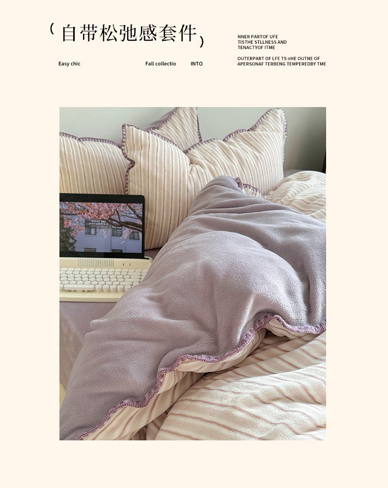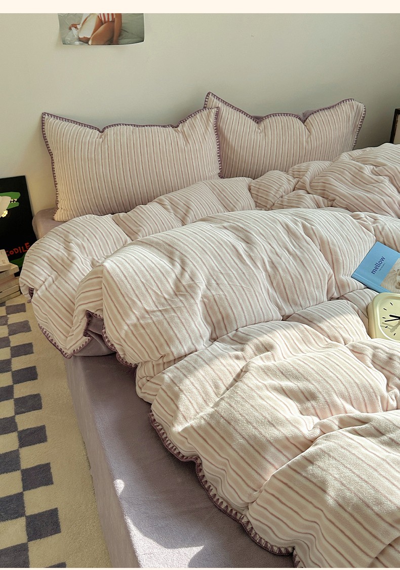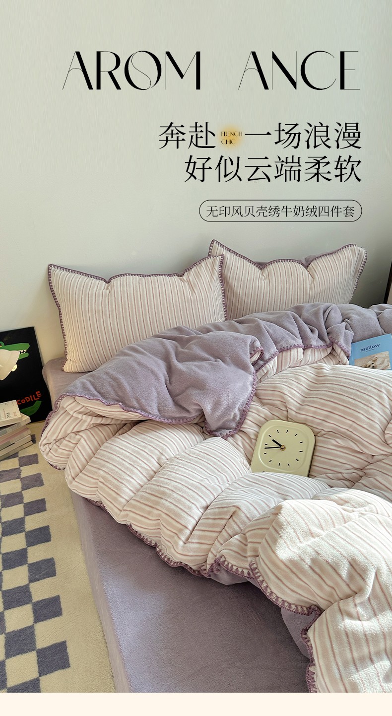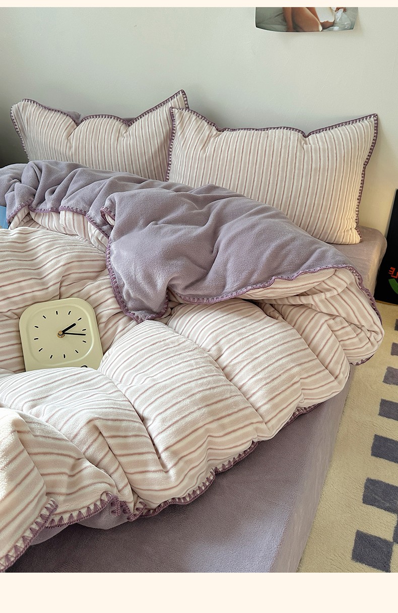 三朵 2023新款无印风牛奶绒四件套 香芋紫小条