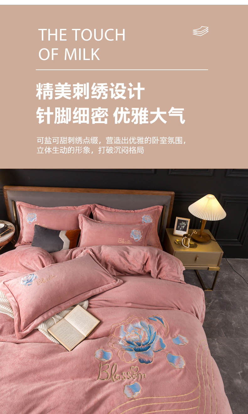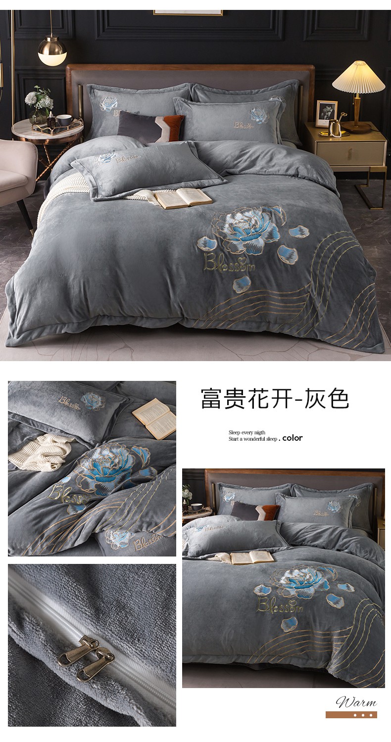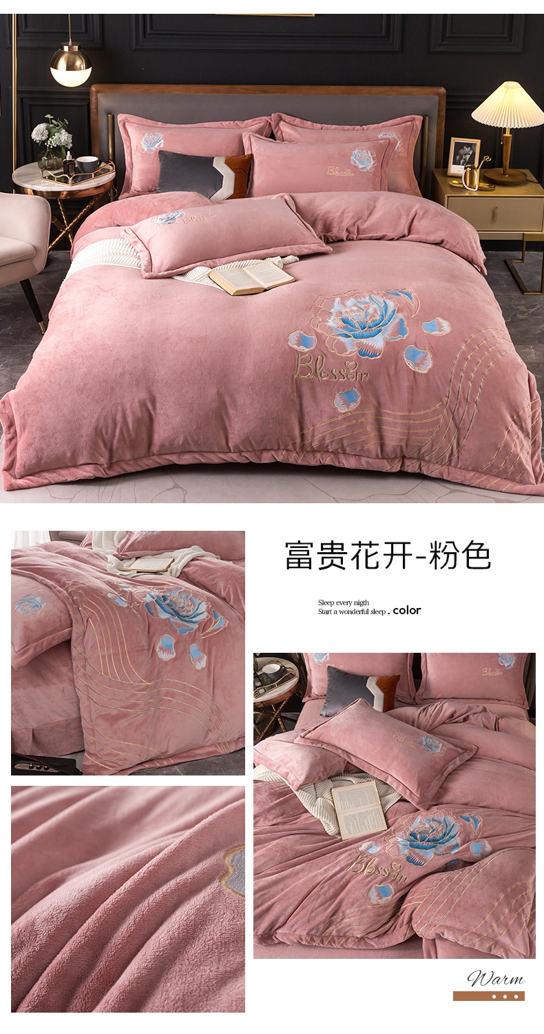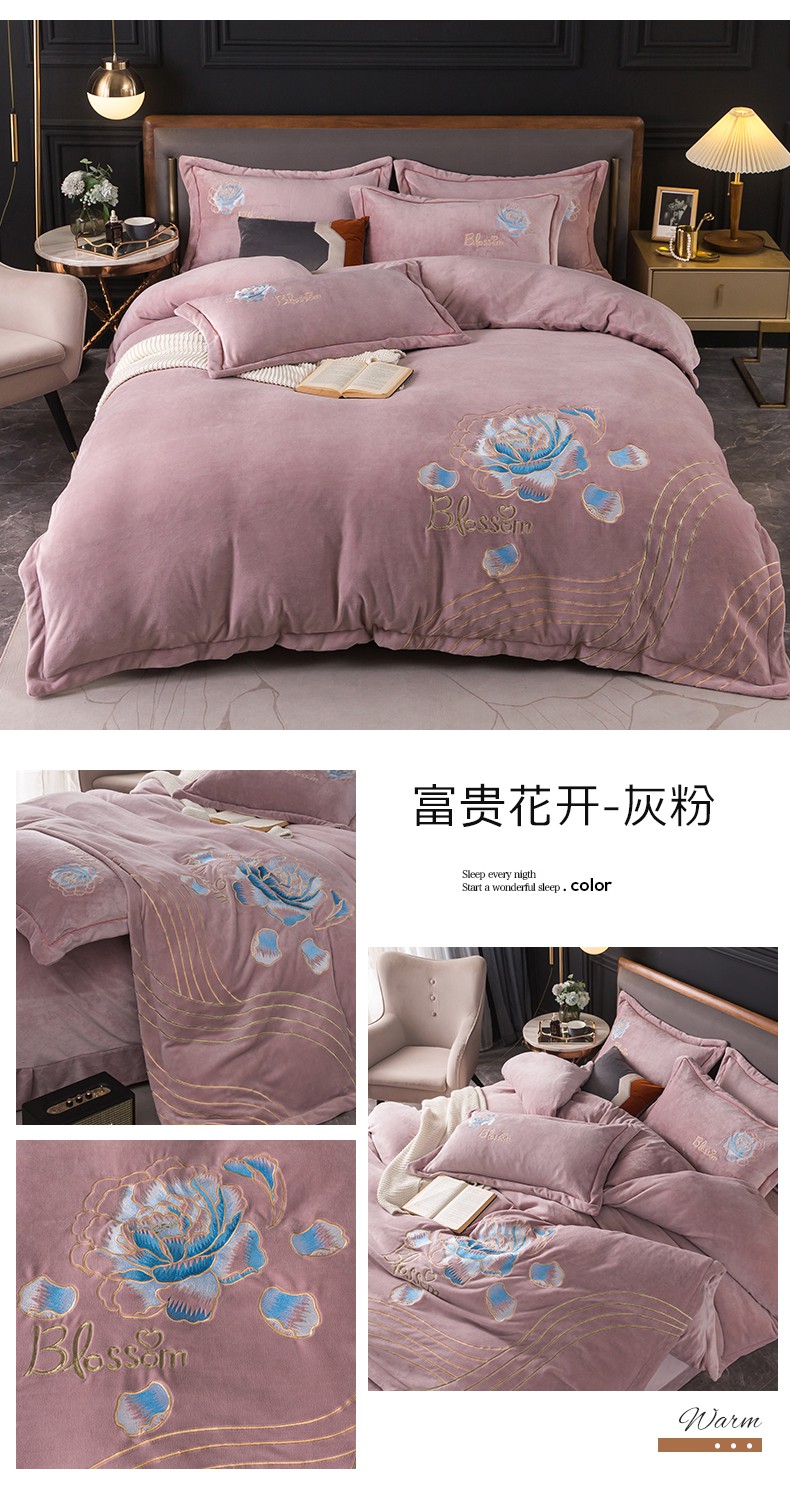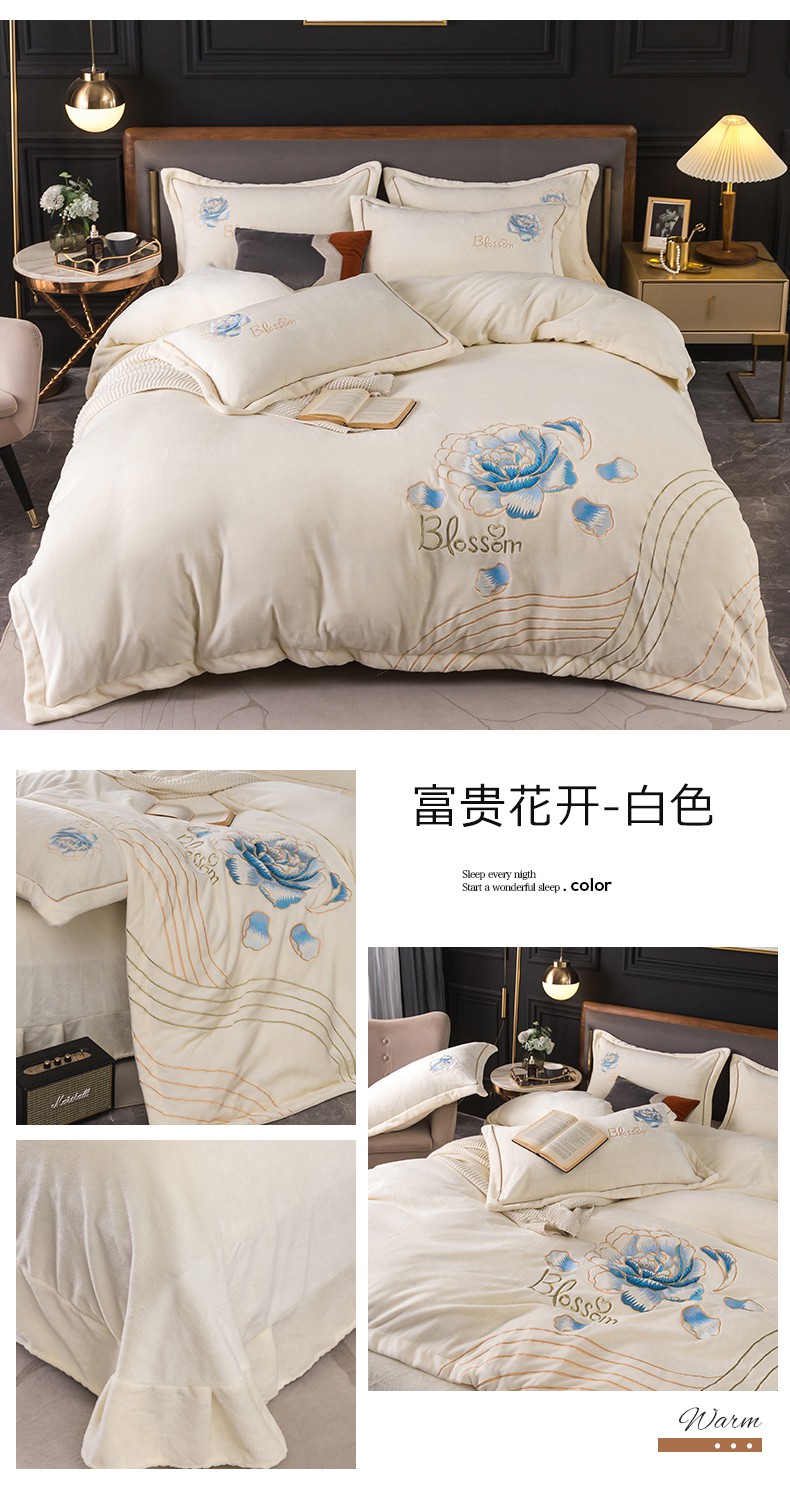 商品名称:(总)找底底家纺 2023款9斤全消光9斤重工刺绣纯色牛奶绒四件套-富贵花开