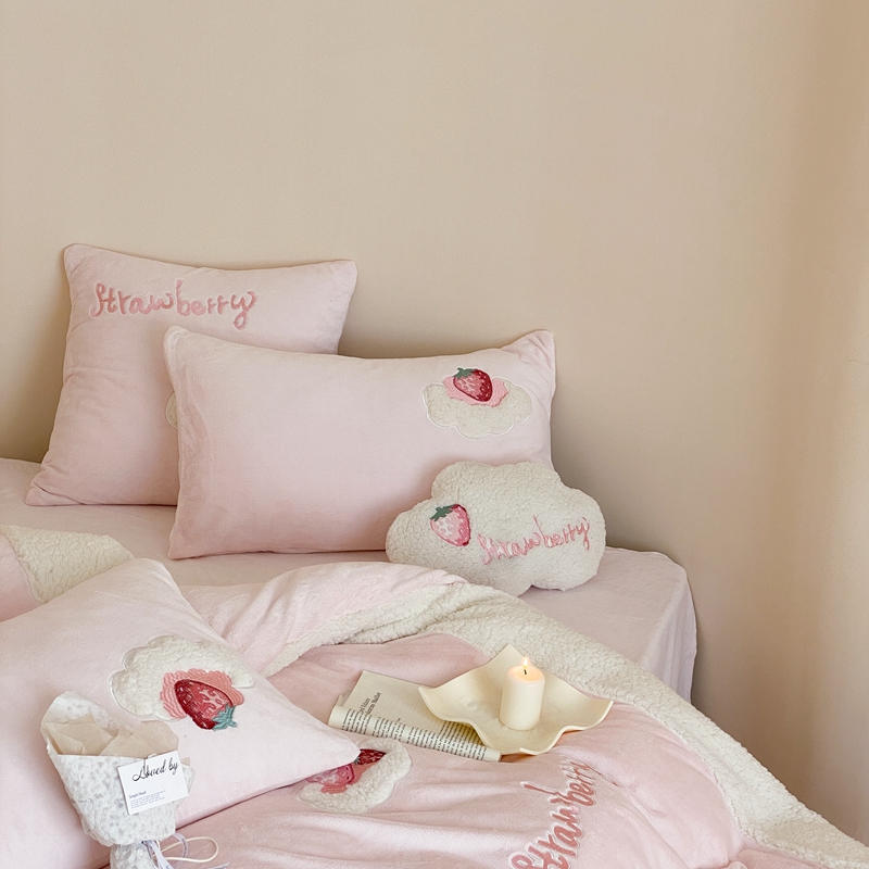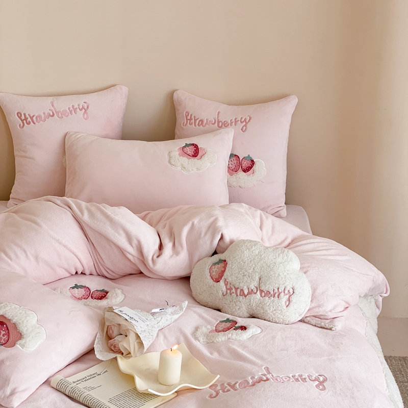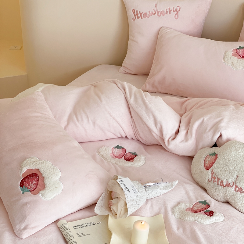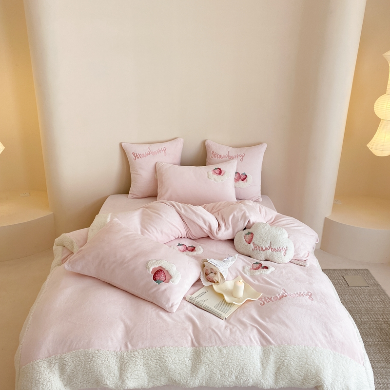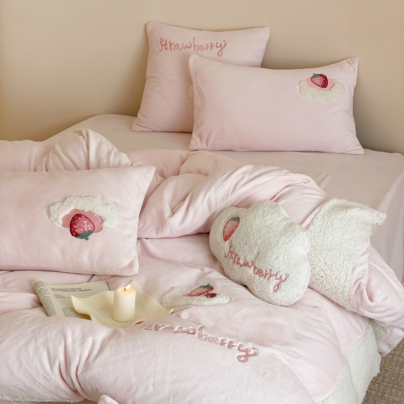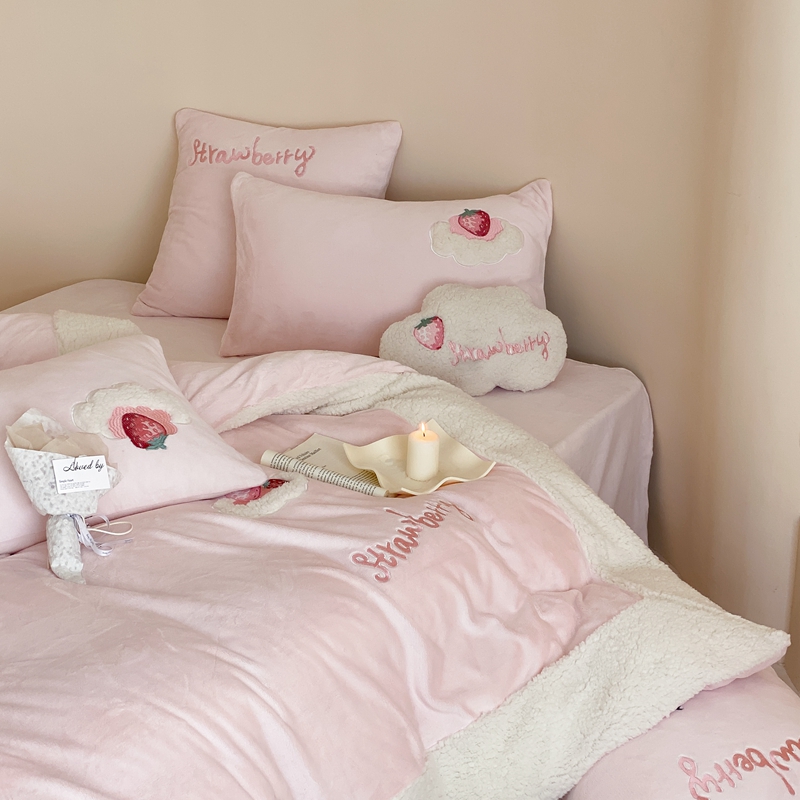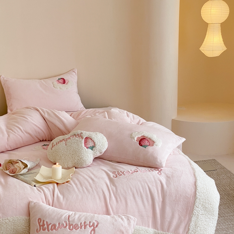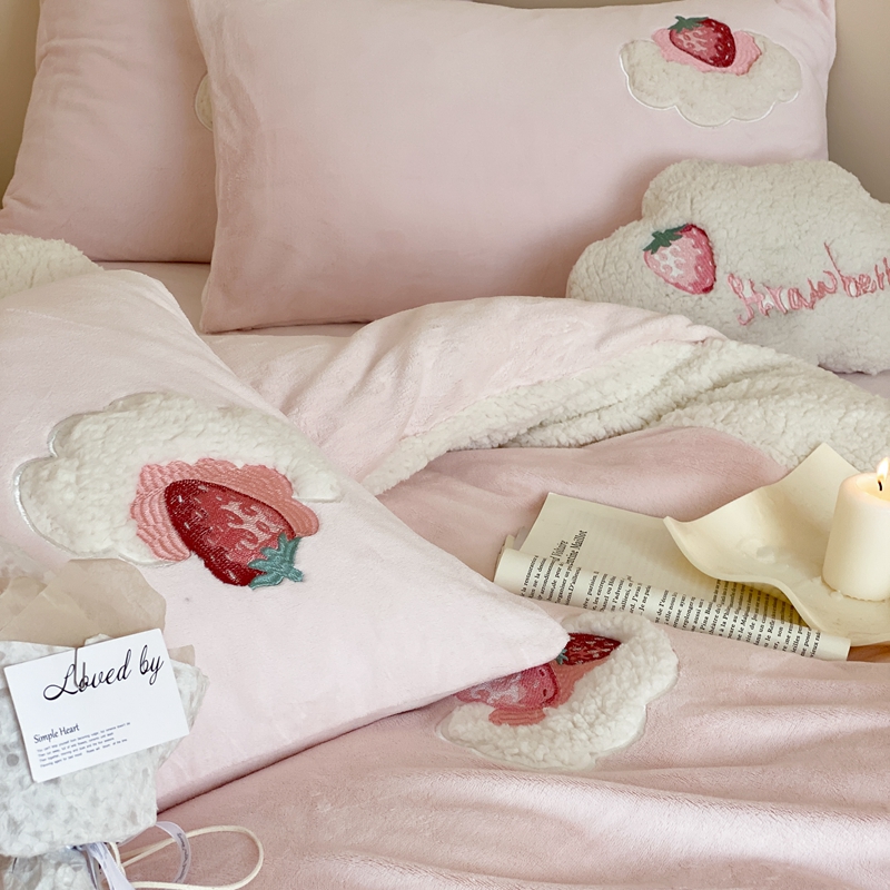 (总)星野 2023新款高克重牛奶绒羊羔绒刺绣贴布绣四件套-奶油草莓