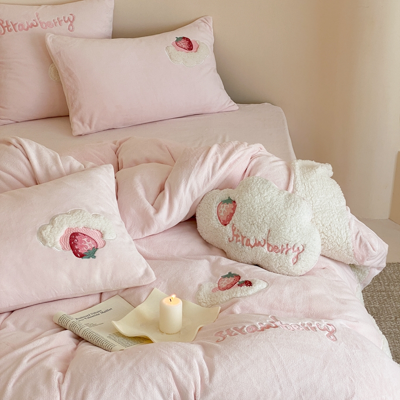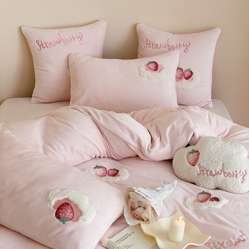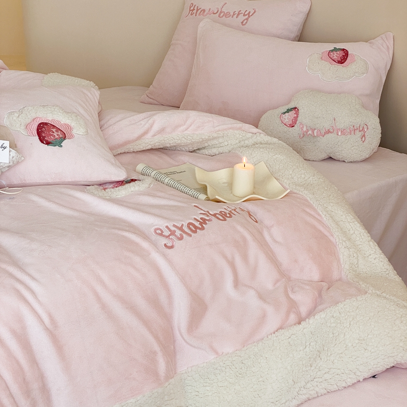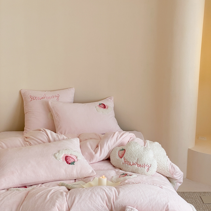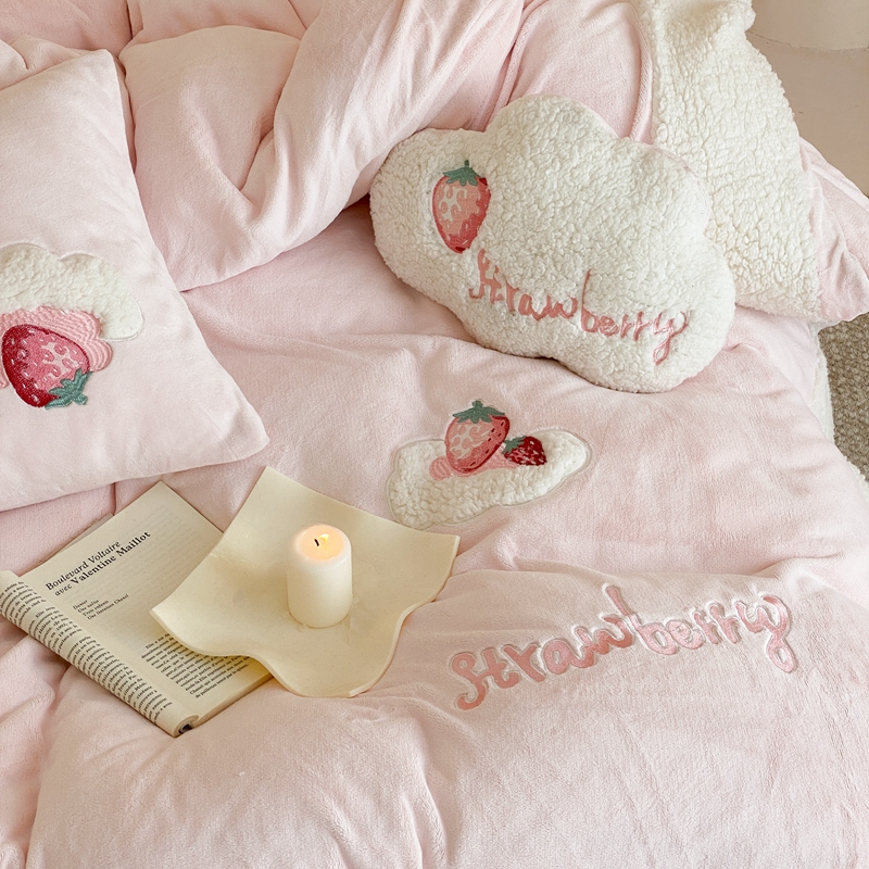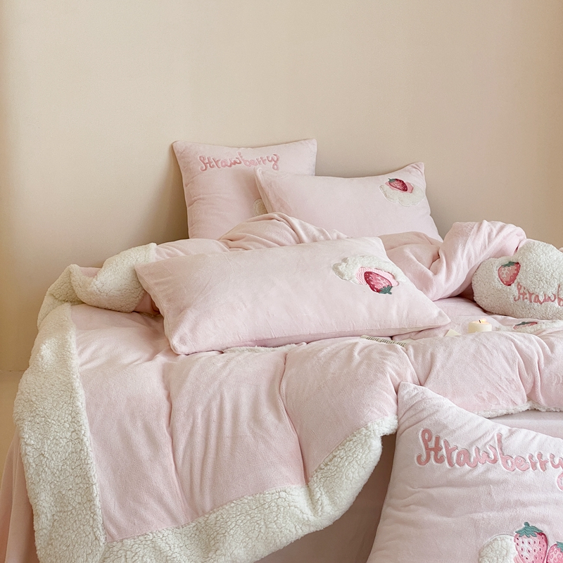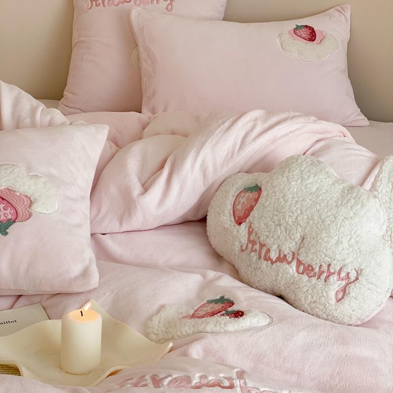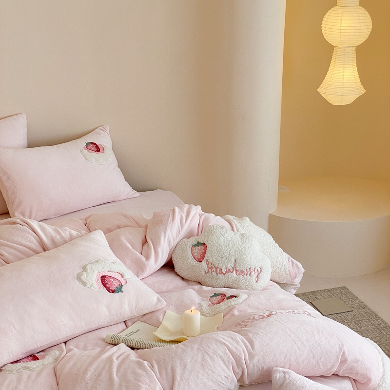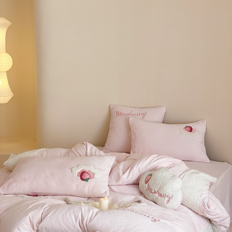 (总)星野 2023新款高克重牛奶绒羊羔绒刺绣贴布绣四件套-奶油草莓
