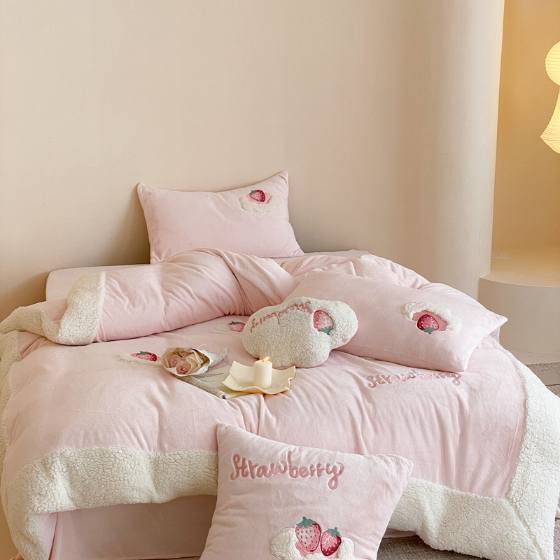 商品名称:(总)星野 2023新款高克重牛奶绒羊羔绒刺绣贴布绣四件套-奶油草莓