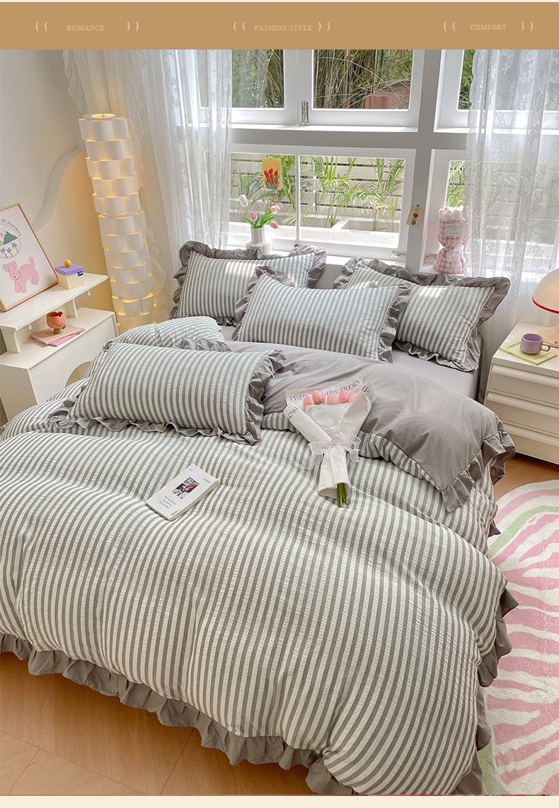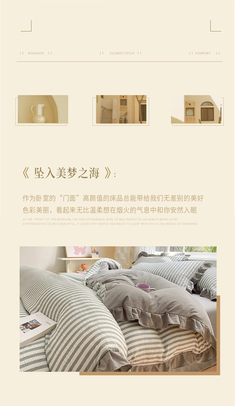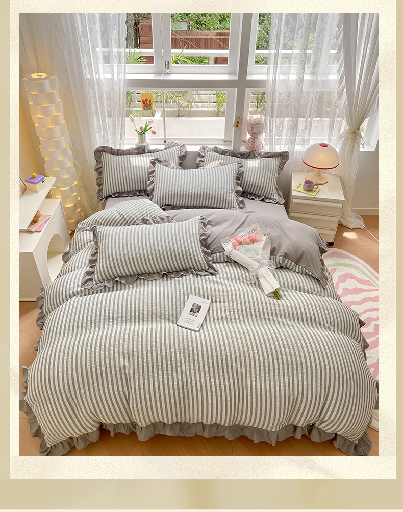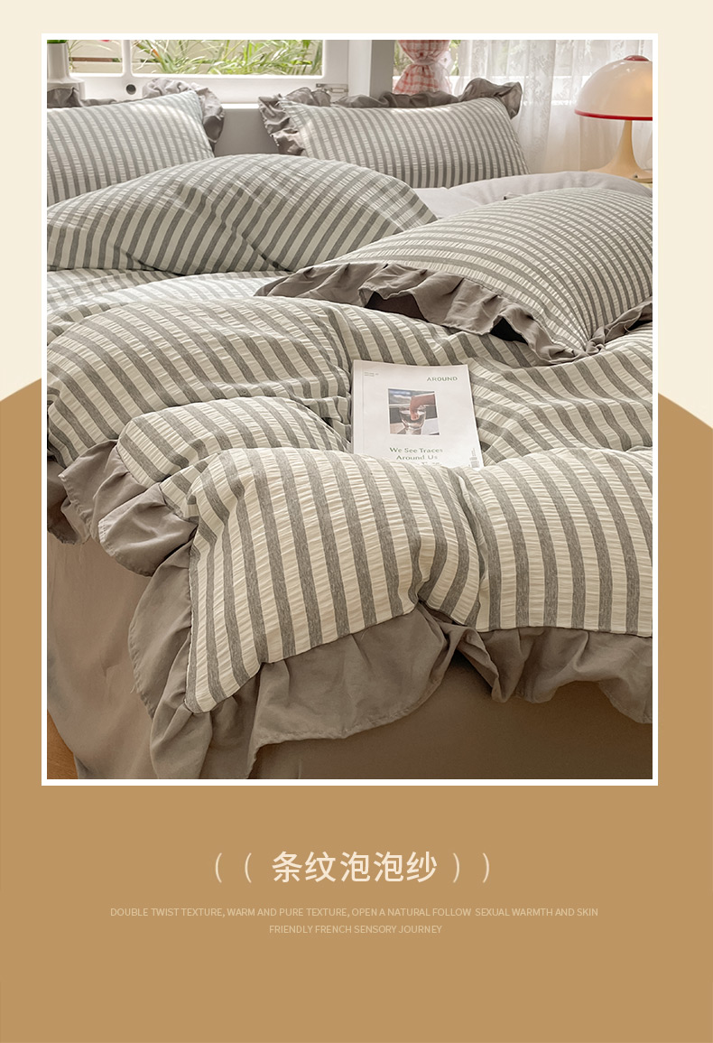商品名称:苏木年华 2024新款水洗棉竖条纹泡泡纱小清新花边四件套 泡泡纱- 浅灰