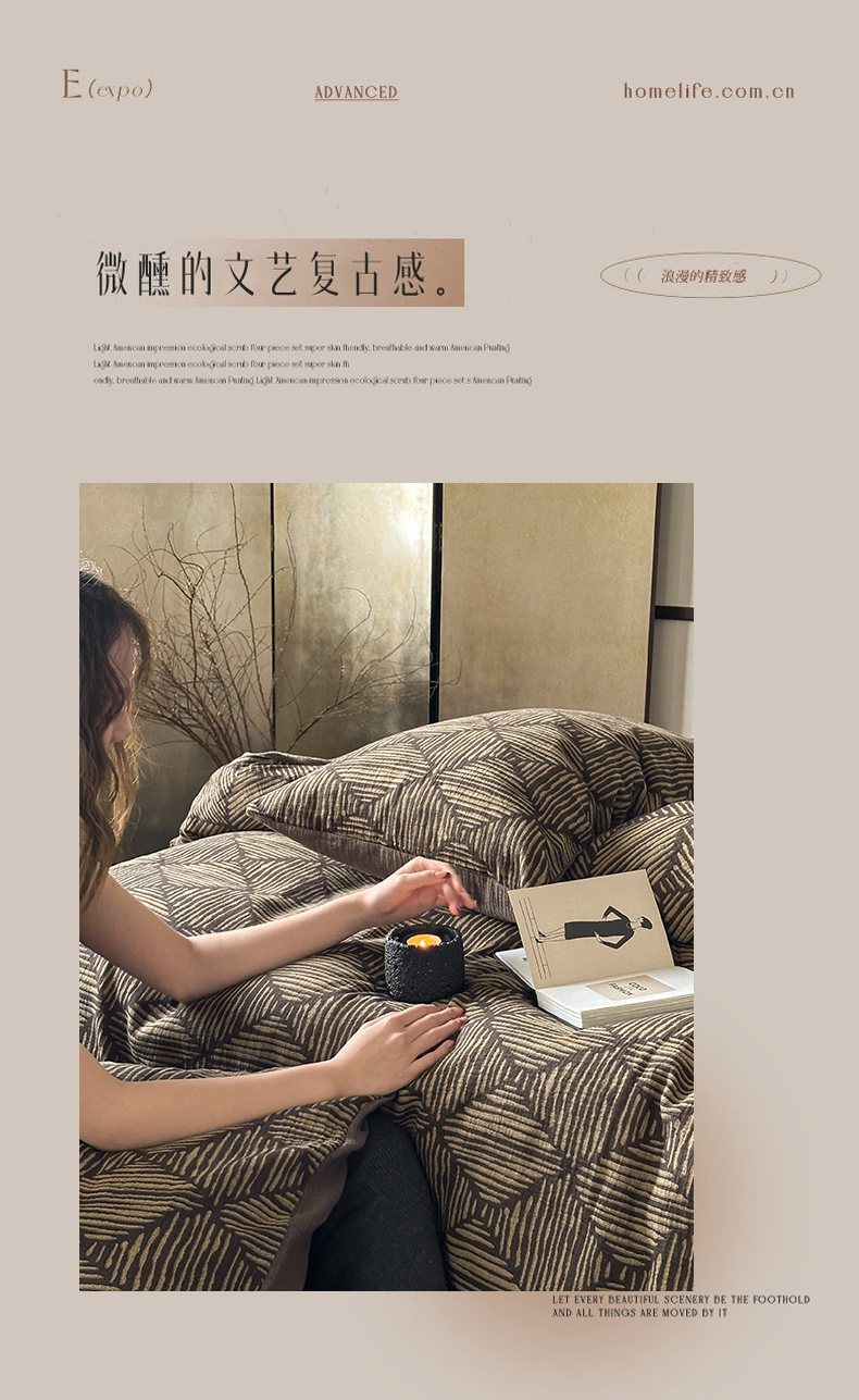 (总)山舍家居 2025新款全棉纯棉特种彩纱针刺子提花四件套-费尔岛的故事-卡其棕,费尔岛的故事-卡其棕
