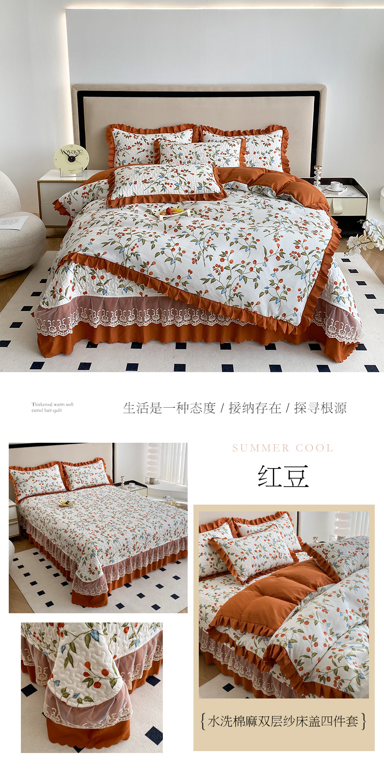 商品名称:艺慕家纺 2025新款水洗棉麻双层纱床盖四件套 红豆