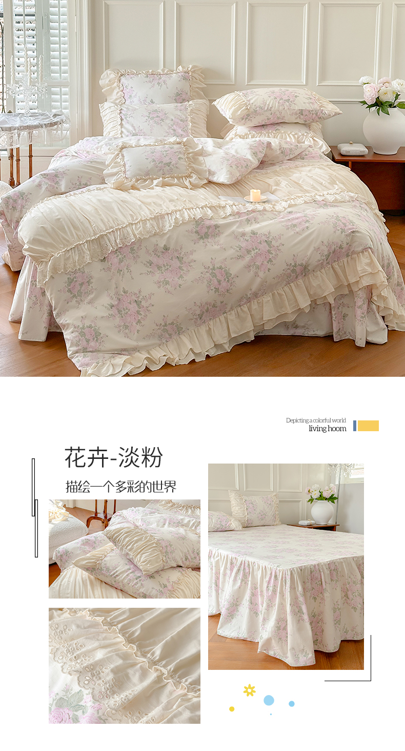 婳庭家居 2024新款法式全棉印花四件套 花卉-淡粉
