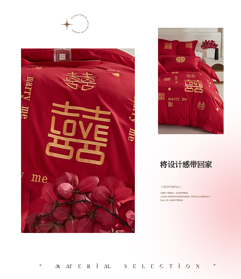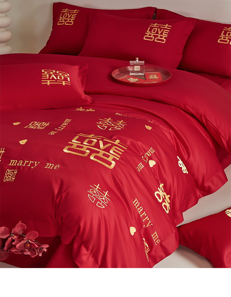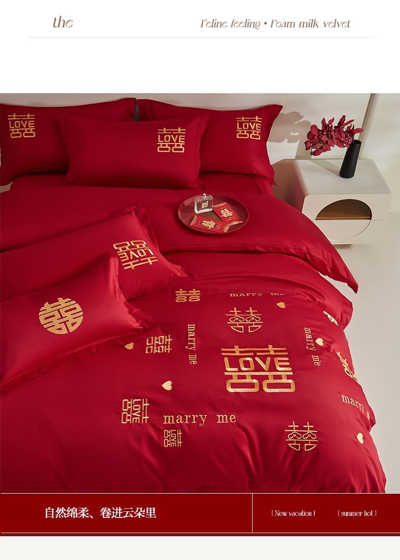 (总)欧乐蒂 2025新款婚庆款牛奶绒刺绣系列四件套-爱相随,爱相随-喜红,爱相随-金