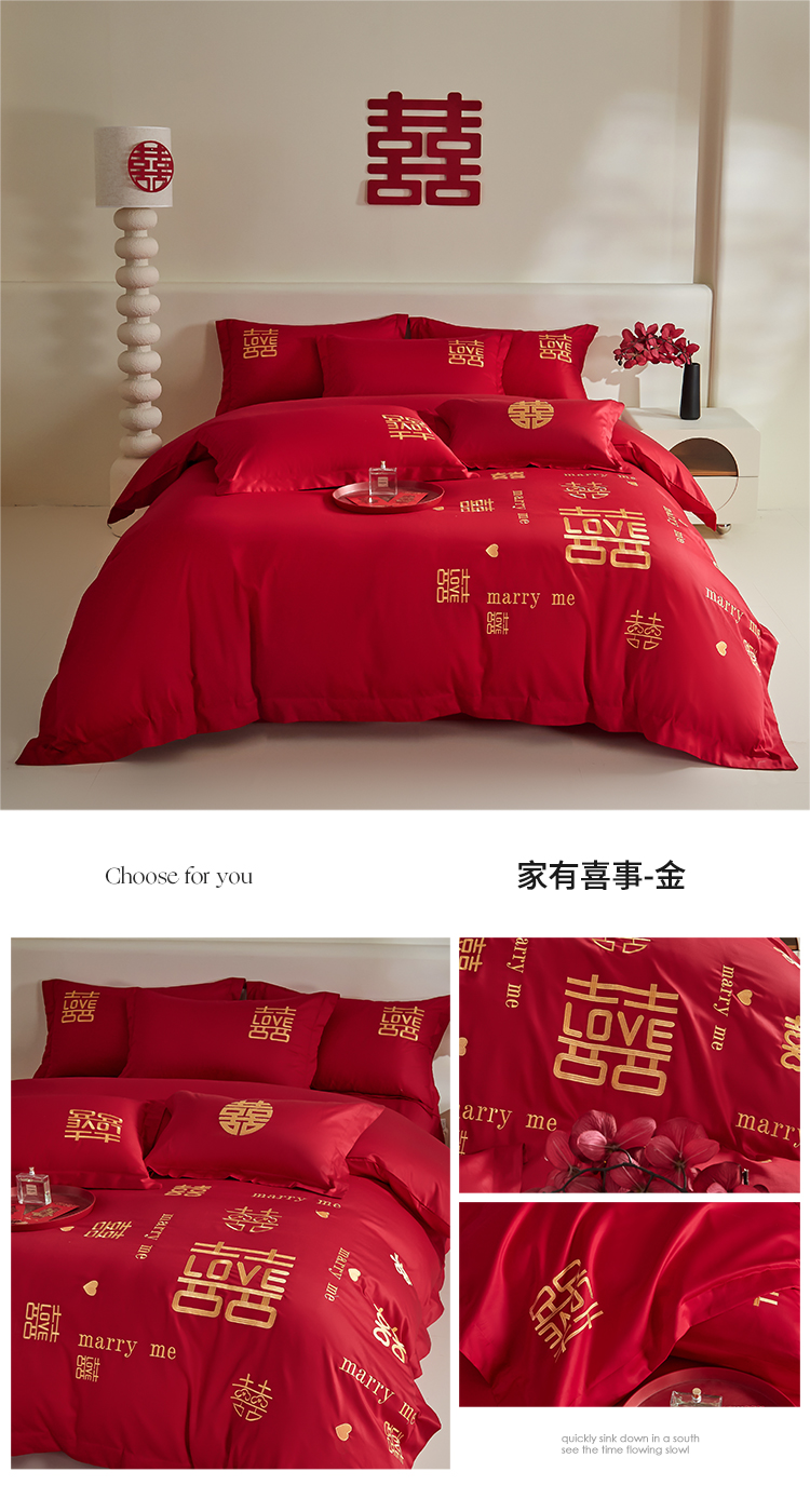 欧乐蒂 2025新款亲肤棉婚庆刺绣四件套-家有喜事 家有喜事-金