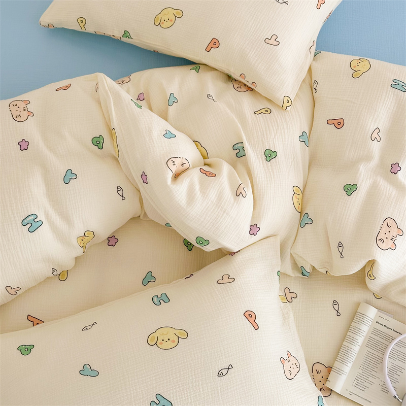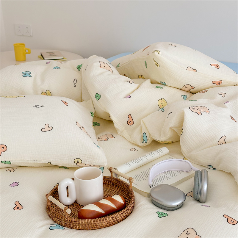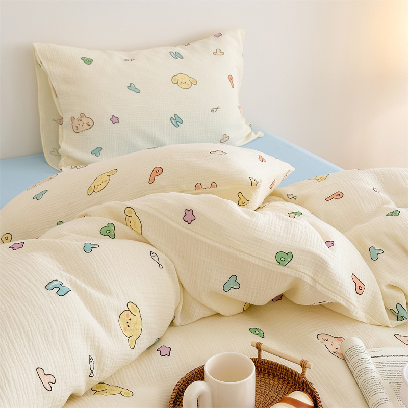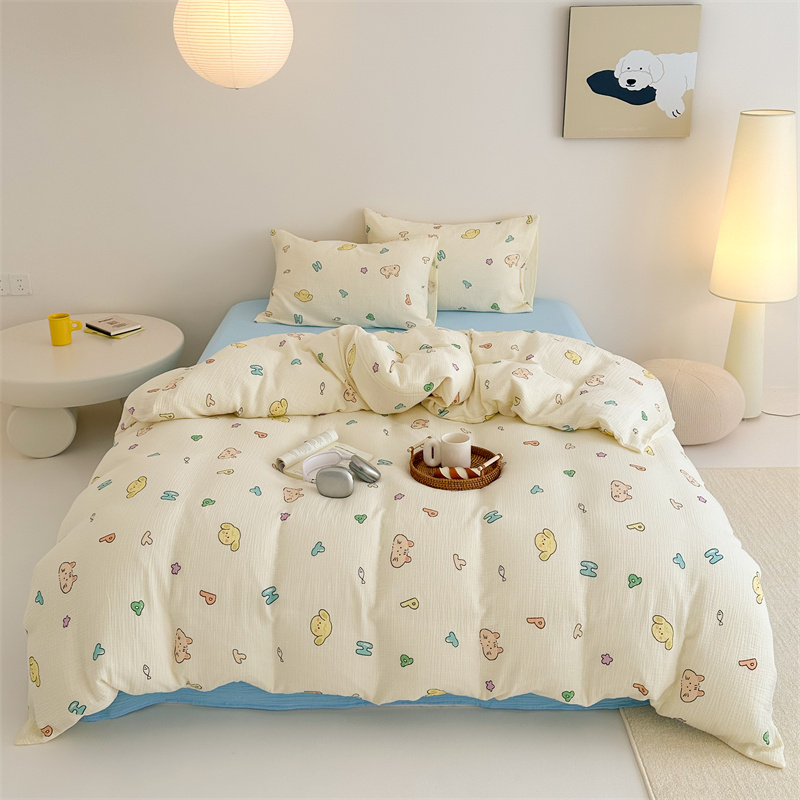 (总)珺柔家纺 2025新款全棉双层纱印花四件套,粉豹纹,焦糖小曲奇,礼物女孩,猫狗日记,奶油星空,线条苹果猫,小飞象,小狗的家,樱桃,樱桃西高地