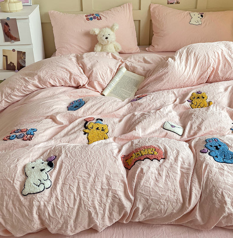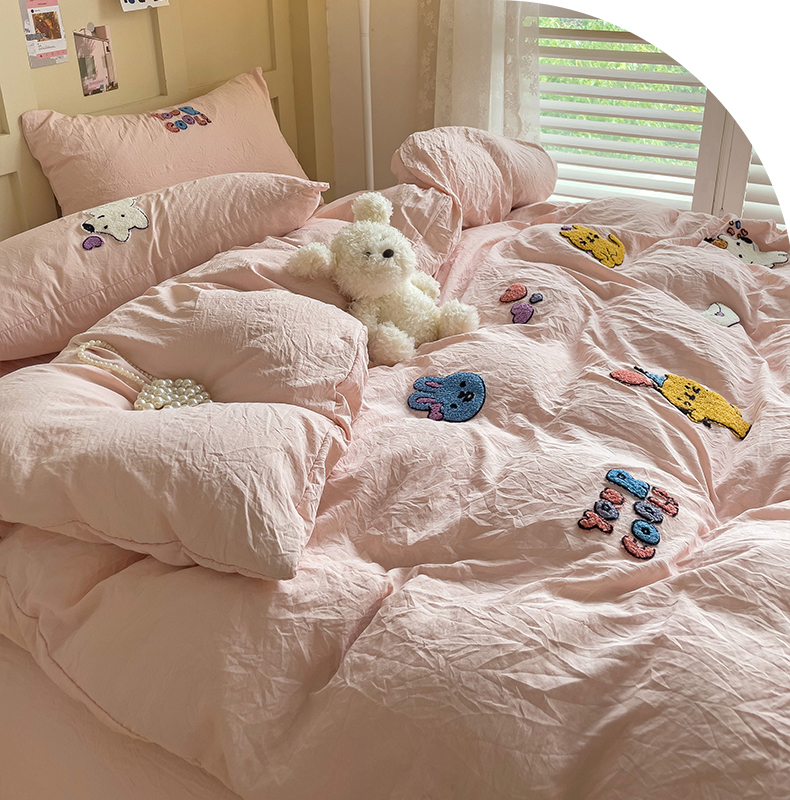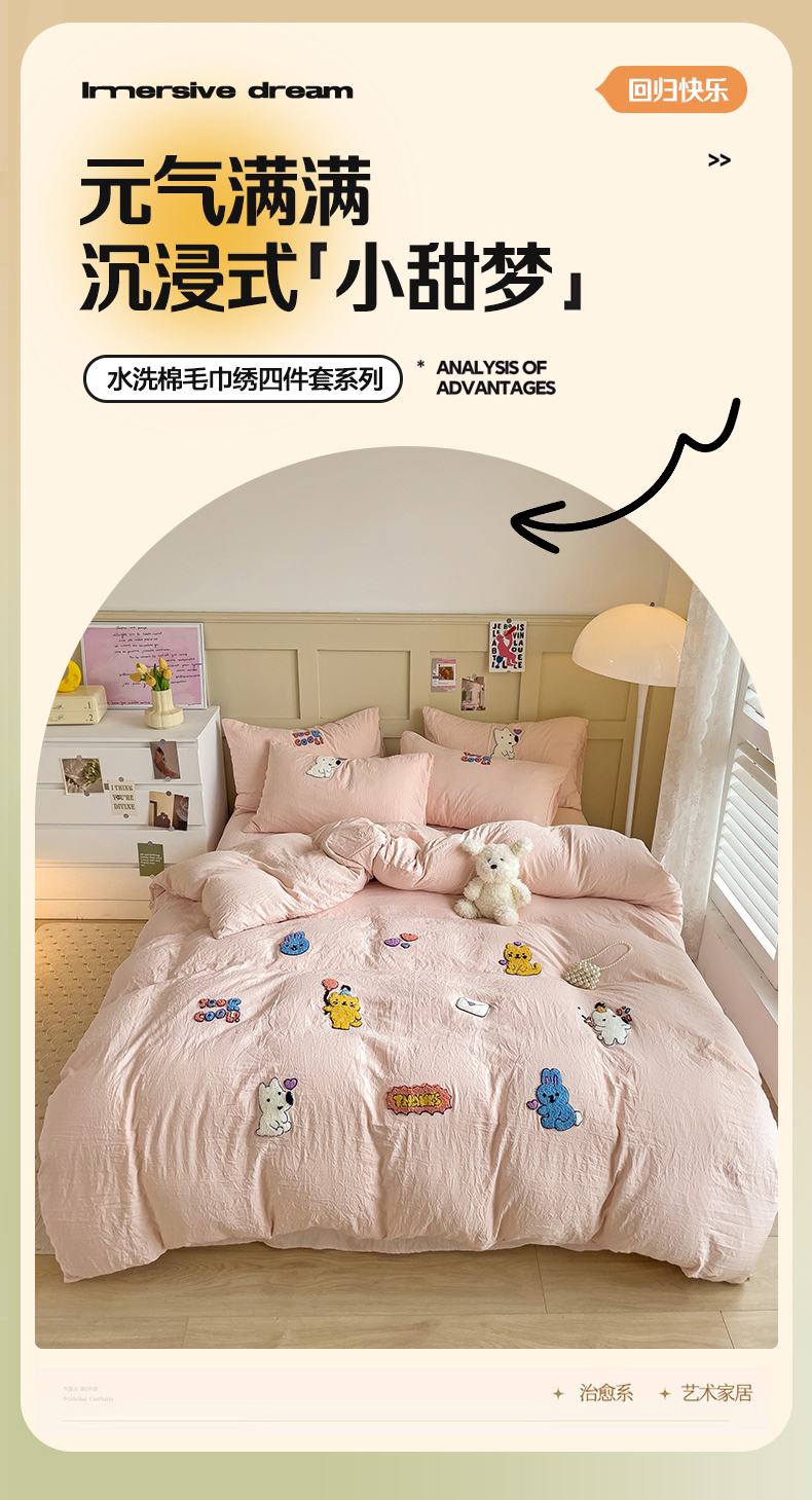 当前位置: 91家纺网 > 商品网购 > 床品套件 > 四件套 > 水洗棉四件套 > 韩巢家纺 2024新款四季通用超柔水洗棉毛巾绣四件套-动物乐园系列(提供卖家秀) 动物乐园浅粉