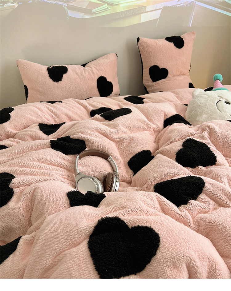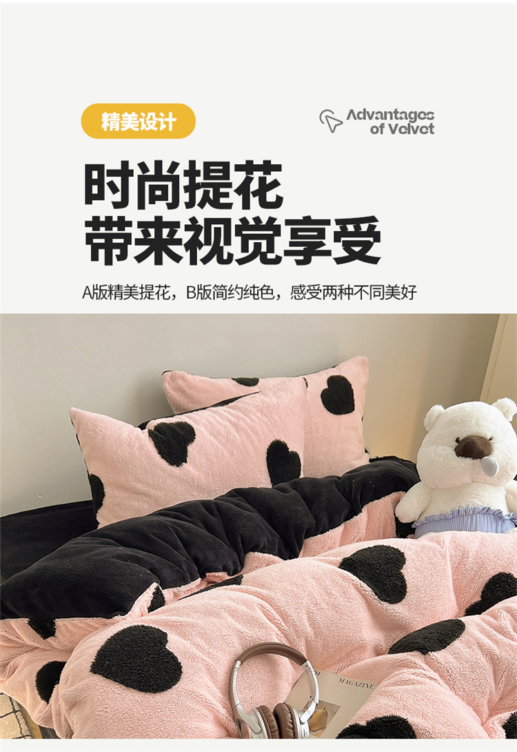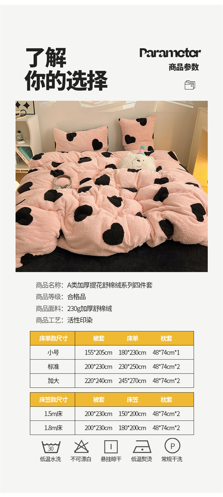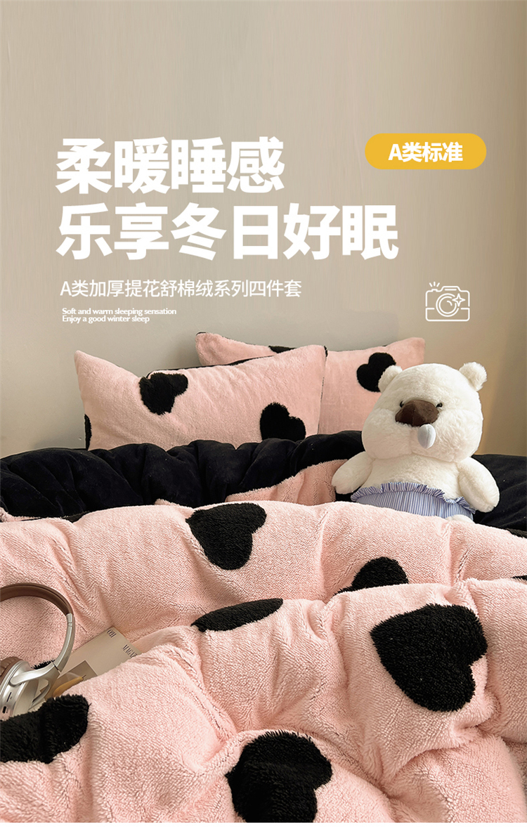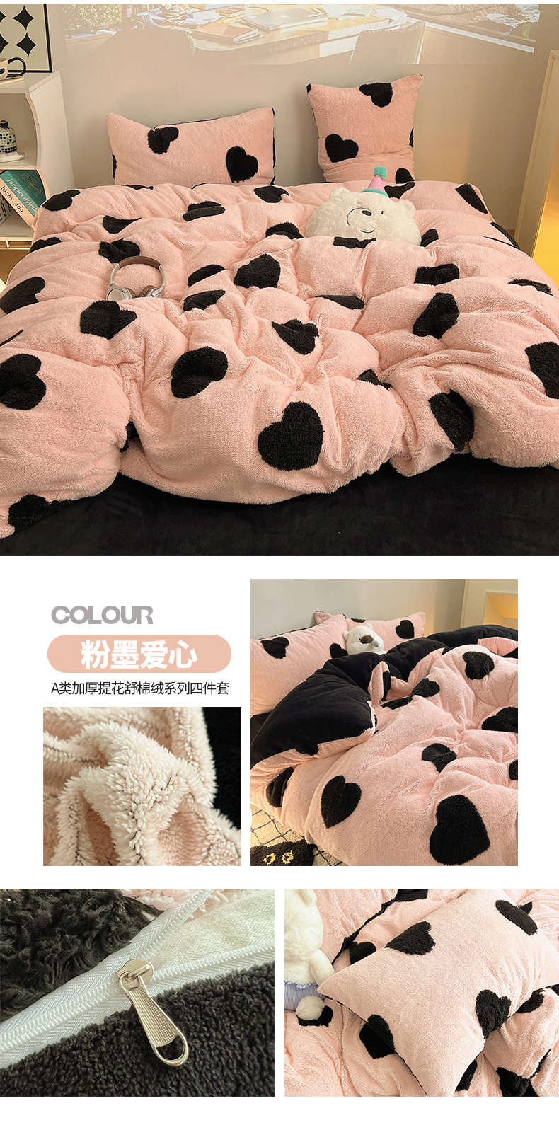 当前位置: 91家纺网 > 商品网购 > 床品套件 > 四件套 > 牛奶绒四件套 > 2024新款A类加厚色纱舒舒绒提花蝴蝶结爱心少女舒棉绒牛奶绒系列四件套 舒棉绒提花-粉墨爱心