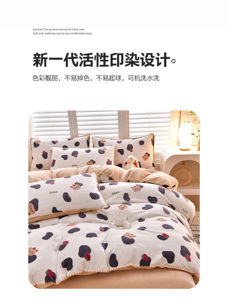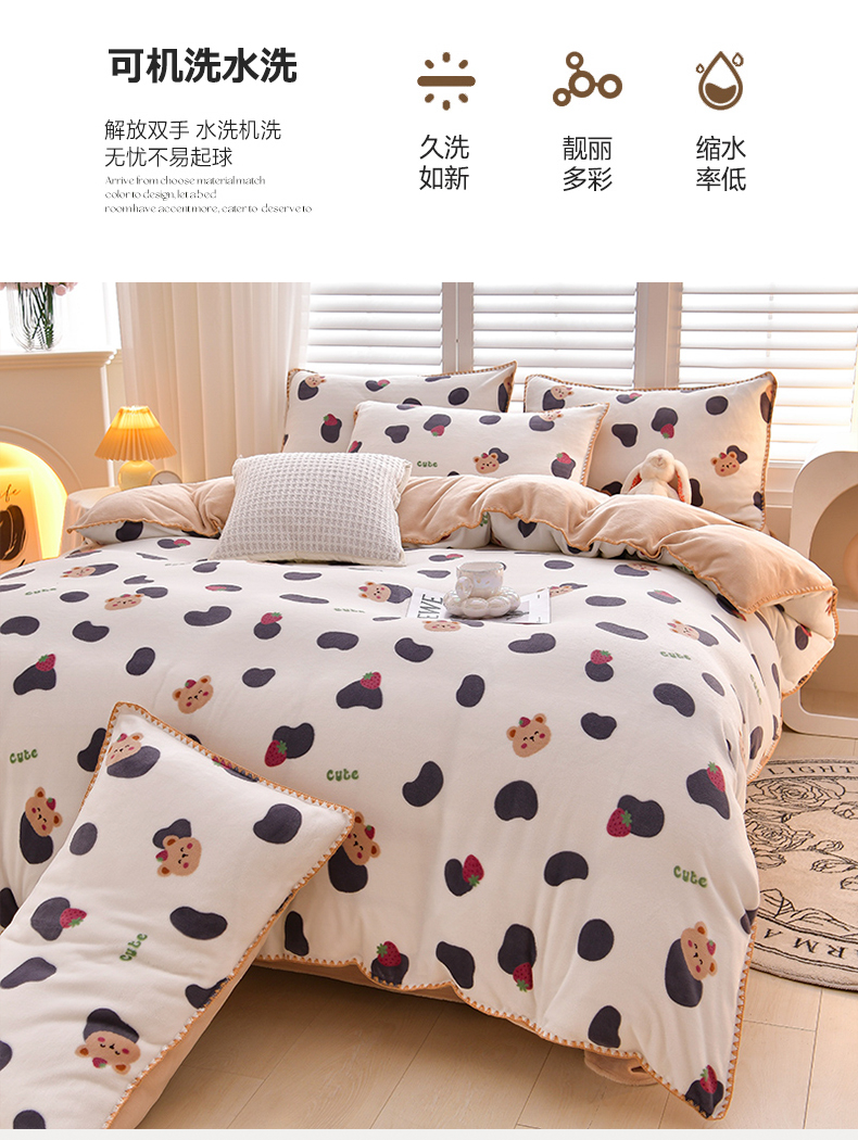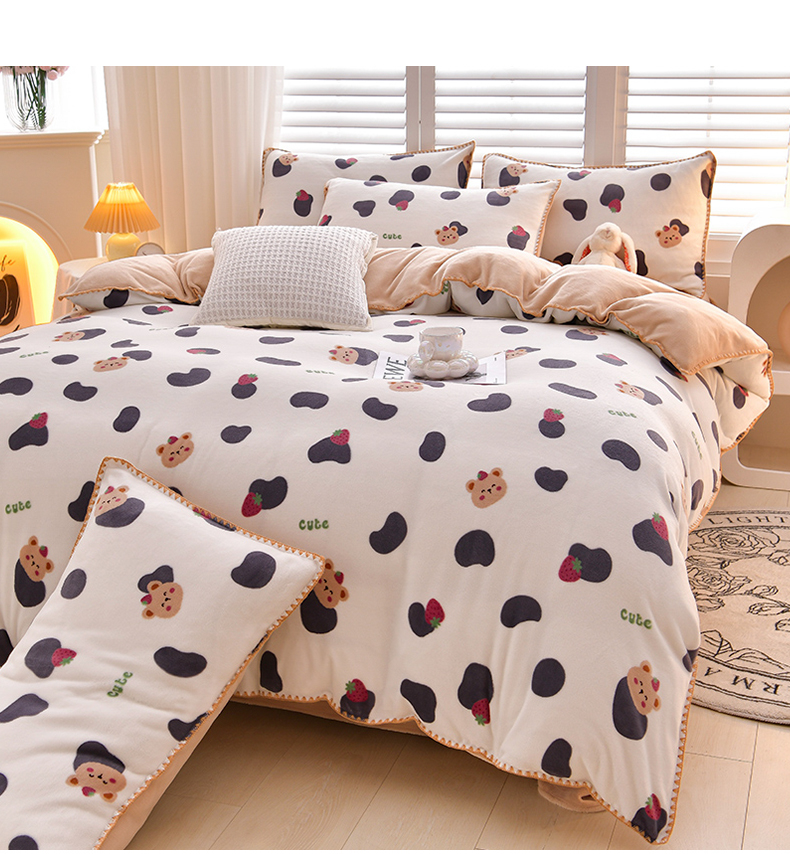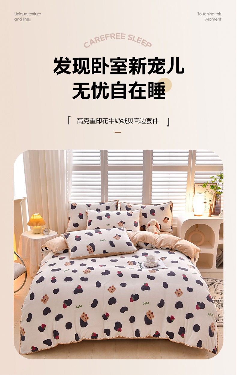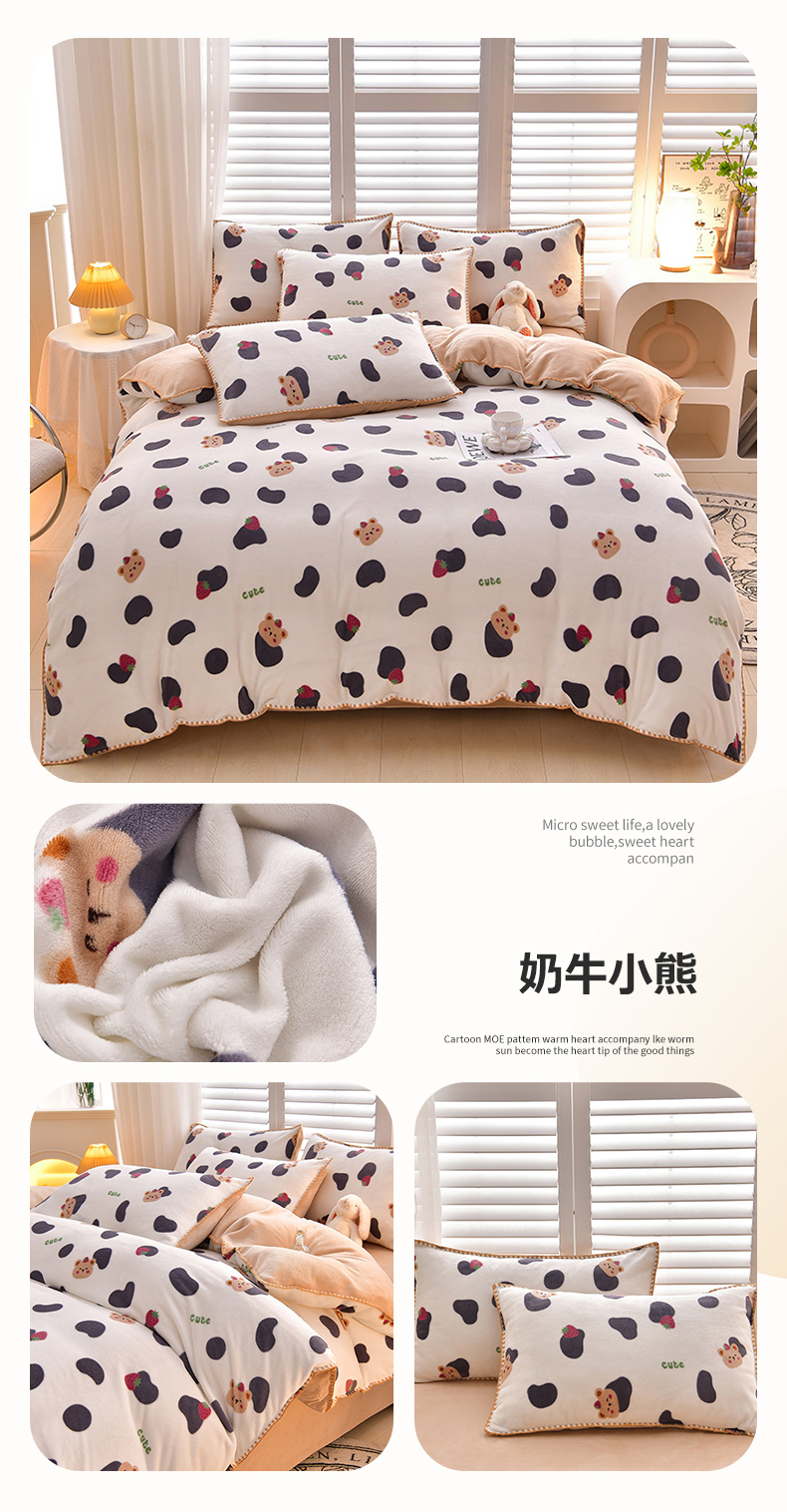 当前位置: 91家纺网 > 商品网购 > 床品套件 > 四件套 > 牛奶绒四件套 > 菡宝 2024新款高克重印花贝壳边牛奶绒四件套 奶牛小熊