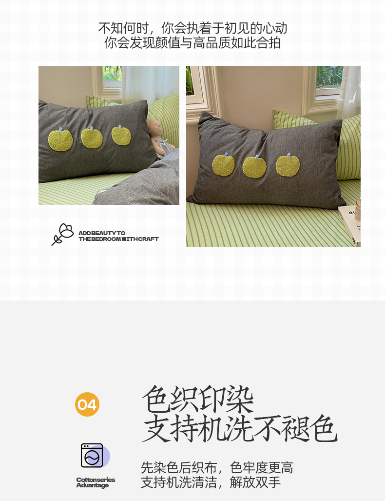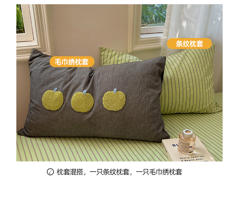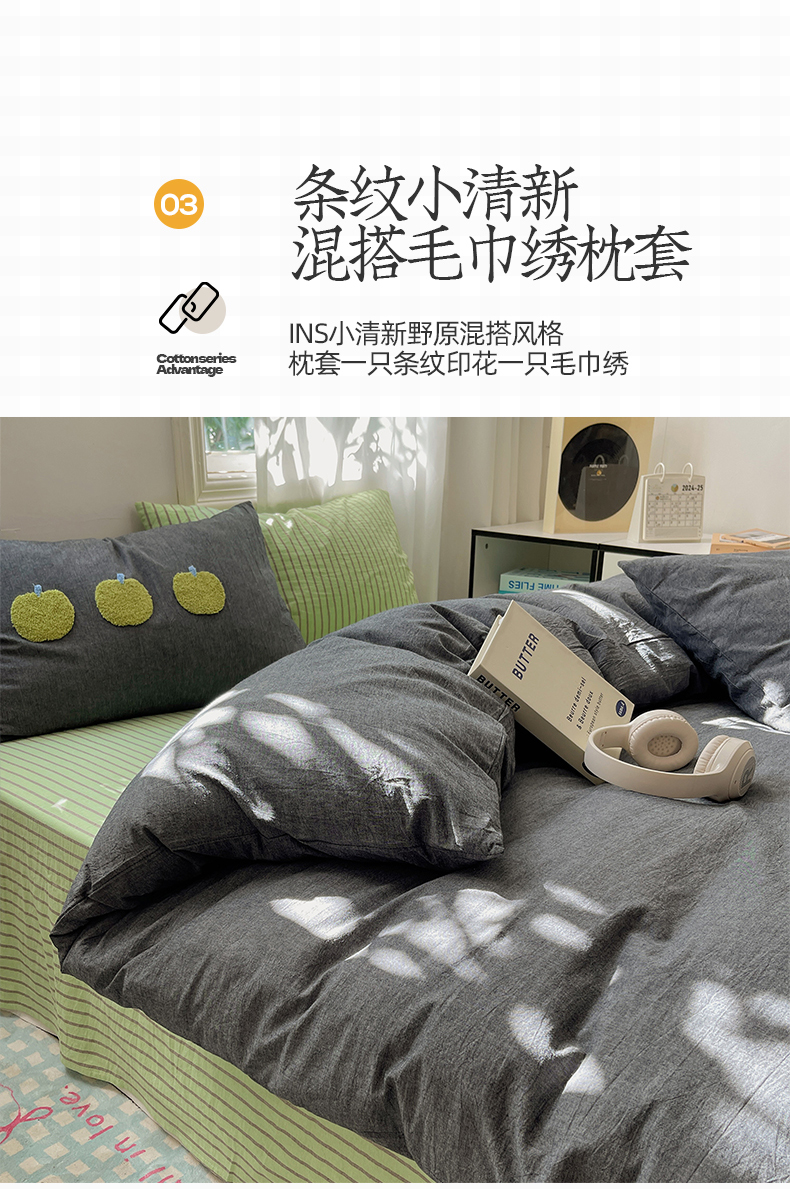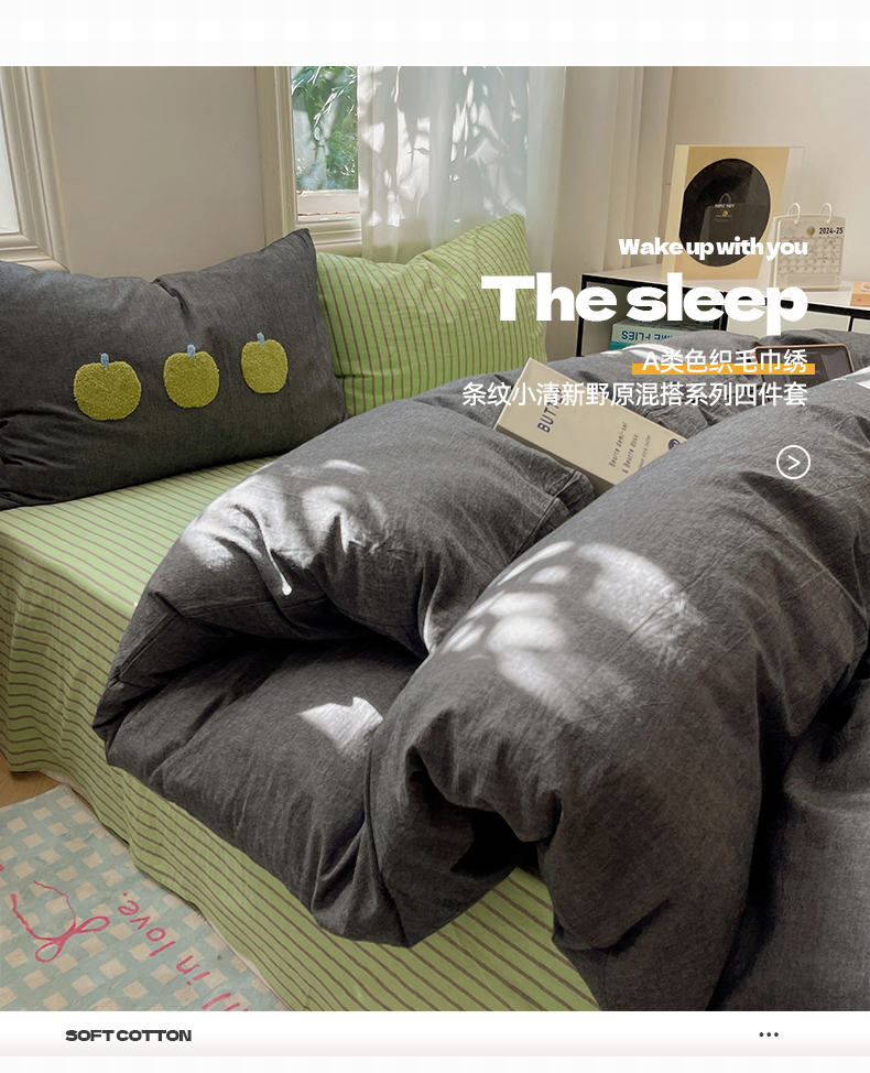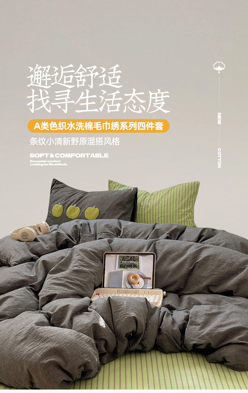 当前位置: 91家纺网 > 商品网购 > 床品套件 > 四件套 > 其它四件套 > 桃子家居 2024新款A类色织毛巾绣条纹小清新野原混搭纯棉系列四件套 色织水洗棉-苹果灰绿