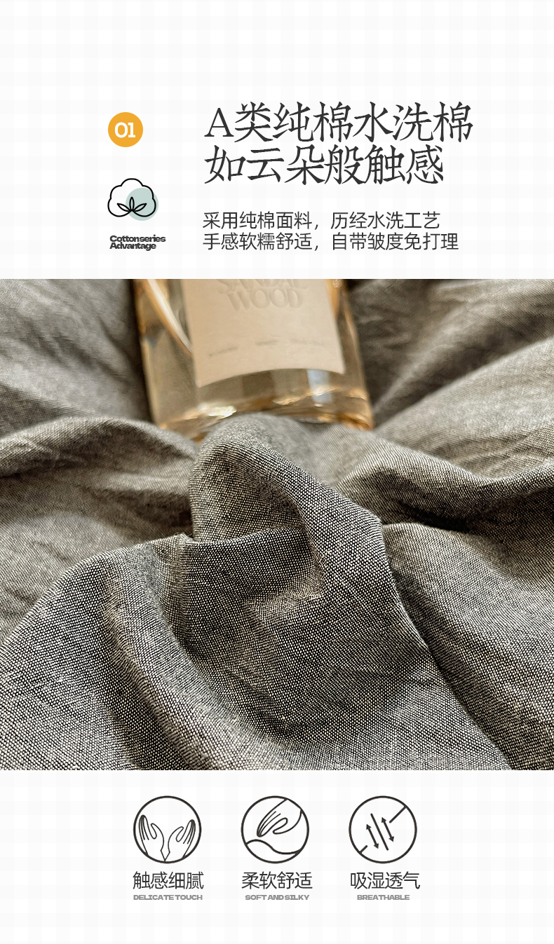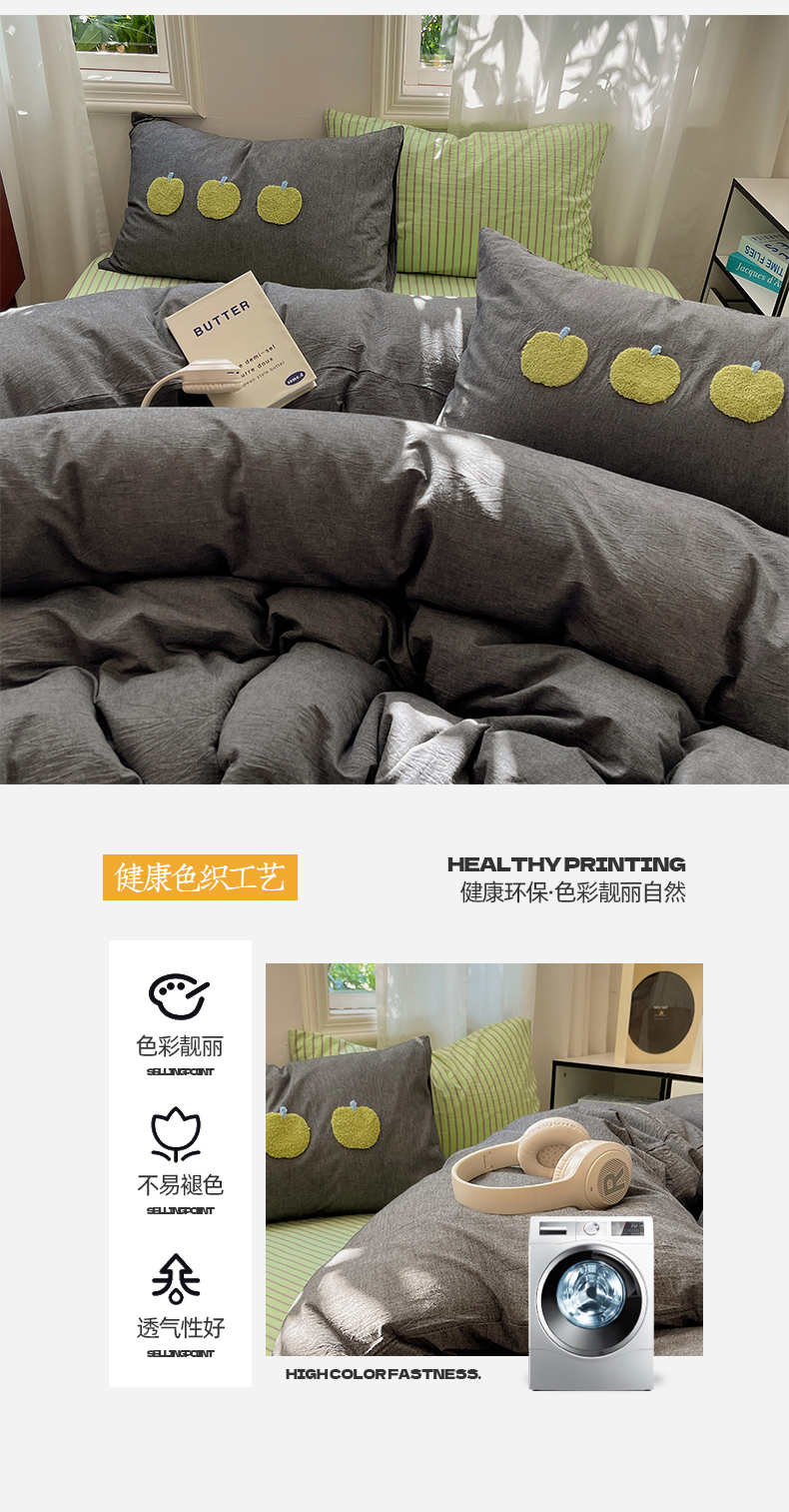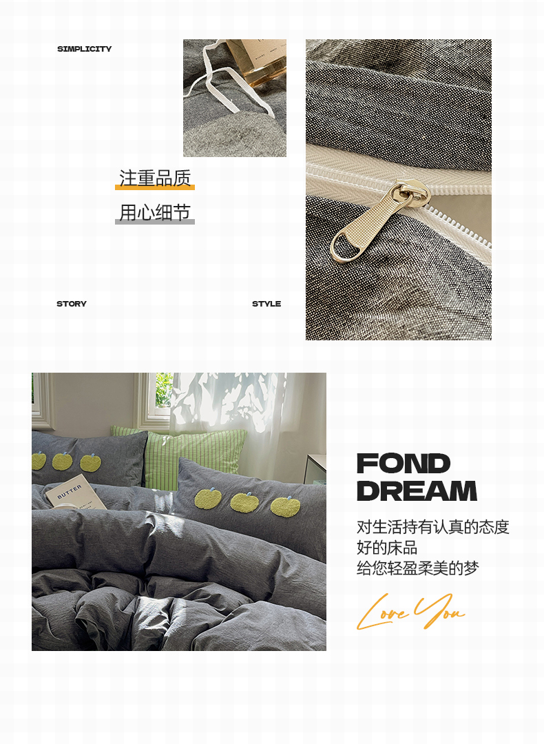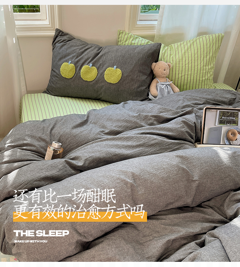 当前位置: 91家纺网 > 商品网购 > 床品套件 > 四件套 > 其它四件套 > 桃子家居 2024新款A类色织毛巾绣条纹小清新野原混搭纯棉系列四件套 色织水洗棉-苹果灰绿