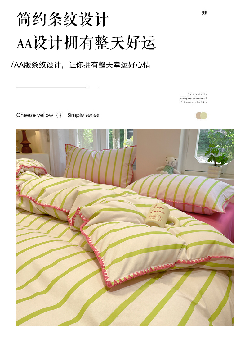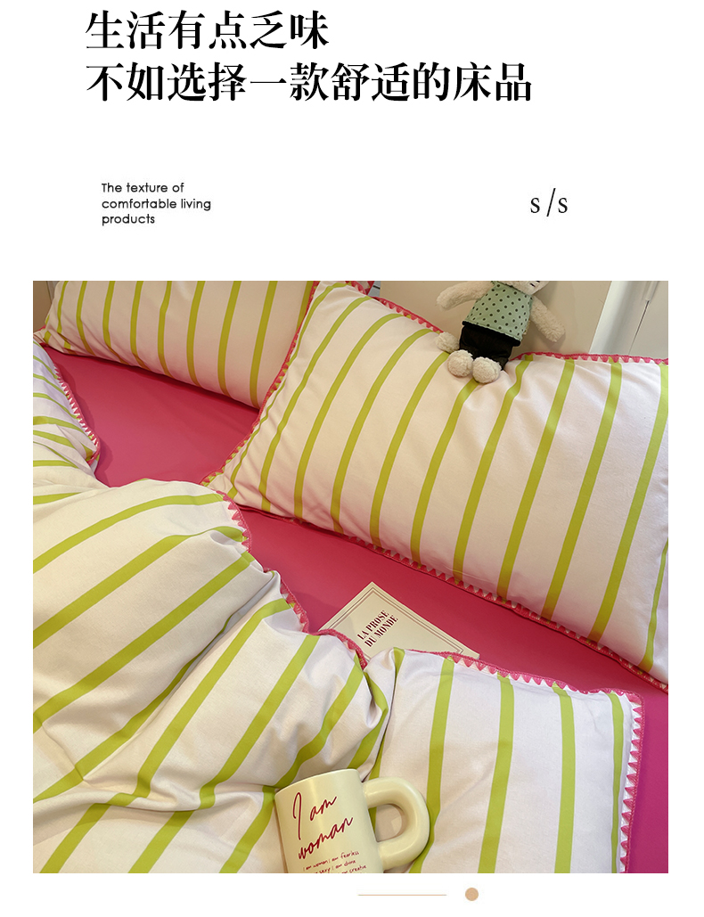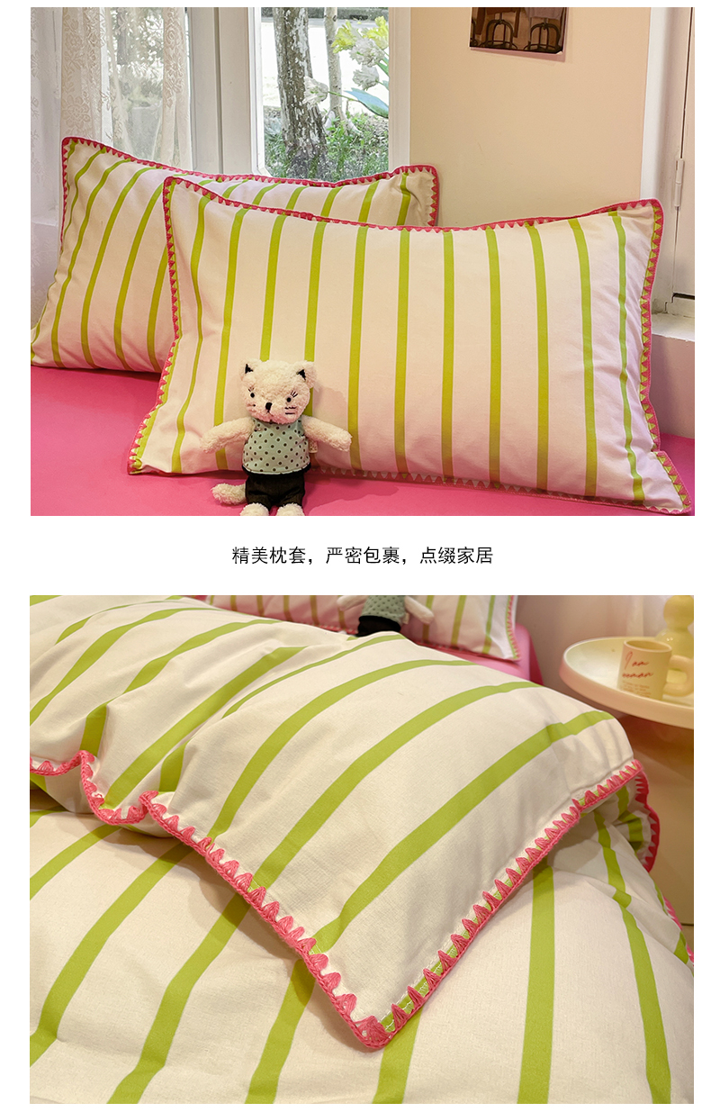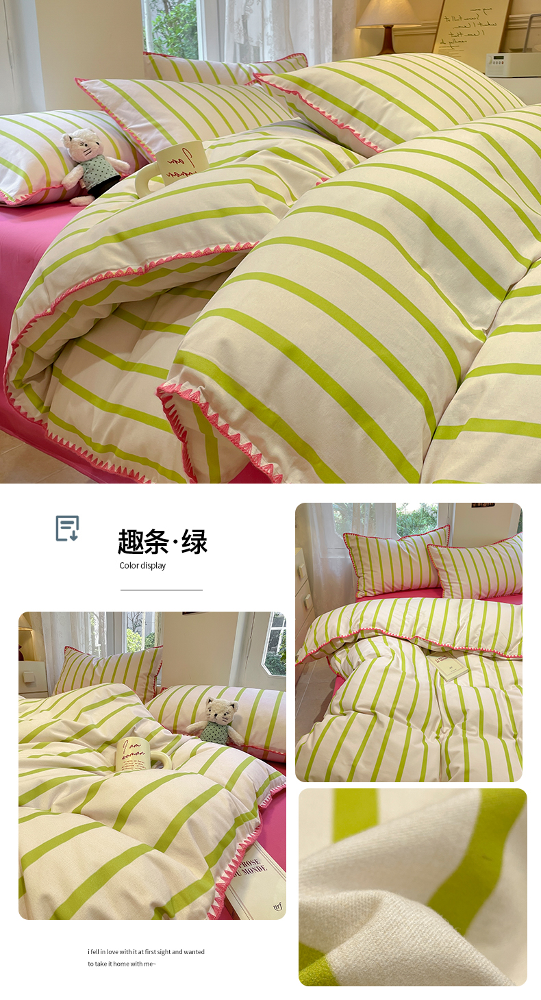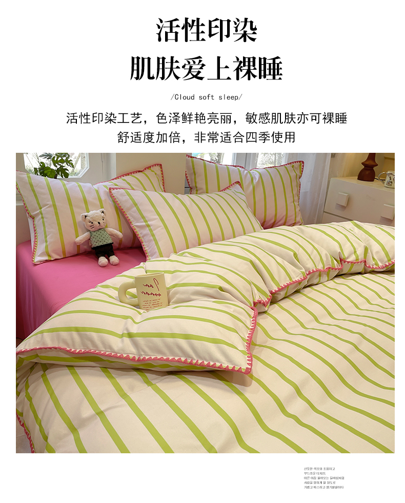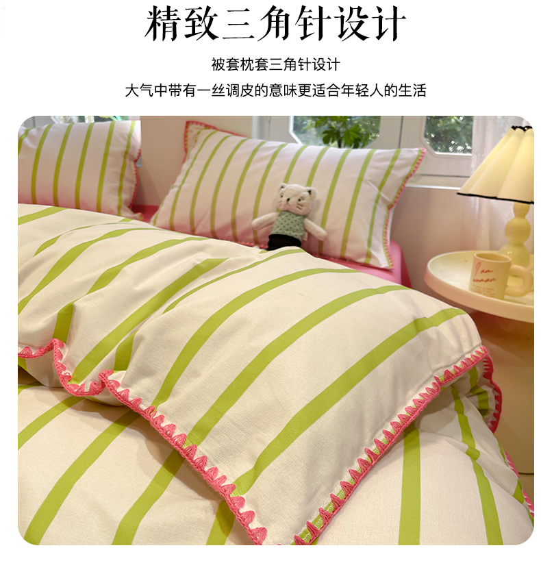 卧趣家纺 2024秋冬新品全棉磨毛四件套ins小清新三角针包边系列-风格二 趣条-绿