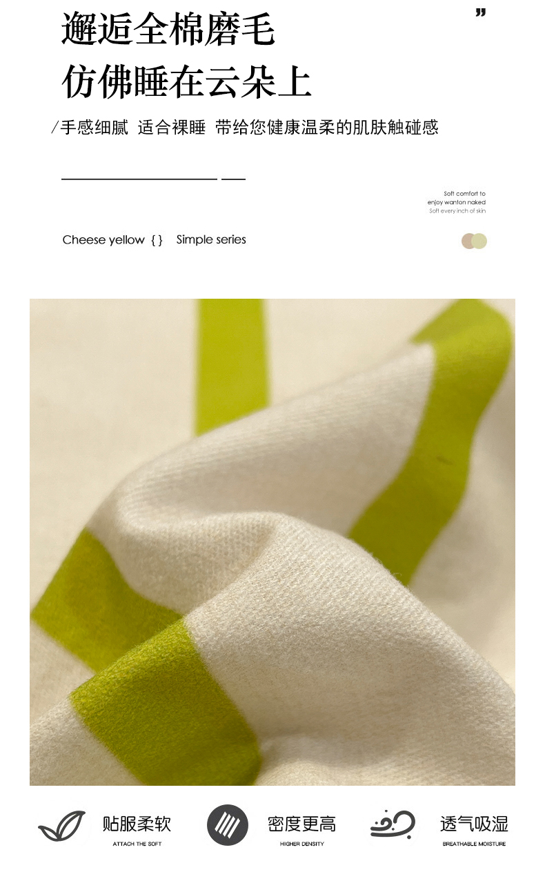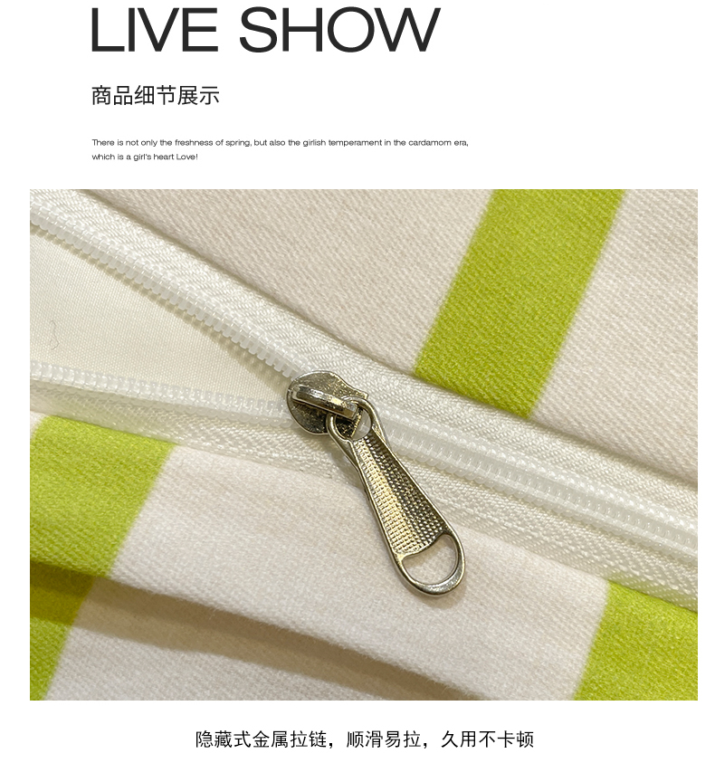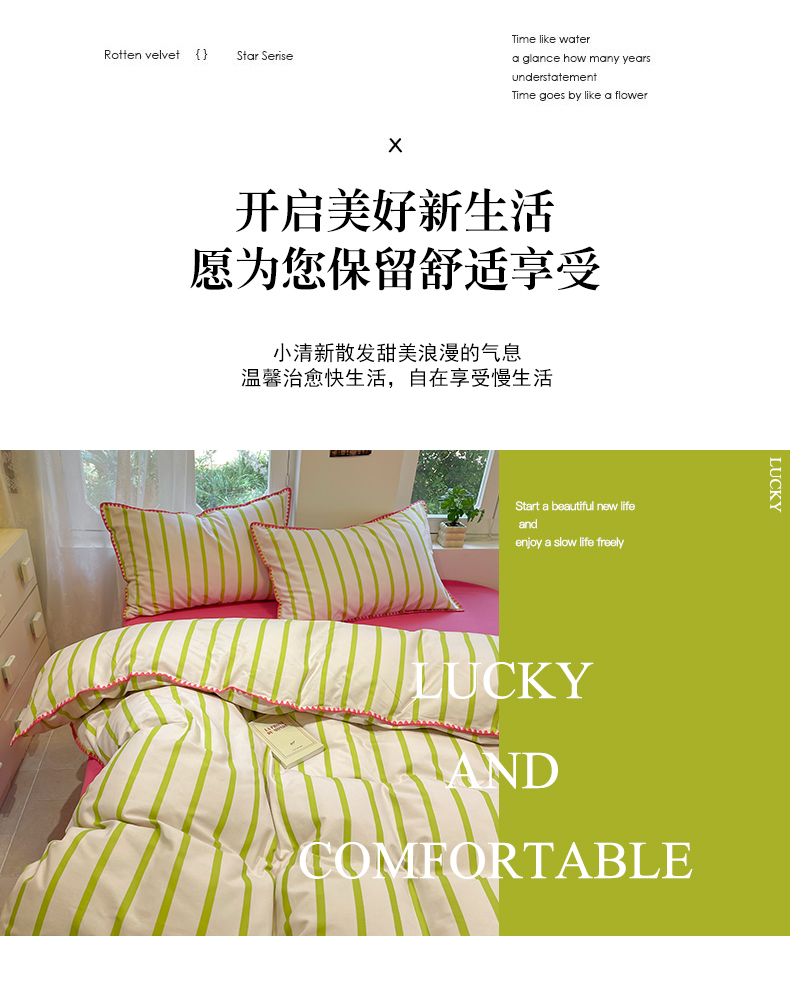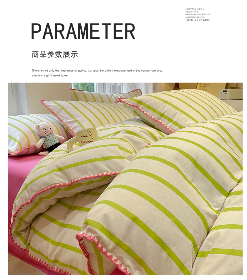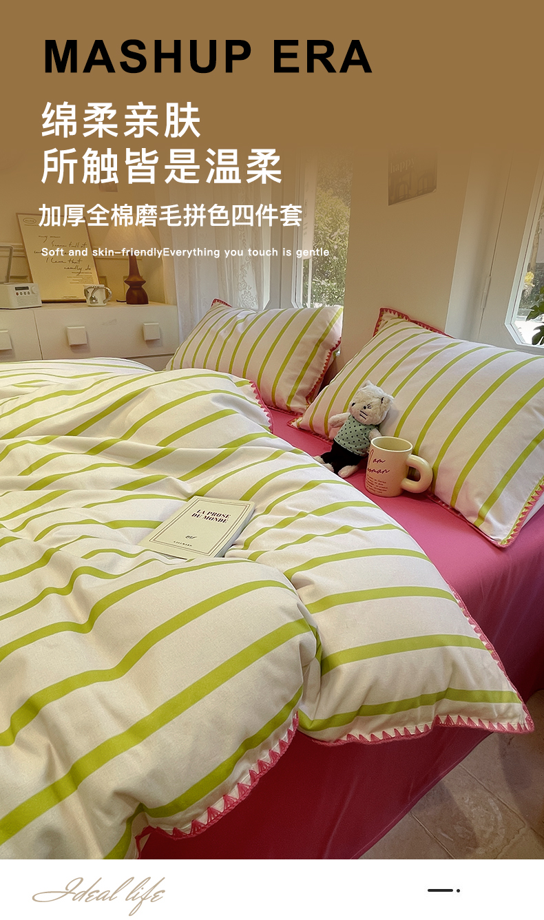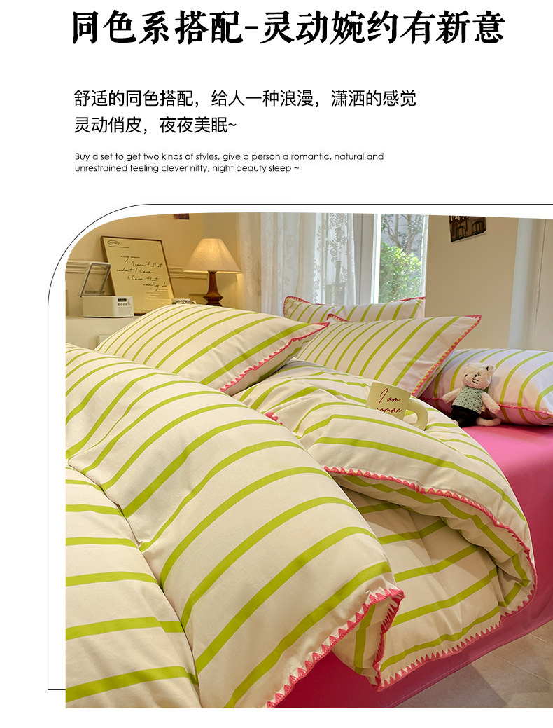 卧趣家纺 2024秋冬新品全棉磨毛四件套ins小清新三角针包边系列-风格二 趣条-绿