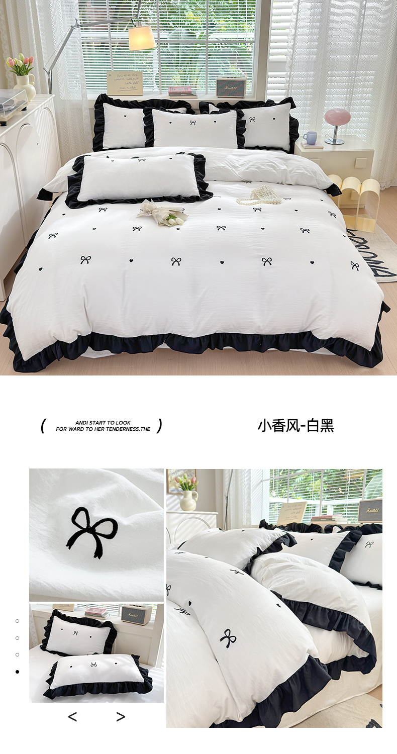 当前位置: 91家纺网 > 商品网购 > 床品套件 > 四件套 > 水洗棉四件套 > 慕希家纺 2024新款精品刺绣韩版水洗棉四件套-小香风 小香风-白黑