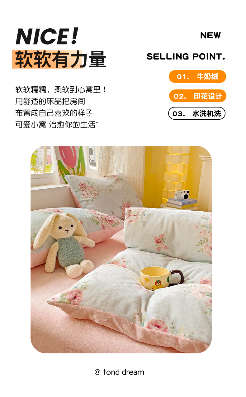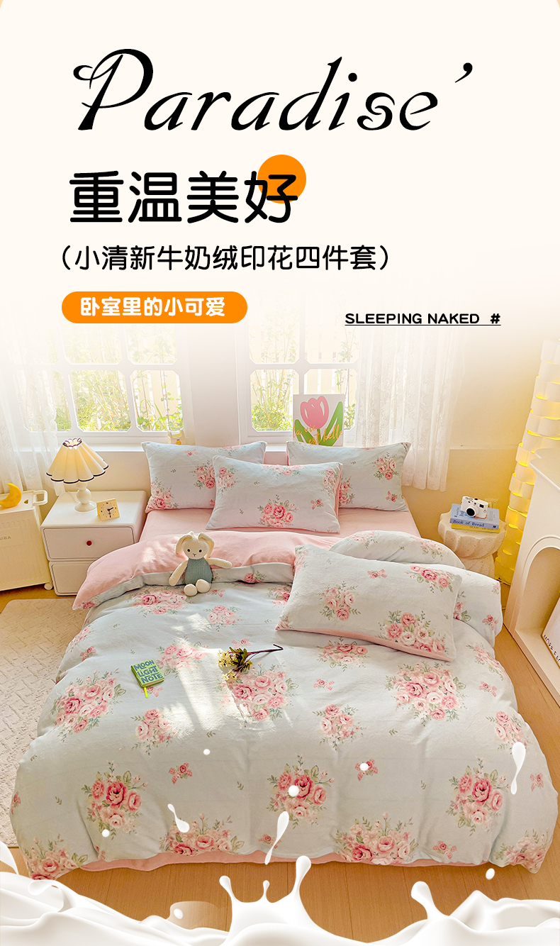 当前位置: 91家纺网 > 商品网购 > 床品套件 > 四件套 > 牛奶绒四件套 > 优选良品 2025新款小清新加厚高克重牛奶绒四件套直播热款电商热款 玫瑰庄园