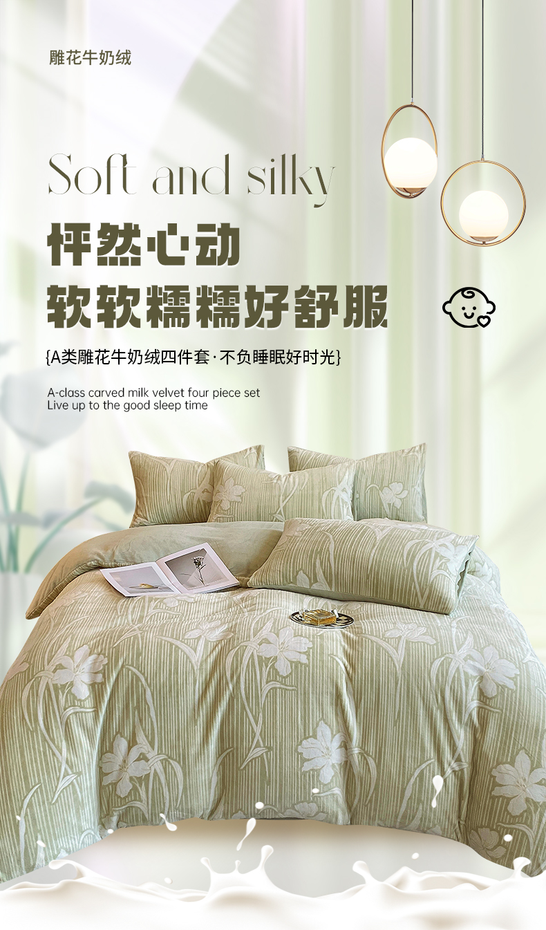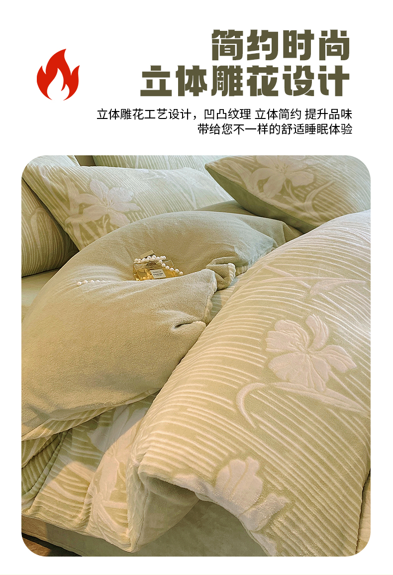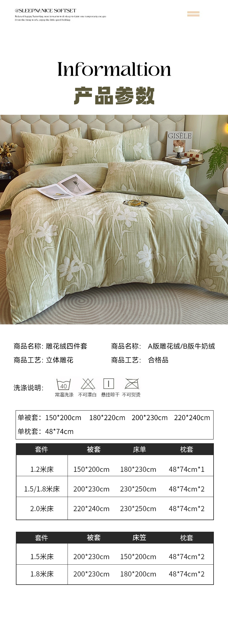 商品名称:佰亿莱 2024新款雕花牛奶绒四件套 绿意盎然